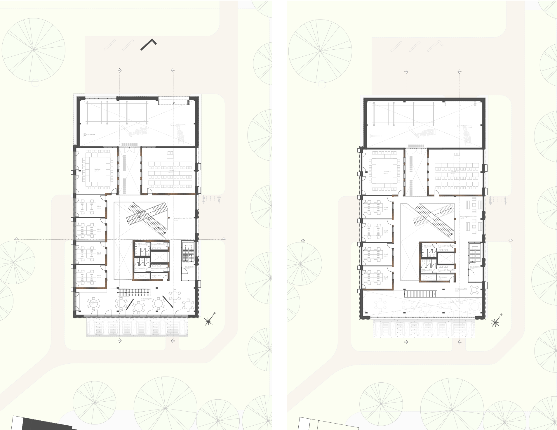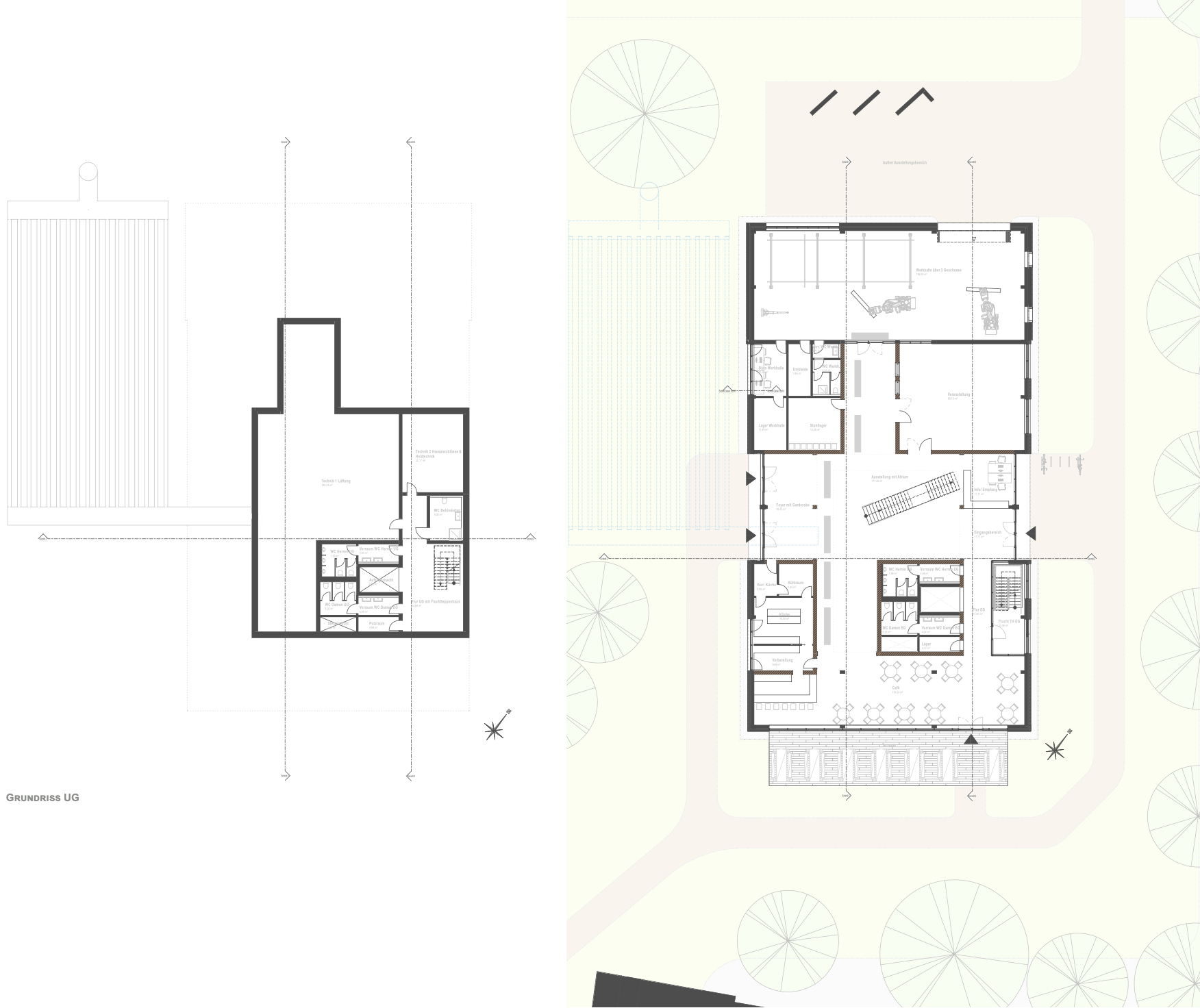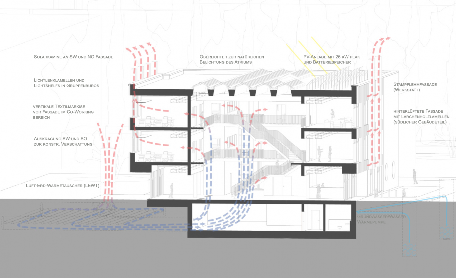 Für die thermische Speichermasse und die damit einhergehende Pufferung der sommerlichen Temperaturspitzen kommen Stampflehmwände und geschliffener Stampflehmfußboden mit Kaseinanstrich zur Anwendung. Der Nachweis des sommerlichen Wärmeschutzes wird für zwei kritische Räume im Bericht aufgeführt. Im Stampflehmfußboden ist eine Flächenheizung integriert, welche für die Wärmeübergabe an die Räume sorgt. Die Stampflehmwände haben zudem positive Auswirkungen auf Haptik und Raumakustik. Im Gebäudeinneren werden die Stirnseiten der Stampflehmwände und deren Stahlbetonstürze jeweils von unbehandelten Fichtenholzzargen eingefasst und betonen somit die Öffnungen in den Stampflehmwänden (vgl. Innenraumperspektive).