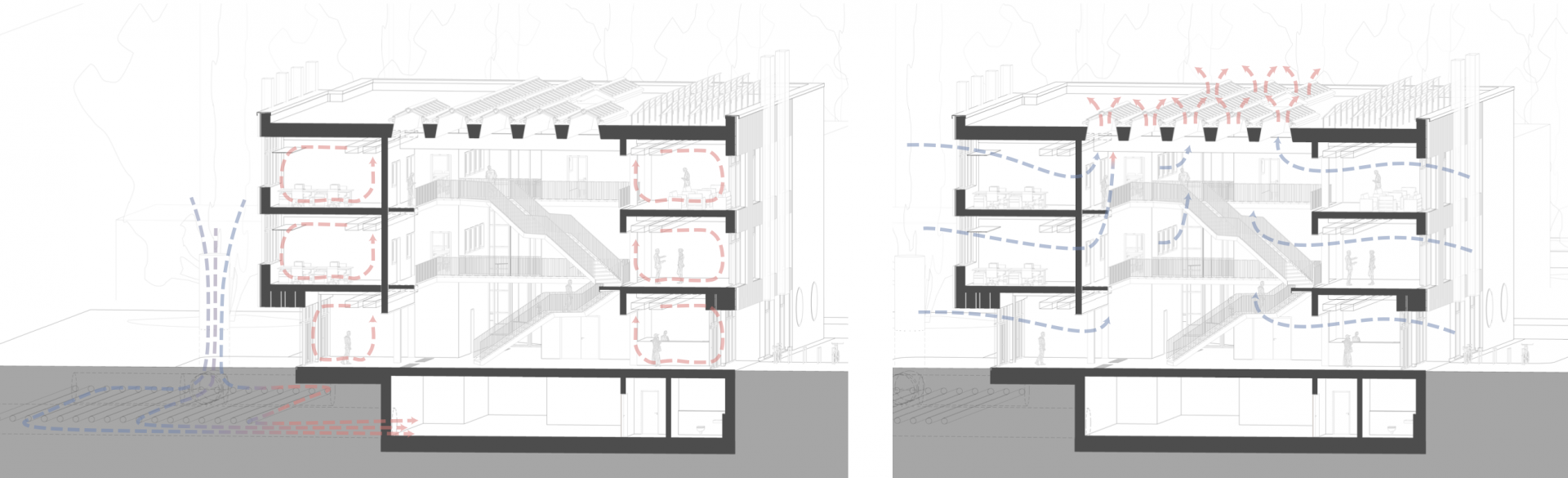 Die Frischluftversorgung wird über einen Luft-Erdwärmetauscher gewährleistet, welcher die Frischluft in den Sommermonaten vorkühlt und in den Wintermonaten vorwärmt. Die für die Sanitär- und Küchenbereiche ganzjährig betriebene zentrale Lüftungsanlage mit Rotationswärmetauscher wird in den übrigen Gebäudeteilen nur in den Wintermonaten eingesetzt, um die Wärmeverluste des Gebäudes möglichst gering zu halten. Details hierzu befinden sich im Berichtsheft als Anlage zum Entwurf.