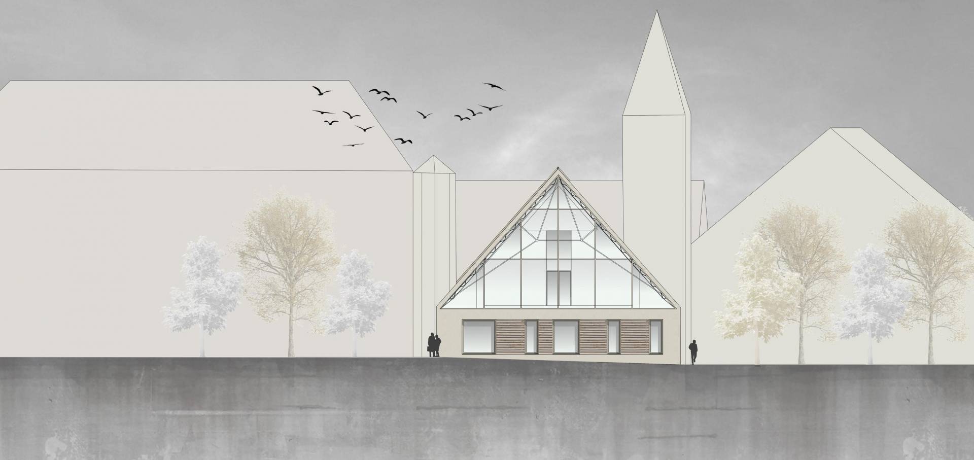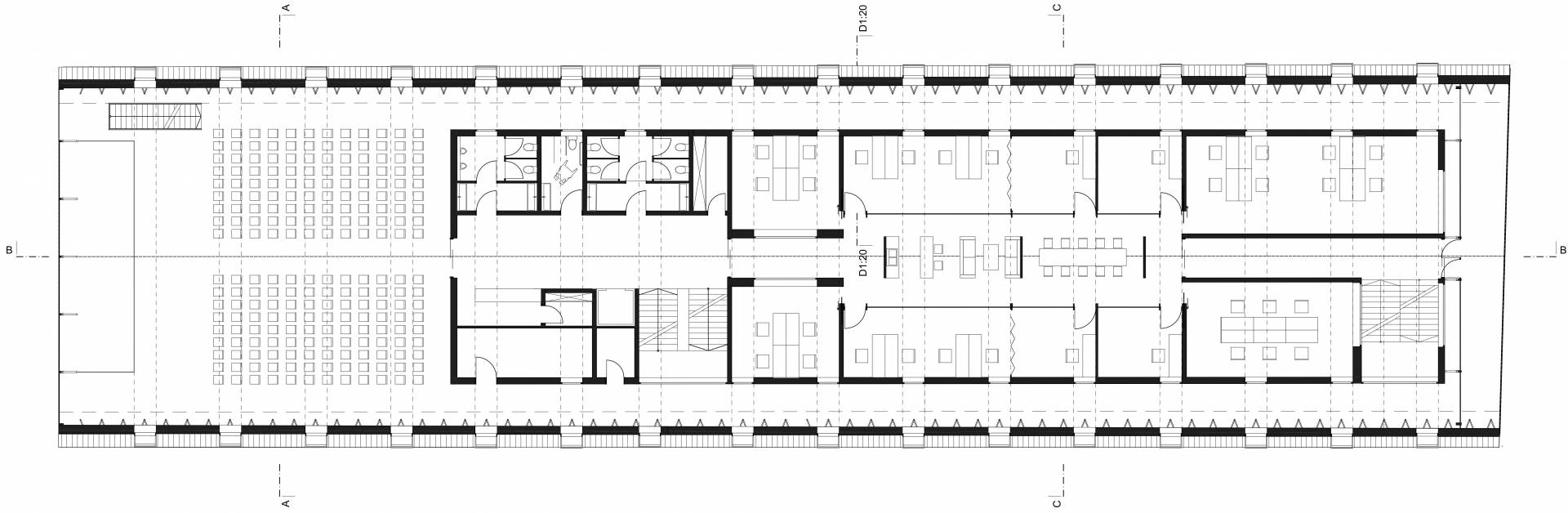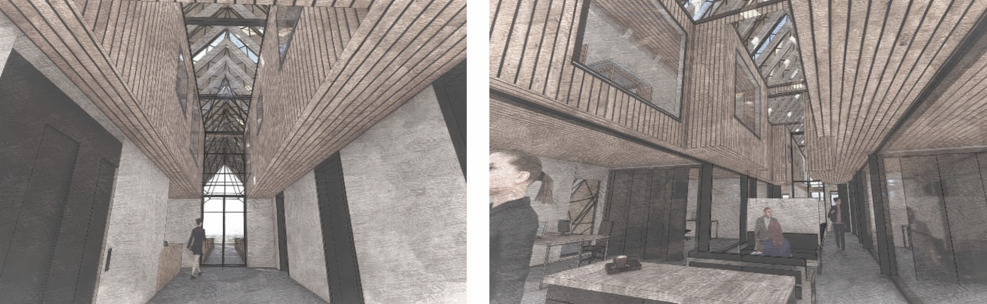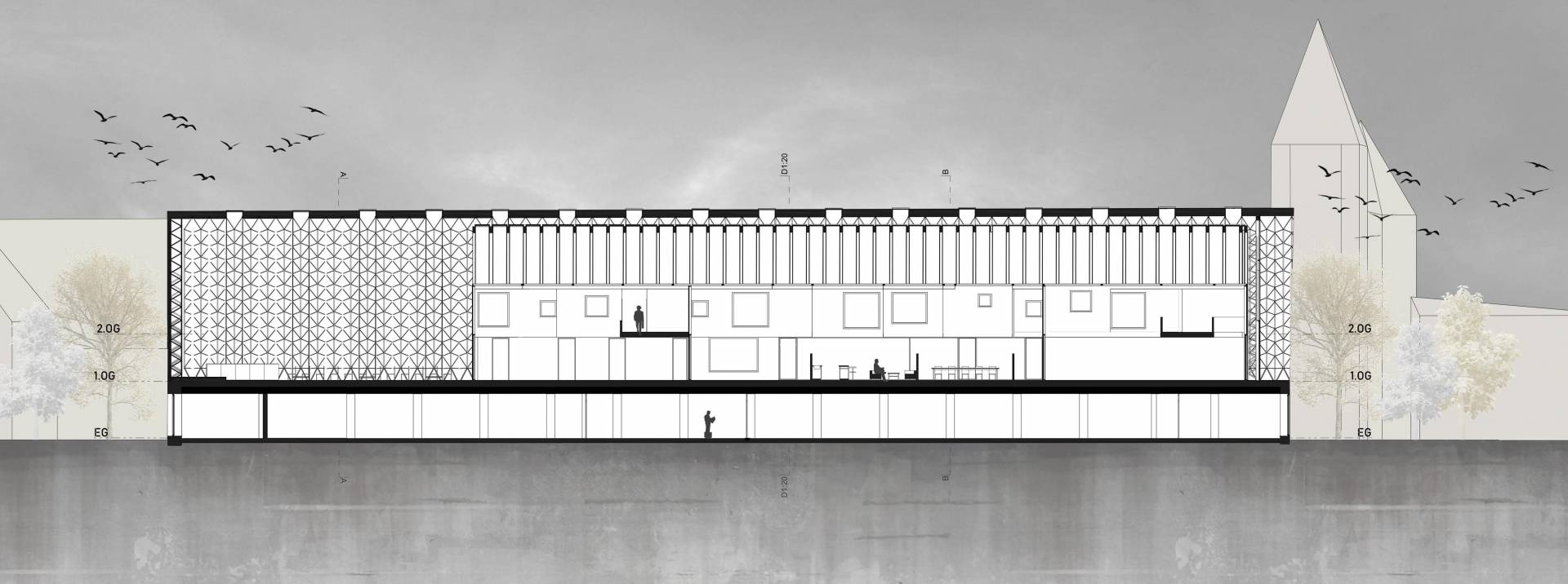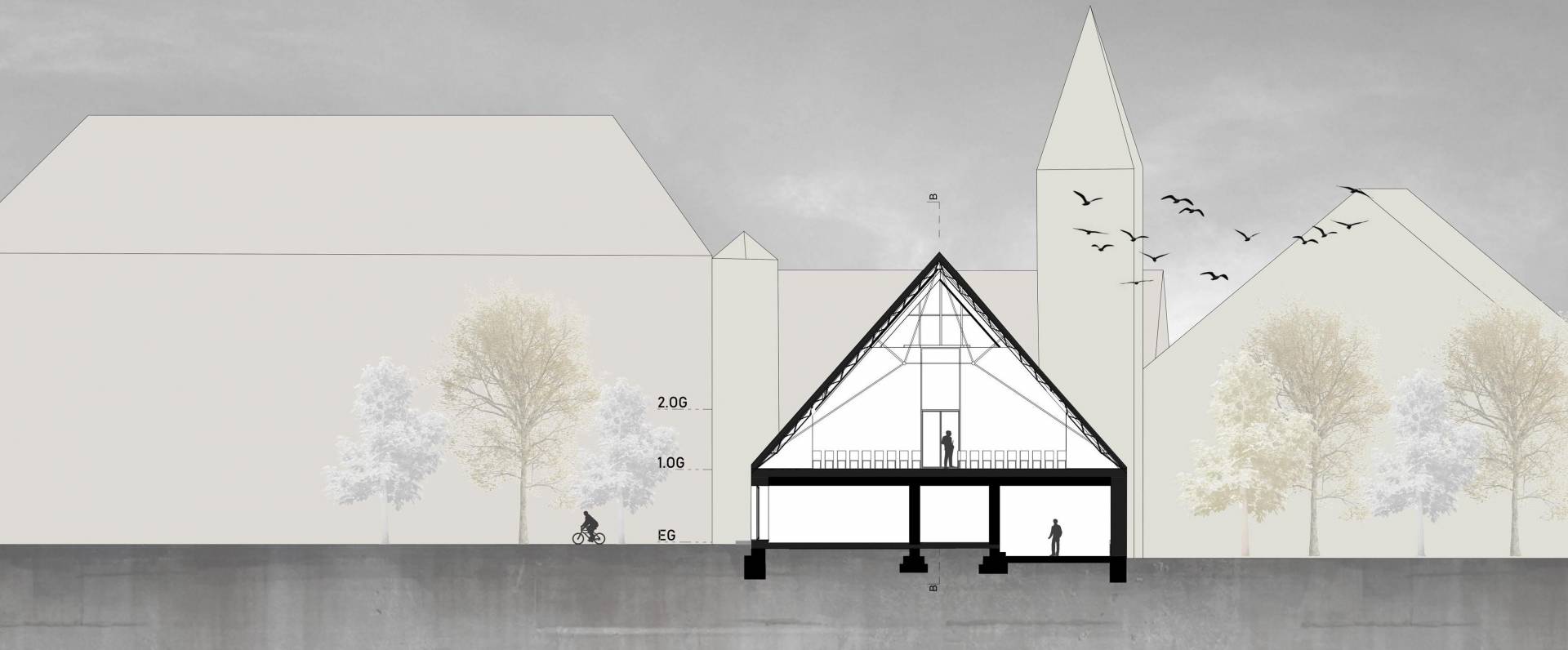 So wird der Veranstaltungsraum als niedrig beheizter kirchenartiger Saal angedacht. Die Räume, welche eine konstante normale Raumtemperatur benötigen, wurden in einer „Haus in Haus“-Lösung untergebracht. Die prägenden Stahlfachwerkträger bleiben erhalten und bilden mitunter das Herzstück des Gebäudes. Es lässt daran erinnern, wie der ungenutzte Abstellraum unter dem Satteldach vorher aussah. Außerdem ergibt sich durch das filigrane Tragwerk und die durchgehenden Lichtbänder ein interessantes Lichtspiel.
