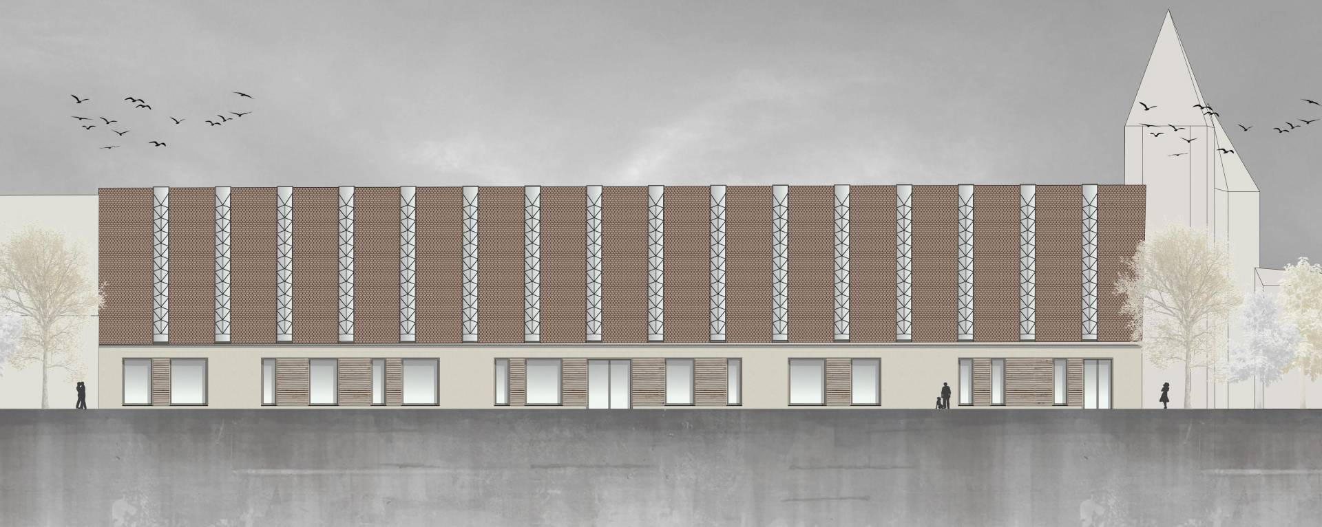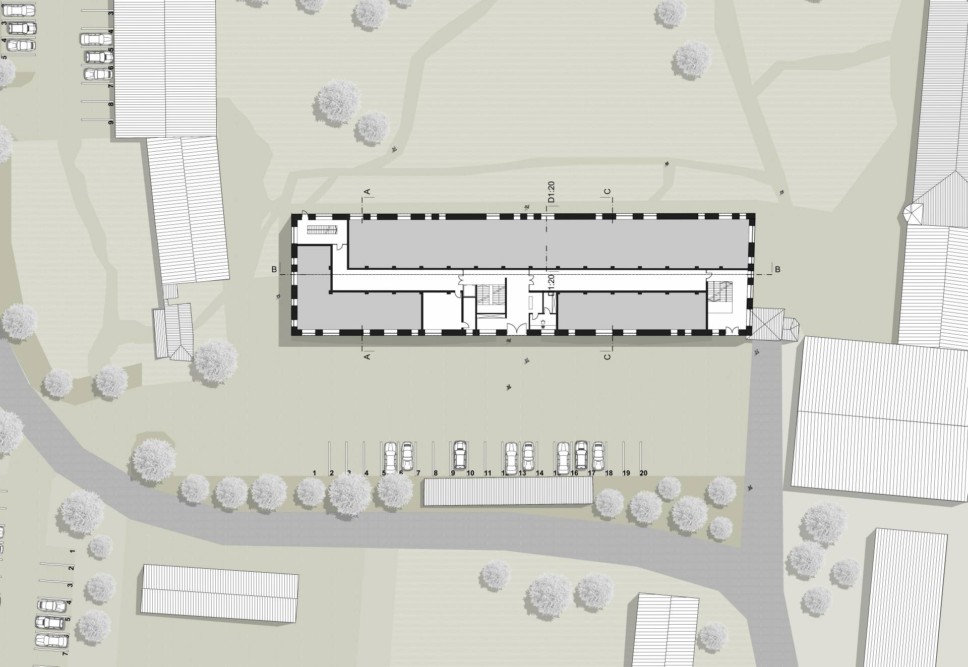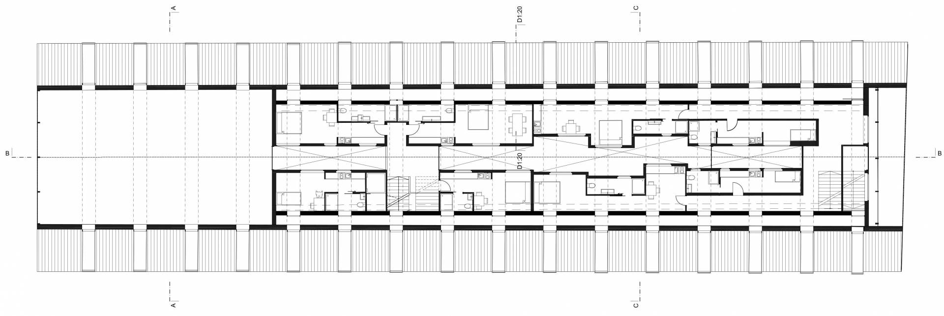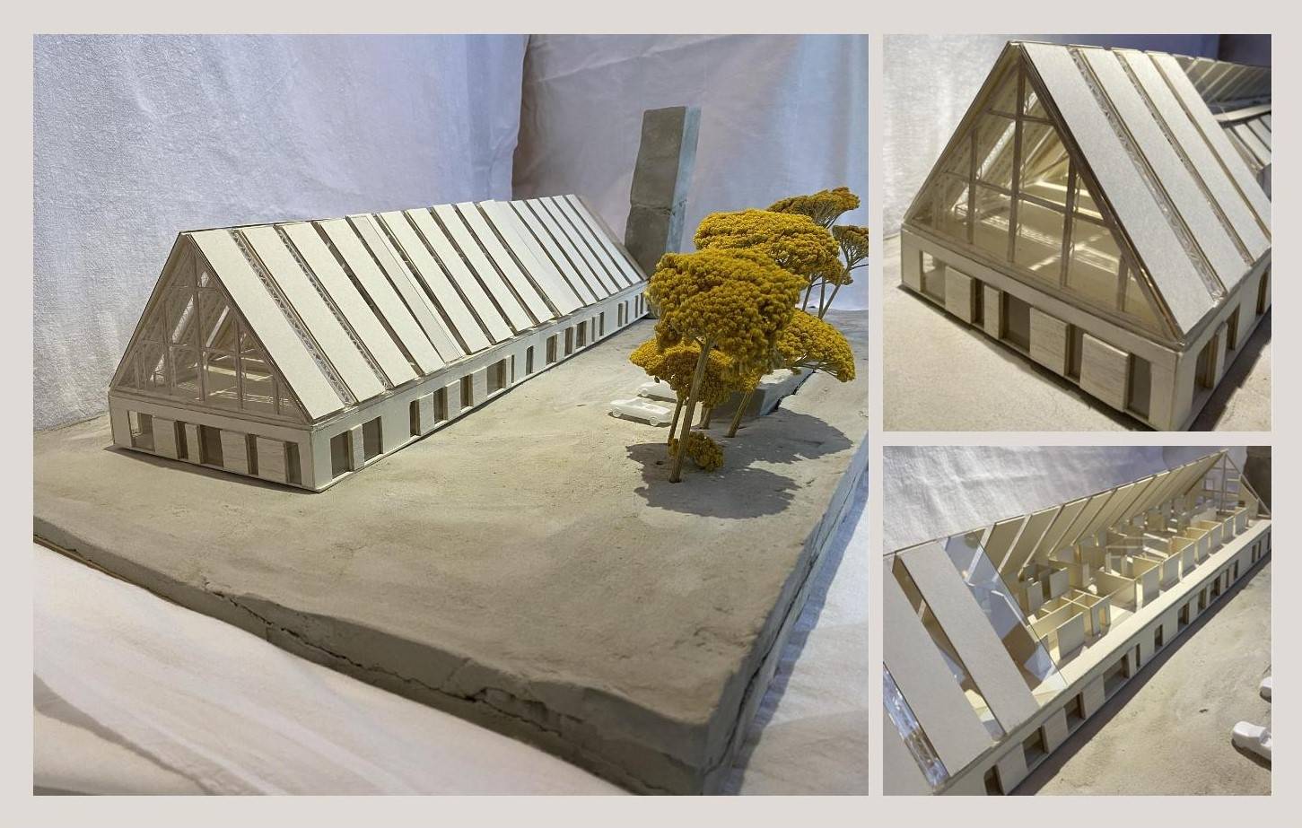 So wird der Veranstaltungsraum als niedrig beheizter kirchenartiger Saal angedacht. Die Räume, welche eine konstante normale Raumtemperatur benötigen, wurden in einer „Haus in Haus“-Lösung untergebracht. Die prägenden Stahlfachwerkträger bleiben erhalten und bilden mitunter das Herzstück des Gebäudes. Es lässt daran erinnern, wie der ungenutzte Abstellraum unter dem Satteldach vorher aussah. Außerdem ergibt sich durch das filigrane Tragwerk und die durchgehenden Lichtbänder ein interessantes Lichtspiel.