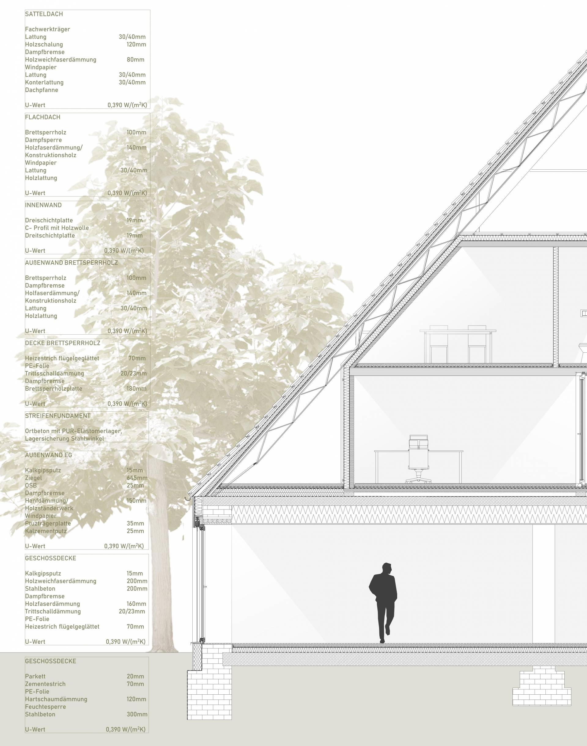 Als Konstruktion des "Haus in Haus" wurde der Holzmodulbau mit tragenden Brettsperrholzelementen gewählt. Der geschliffene Estrich und das Holz sind hierbei maßgebend. Es wird keine Versiegelung oder ähnliches benötigt, da durch den Schutz der Dachhaut diese keiner direkten Witterung ausgesetzt sind. So wird darauf geachtet, dass zu späteren Zeiten alles wieder fast restlos auseinander gebaut werden kann und so gut recycelbar ist.