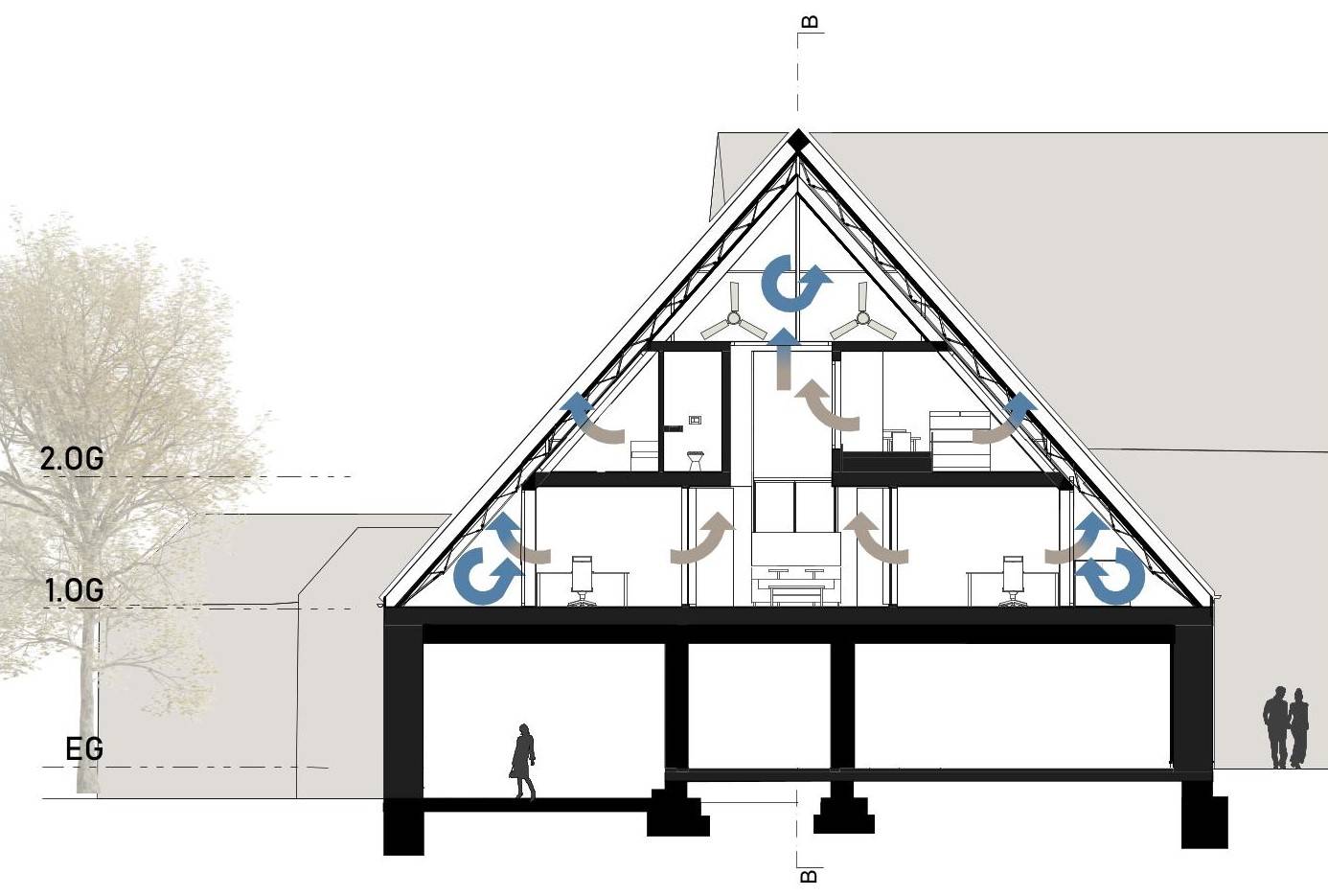 Die natürliche Lüftung und Nachtlüftung im EG findet durch die Fenster in der Außenwand statt. Im OG geschieht dies über den oberen Teil der beiden Giebelwände. Um dies zu unterstützen sind zwei Ventilatoren auf dem Flachdach der "Haus in Haus"- Konstruktion angedacht. So kann im Innenraum des Neubaus die Luft nach "außen" gelüftet werden.