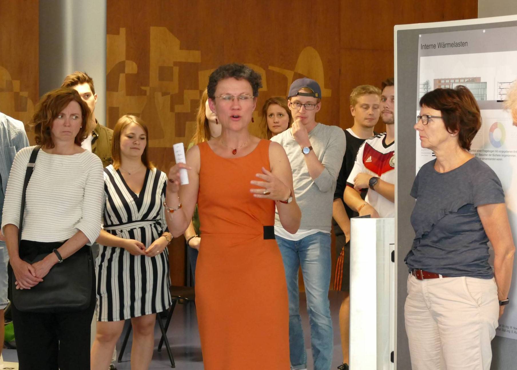 Während der Poster-Präsentation der Projektergebnisse durch die Studierenden stellten die Vertreterinnen und Vertreter der Stadtbücherei Augsburg sowie des Hochbauamts der Stadt Augsburg und des Fachforums Energie tiefer gehende Detailfragen, so dass sich zu jedem Poster eine angeregte Fachdiskussion ergab.