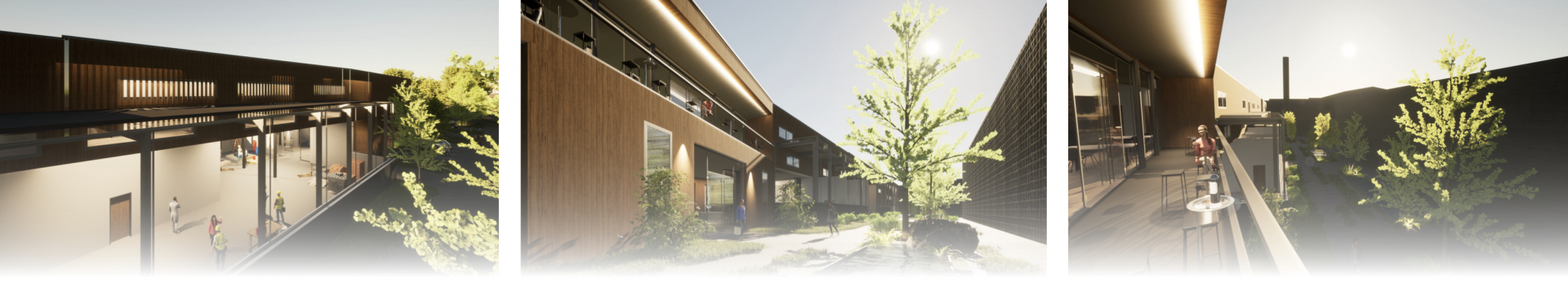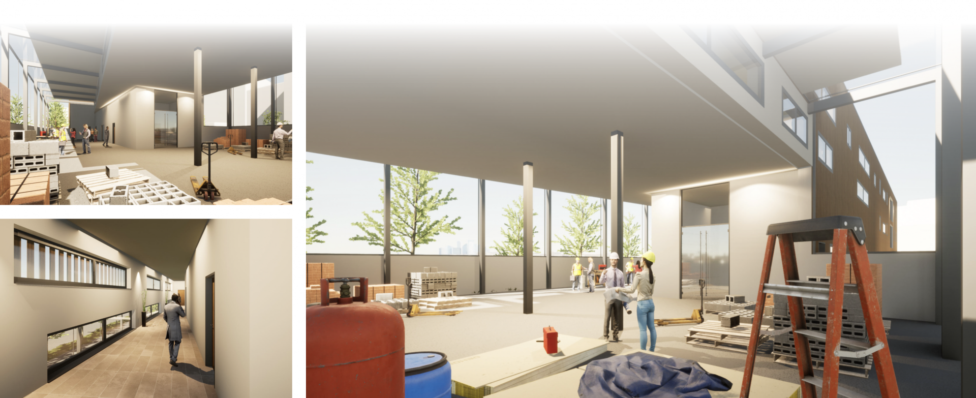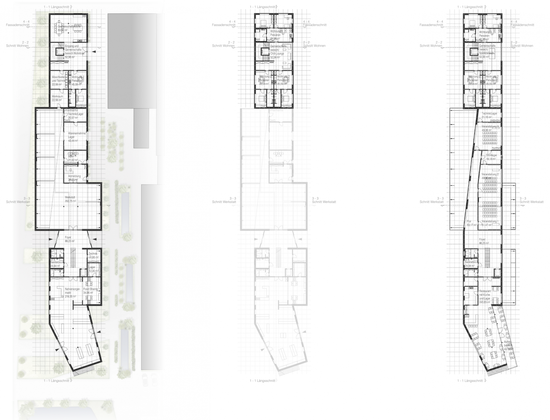 Das Programm umfasst einen Nahversorgungs-Markt für nachhaltig produzierte Lebensmittel, Werkstätten zur Registrierung, Dokumentation und Bearbeitung von Bauteilen im Sinne der Circular Economy, einen flexibel nutzbaren Veranstaltungsraum für Vorträge und Begegnung, ein Café/ Restaurant als weiterer Ort des Austauschs sowie eine heterogene Mischung verschiedener Wohnformen mit vielfältigen Wohnungsgrößen. Hier soll ein Angebot entstehen für ein breites Spektrum an Nutzer:innen (generationenübergreifend, soziale Mischung) mit hohe Flexibilität. Die privaten Wohnflächen werden dabei minimiert zugunsten gemeinschaftlicher Räume, die Wohnungen sind modular und mit hohem Vorfertigungsgrad konzipiert."