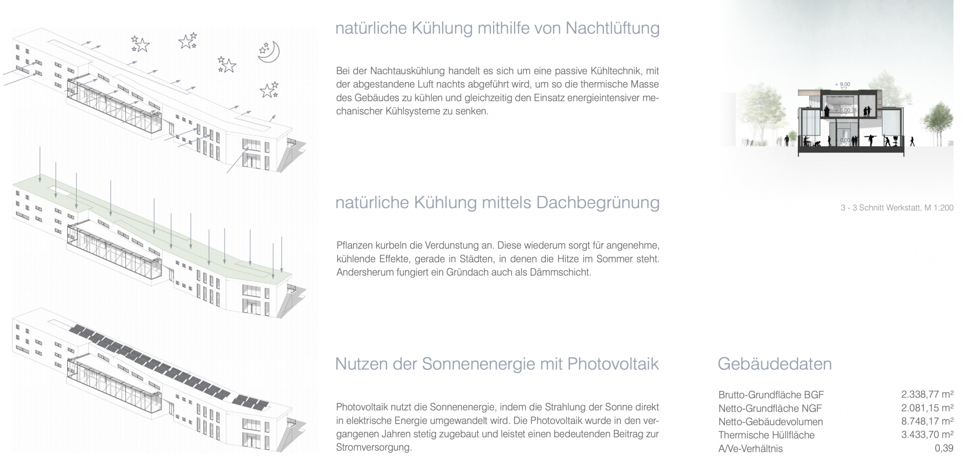 In einem umfangreichen Berichtsheft wurde als Anlage die Themen Bauteilkatalog, Analgentechnik, Tragwerkskonzept, Energiebilanzierung, Ökobilanzierung, sommerlicher Wärmeschutz nach BNK, Tageslichtquotient nach BNK, Barrierefreiheit nach BNK und eine umfangreiche Bewertung des Standortes mithilfe der DGNB Zertifizierungssteckbriefe SITE 1.1, 1.2 und 1.3 nachgewiesen (Mikrostandort, Verkehrsanbindung, Nähe zu nutzungsrelevanten Objekten und Einrichtungen). Diese Inhalte des integralen Entwerfens bilden einen zentralen Teil der Arbeit und wurden iterativ im Entwurf berücksichtigt.