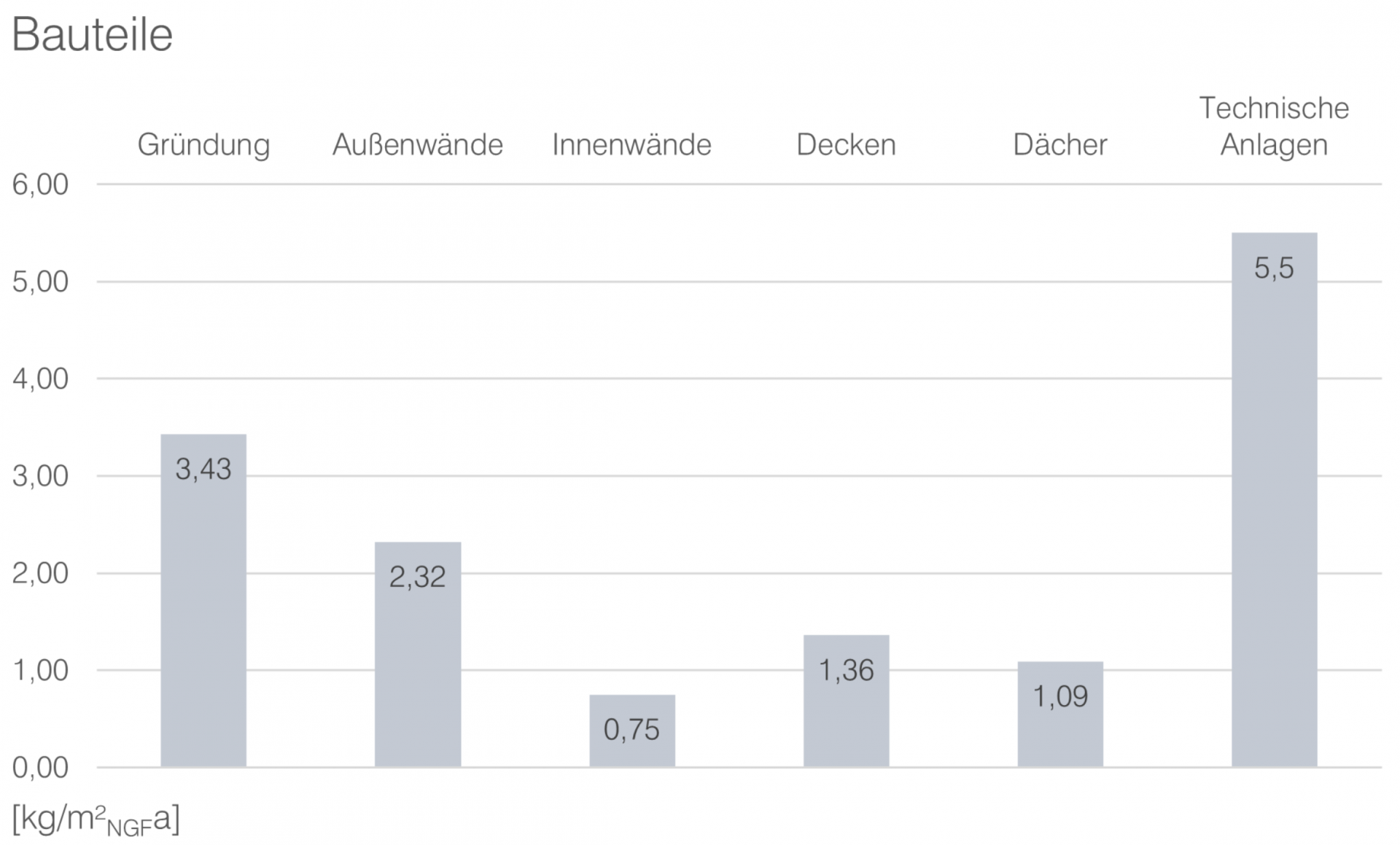 - GWP Global Warming Potential (in kg CO2äquivalent pro m2NGF) Gesamt sowie differenziert nach Konstruktion und Nutzung