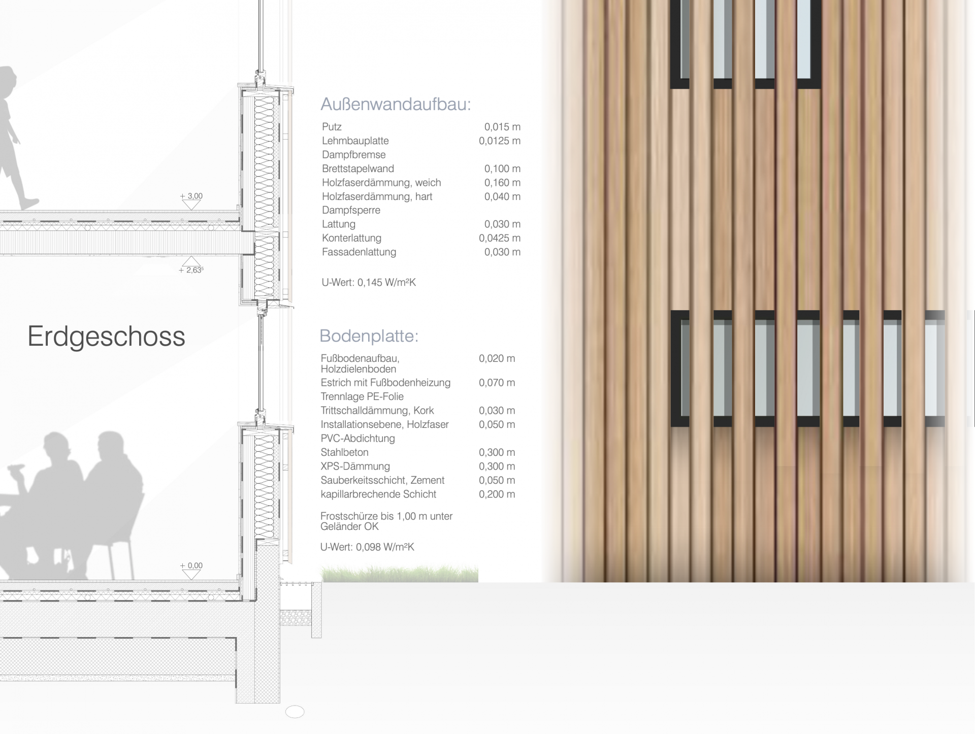 Die Ökobilanzierung mit Ermittlung des Global Warming Potentials, eine kreislaufgerechte Konstruktion mit nachhaltigem Materialeinsatz sowie die Konzeption einer minimierten Gebäudetechnik mit bauphysikalischer Quantifizierung und Optimierung sind integraler Teil des Entwurfsprojekts.