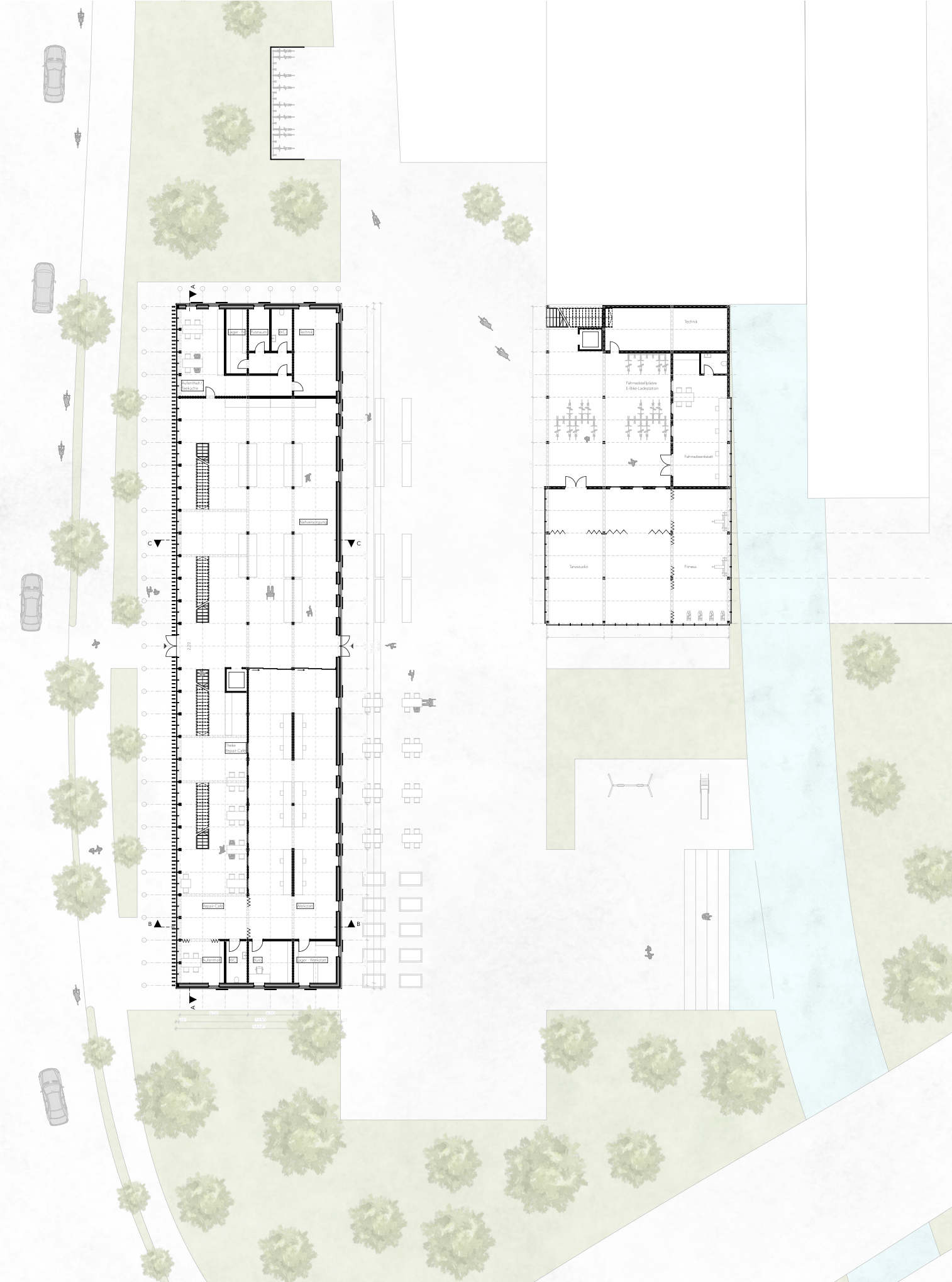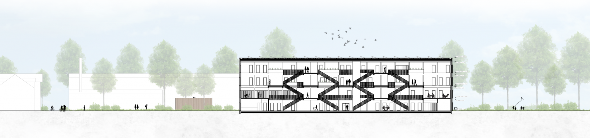 Das Programm umfasst einen Nachversoregungs-Markt für nachhaltig produzierte Lebensmittel, Werkstätten zur Registrierung, Dokumentation und Bearbeitung von Bauteilen im Sinne der Circular Economy, einen flexibel nutzbaren Veranstaltungsraum für Vorträge und Begegnung, ein Café/ Restaurant als weiterer Ort des Austauschs sowie eine heterogene Mischung verschiedener Wohnformen mit vielfältigen Wohnungsgrößen. Hier soll ein Angebot entstehen für ein breites Spektrum an Nutzer:innen (generationenübergreifend, soziale Mischung) mit hohe Flexibilität. Die privaten Wohnflächen werden dabei minimiert zugunsten gemeinschaftlicher Räume, die Wohnungen sind modular und mit hohem Vorfertigungsgrad konzipiert."