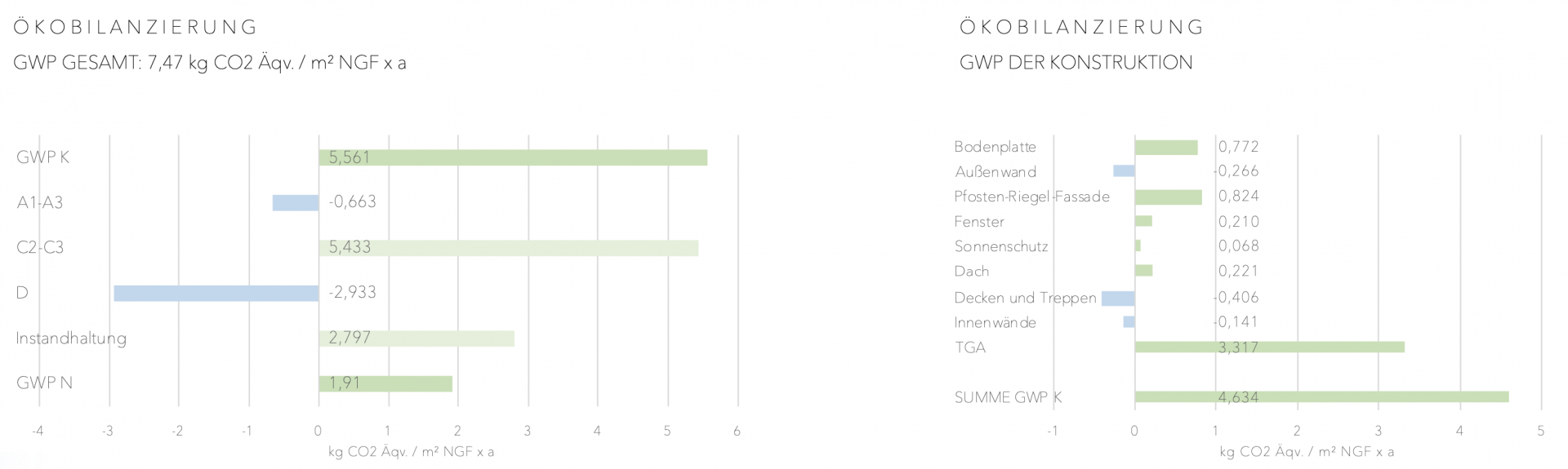 - GWP Global Warming Potential (in kg CO2äquivalent pro m2NGF) der Konstruktion: Differenziert nach AW, DE+TR, DA, BP, FE, IW und TGA und differenziert nach den jeweiligen Modulen A bis D - Standort iund soziale Nachhaltigkeitskriterien: