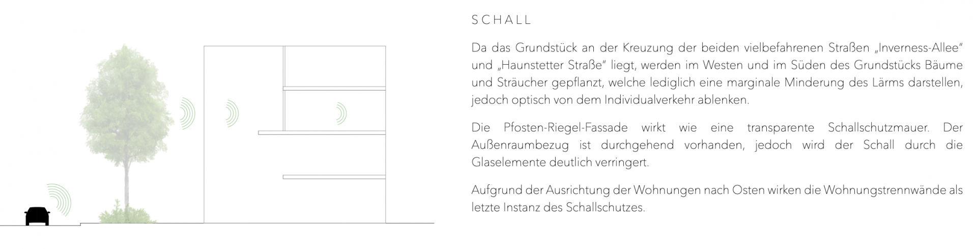 Der Entwurf basiert auf rechteckigen Quadern, welche in horizontalen Schichtungen aufeinander gestapelt werden. Im nächsten Schritt werden kleine, auf das Raster abgestimmt Kuben aus dem Grundelement herausgenommen. Da jedes Geschoss eine individuelle Subtraktion erfährt, entsteht eine stark verspringende, spielende Ausrichtung im Innenbereich. Gleichzeitig bleibt der Kubus zu drei Seiten homogen und ohne Versprünge. Das hat zur Folge, dass der Entwurf als geschlossener Kubus wahrgenommen wird, jedoch im Inneren durch ein stockwerkübergreifendes Konzept und Atrium überzeugt. Die Gebäudeseite zur Haunstetter Straße hin wird vollständig verglast und mit Sonnenschutzlamellen ausgestattet, um den vielfältigen Innenraum auch nach außen hin erlebbar zu machen.