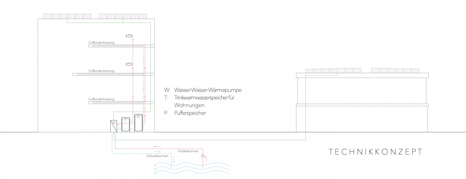 Ein Kernelement der Gebäudetechnik ist die Grundwasser-Wärmepumpe, welche das Grundwasser ansaugt, ihm die Wärme entzieht und anschließend über den sog. Schluckbrunnen wieder zurück geleitet.