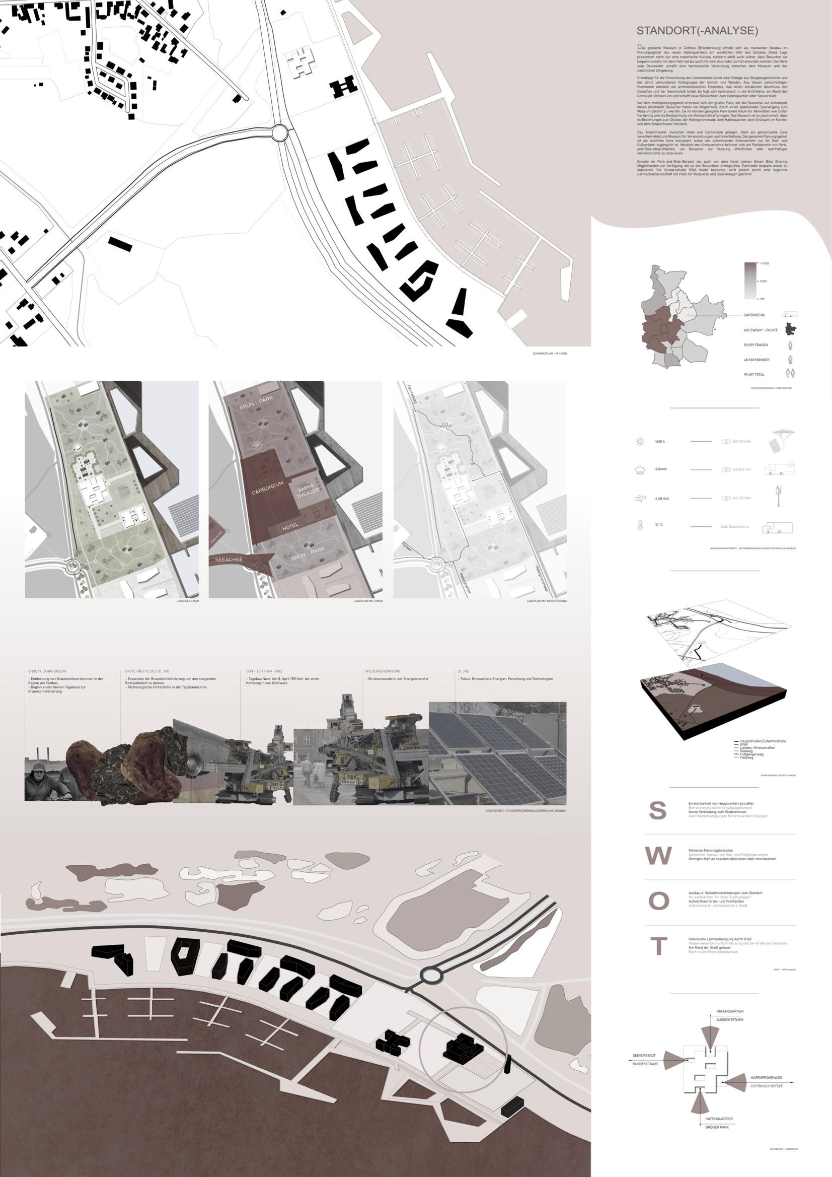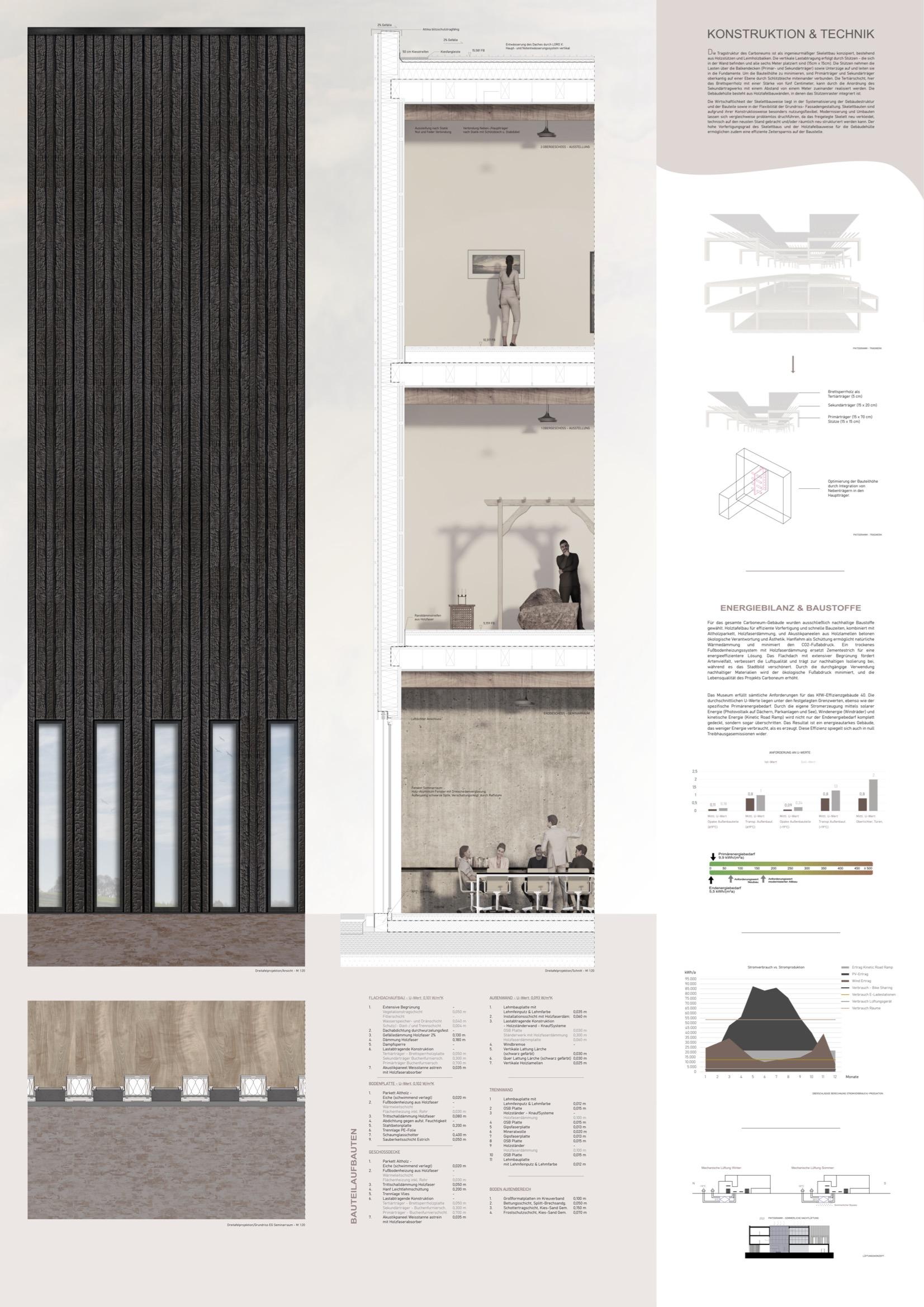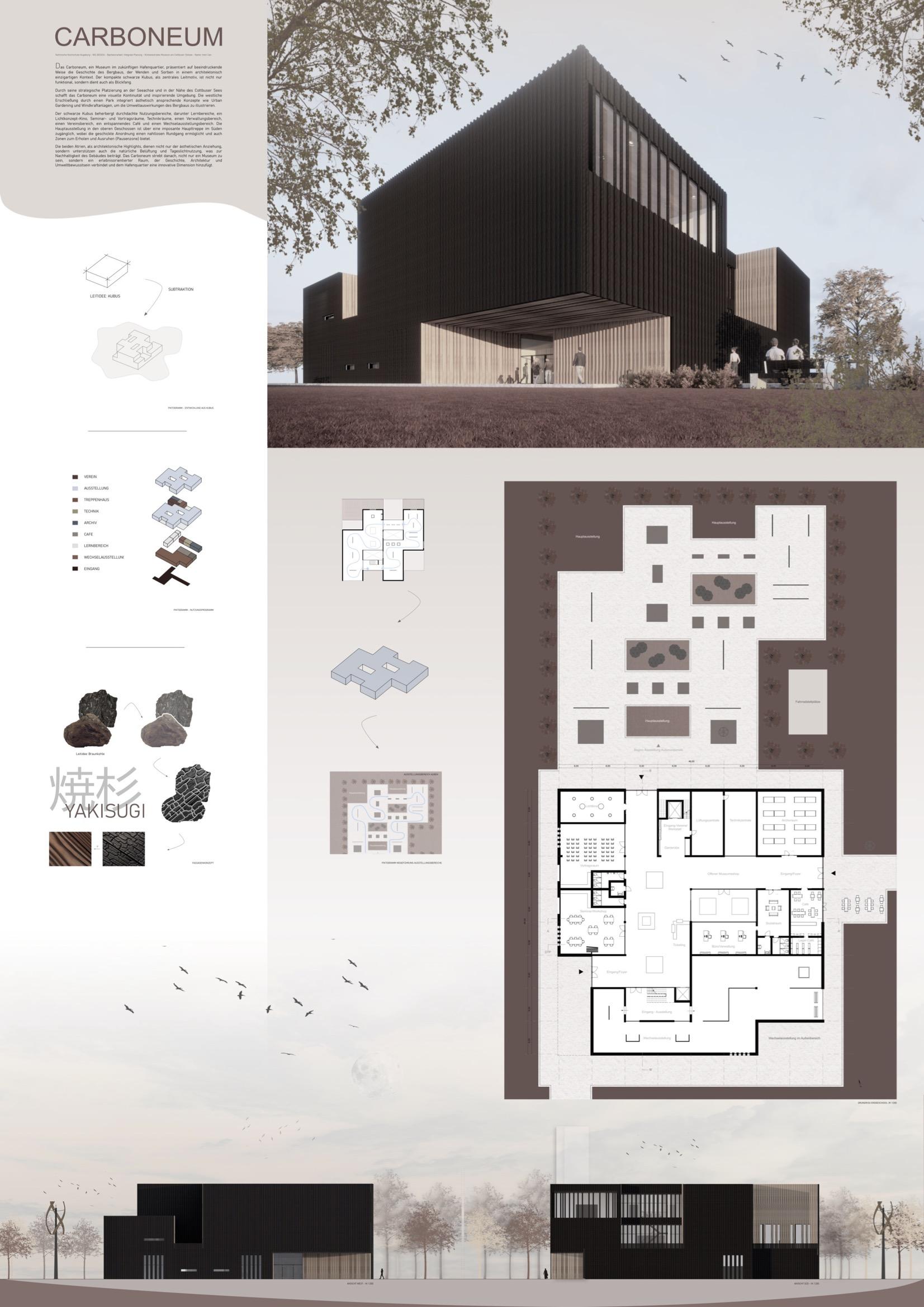Die Abgabeleistungen umfassen eine deskriptive Analyse der Regionalentwicklung, die städtebauliche Einbindung in die vorgesehene Planung des Westufers, ein integriertes Mobilitätskonzept, den Entwurf des Museums Carboneum incl. Konstruktionsdetails, Energie- und Nachhaltigkeits-Bewertung und Optimierung."
