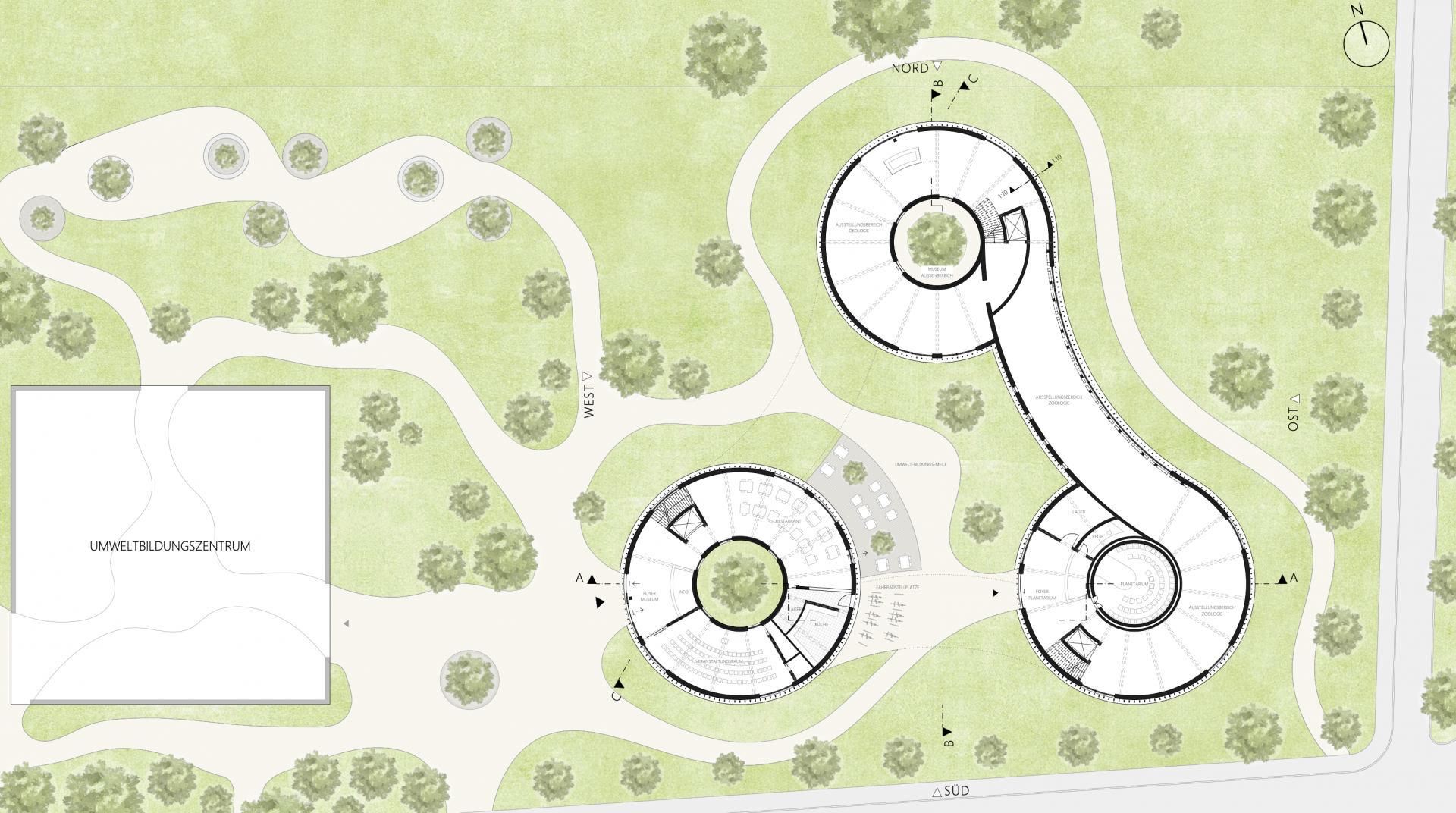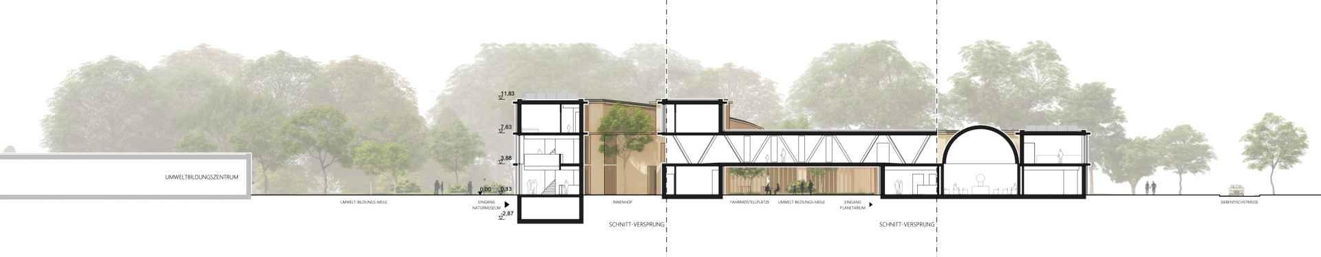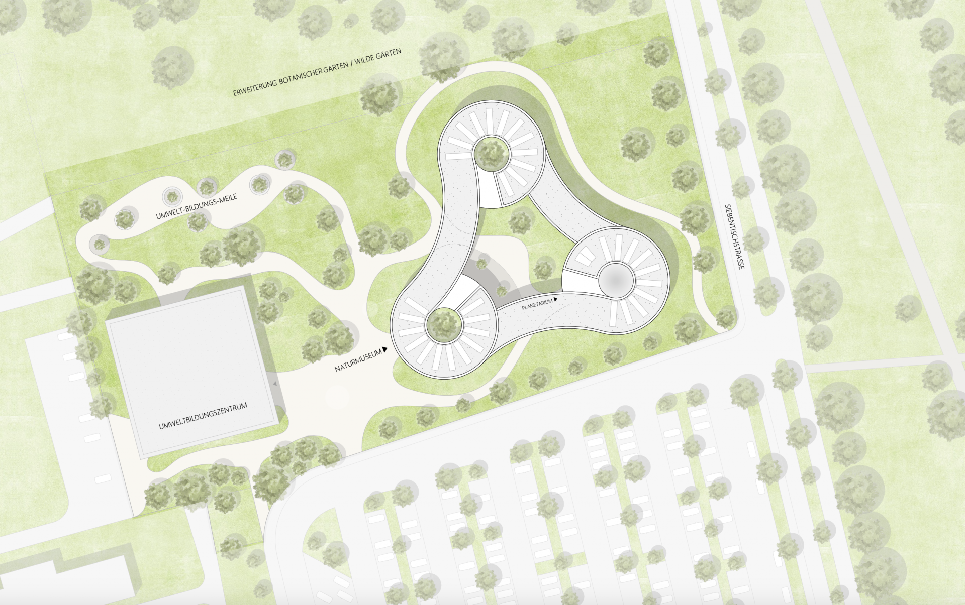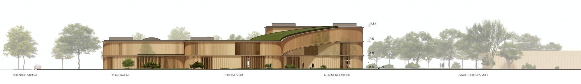 Das neue Naturmuseum mit Planetarium und Sternwarte fügt sich als aktiver Teil der Umwelt-Bildungs-Meile in den Kontext ein. Die Form des Naturmuseums erscheint auf den ersten Blick als Gegensatz zu dem gegenüberliegenden Umweltbildungszentrum mit seiner quadratischer Kubatur. Auf den zweiten Blick und beim Begehen des Weges der „Umwelt-Bildungs-Meile“ jedoch ist der Zusammenhang erkenntlich: Die Formgebung des Naturmuseums greift die organische Gestaltung der nach außen gezogenen Stampflehmwände des UBZ auf. Die Gebäudefluchten an der südlichen Seite ergänzen sich und es entsteht, vom Parkplatz kommend, ein gemeinsamer Platz zur Erschließung beider Gebäude.