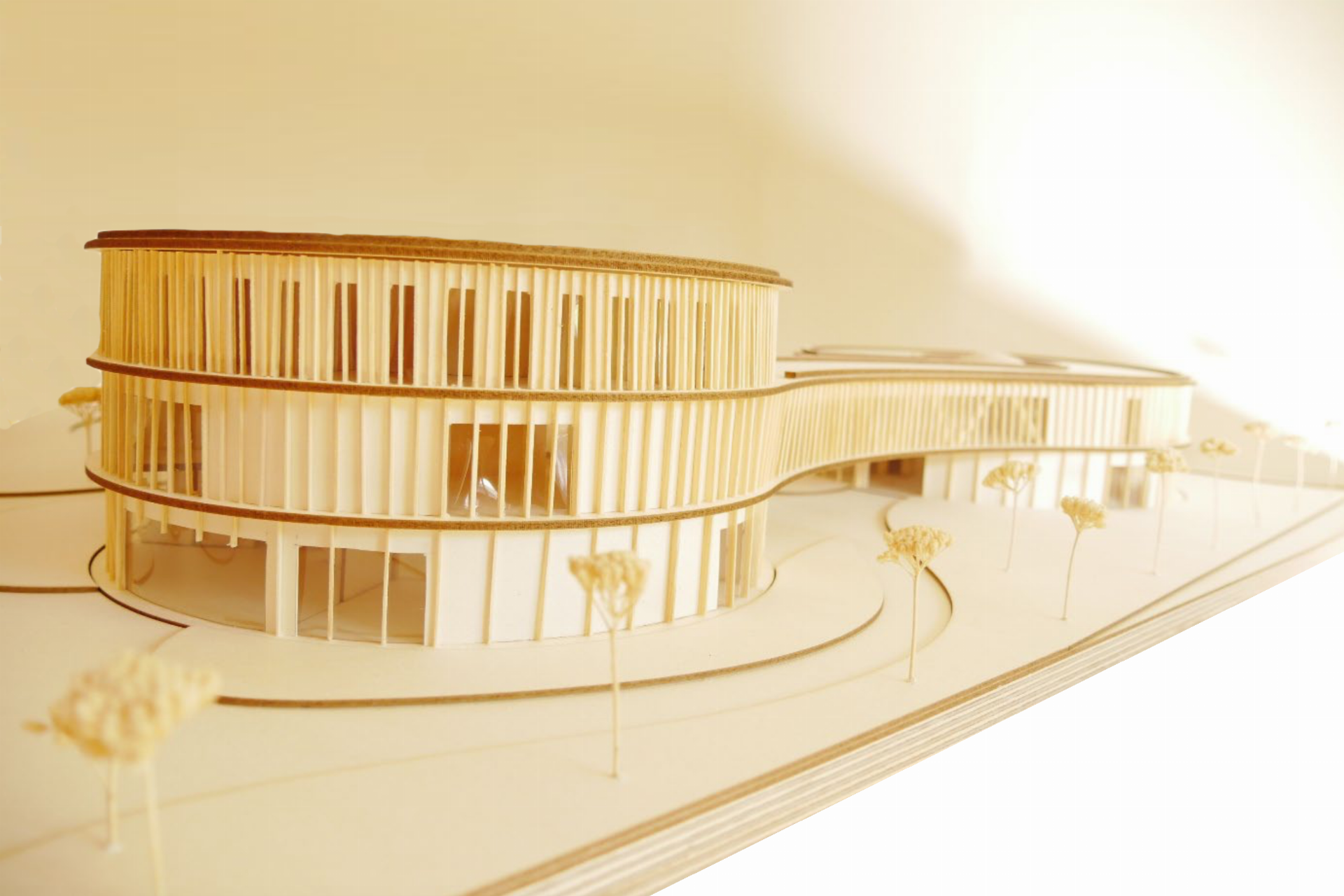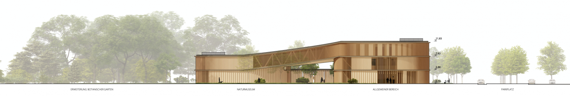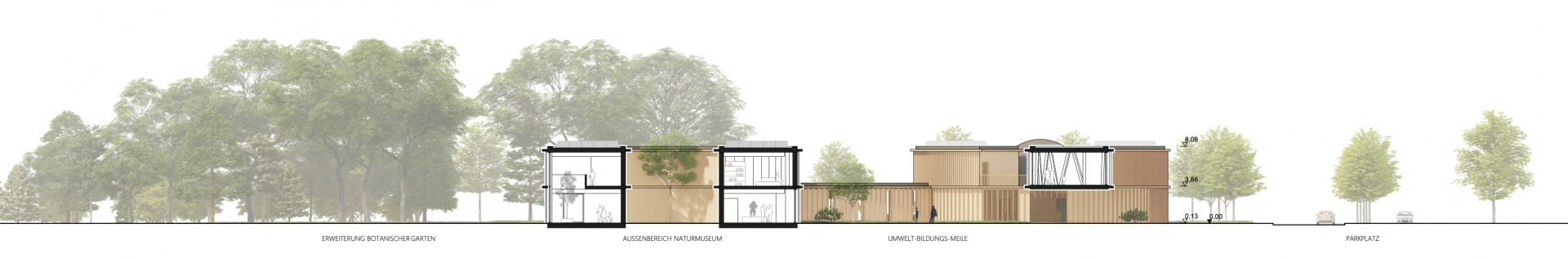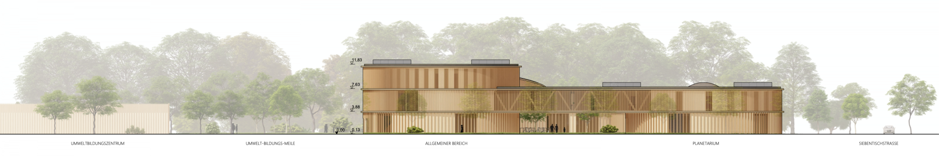 Das neue Naturmuseum mit Planetarium und Sternwarte fügt sich als aktiver Teil der Umwelt-Bildungs-Meile in den Kontext ein. Die Form des Naturmuseums erscheint auf den ersten Blick als Gegensatz zu dem gegenüberliegenden Umweltbildungszentrum mit seiner quadratischer Kubatur. Auf den zweiten Blick und beim Begehen des Weges der „Umwelt-Bildungs-Meile“ jedoch ist der Zusammenhang erkenntlich: Die Formgebung des Naturmuseums greift die organische Gestaltung der nach außen gezogenen Stampflehmwände des UBZ auf. Die Gebäudefluchten an der südlichen Seite ergänzen sich und es entsteht, vom Parkplatz kommend, ein gemeinsamer Platz zur Erschließung beider Gebäude.
