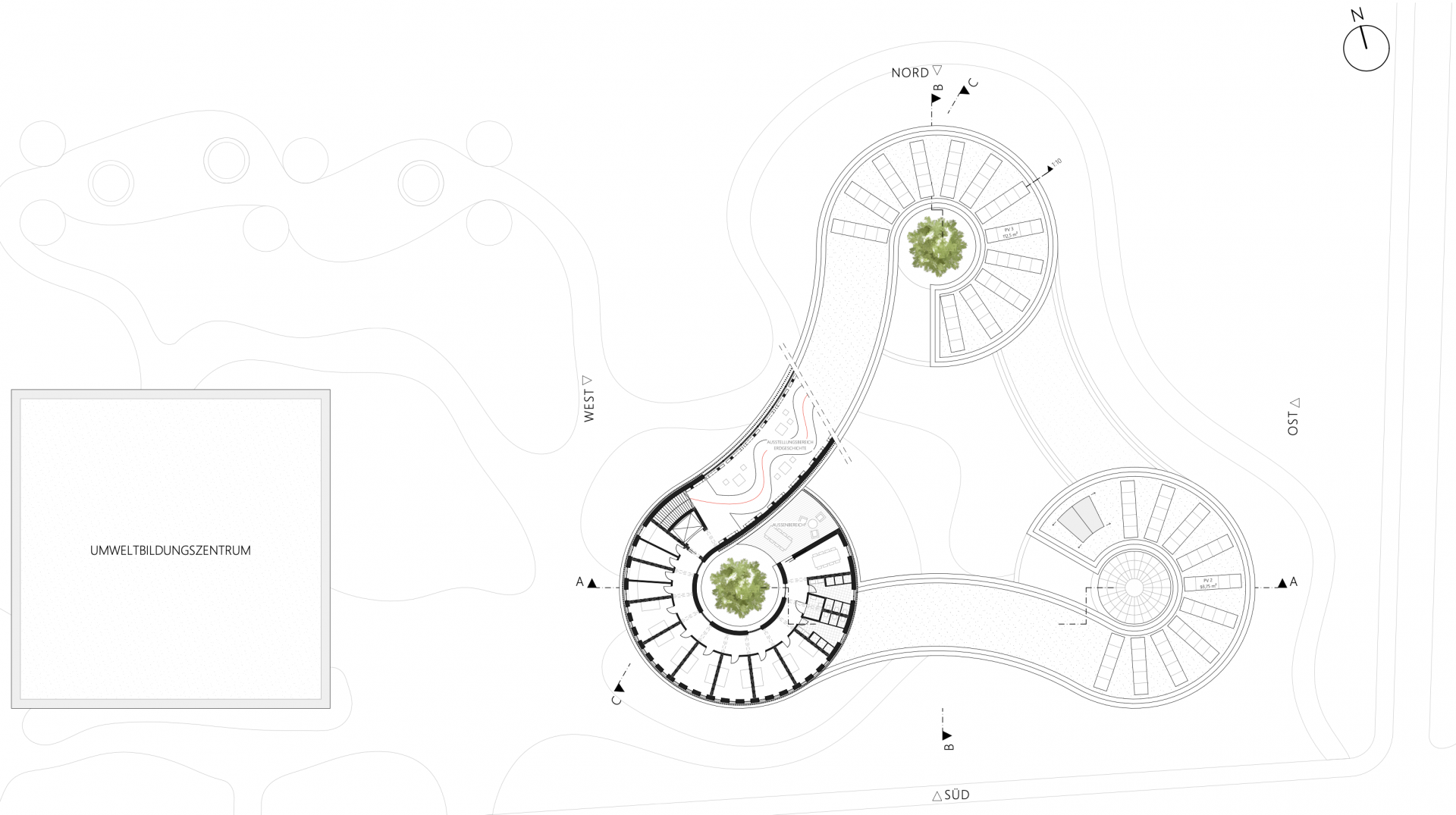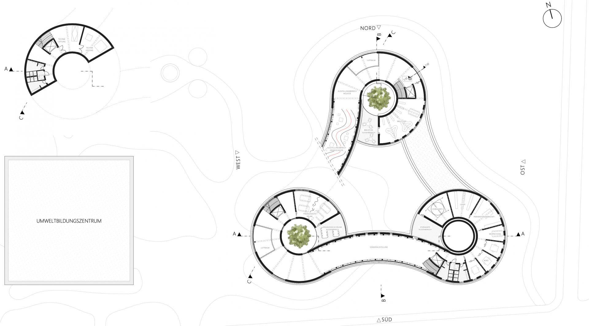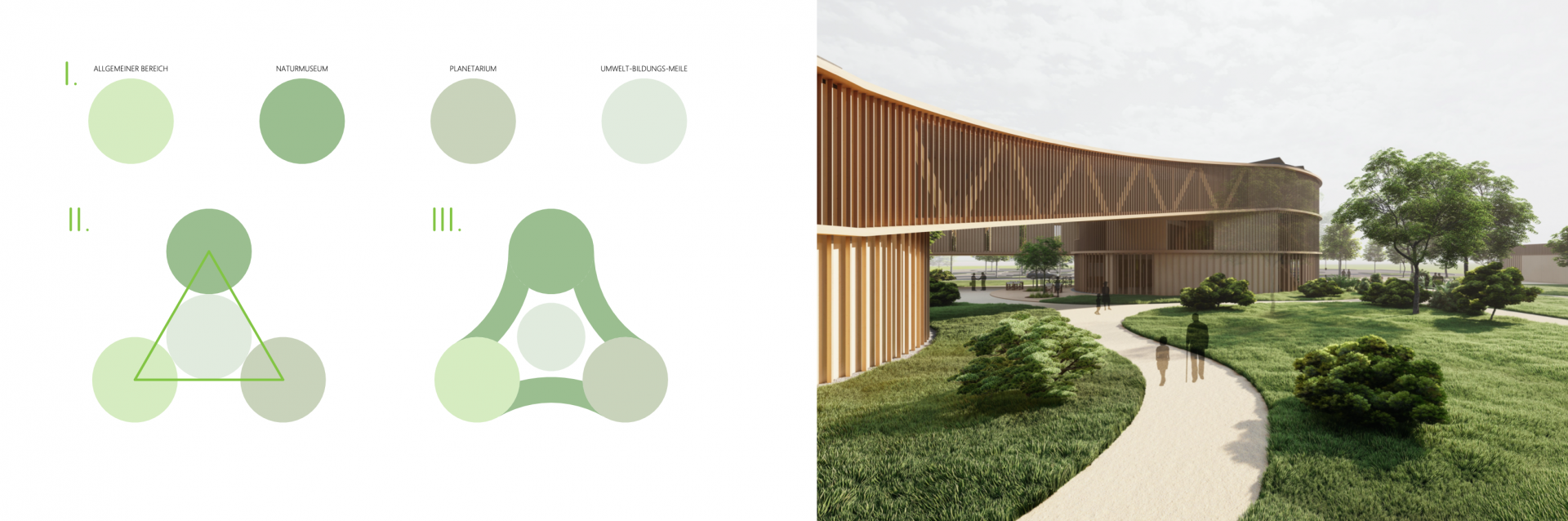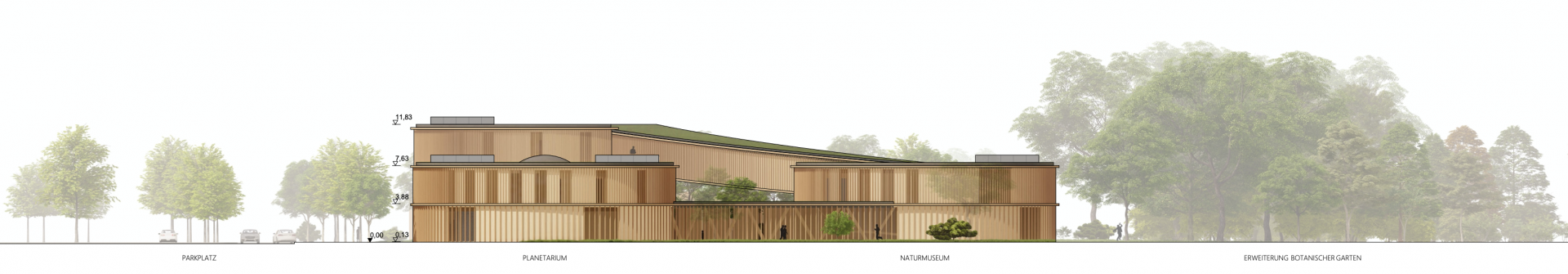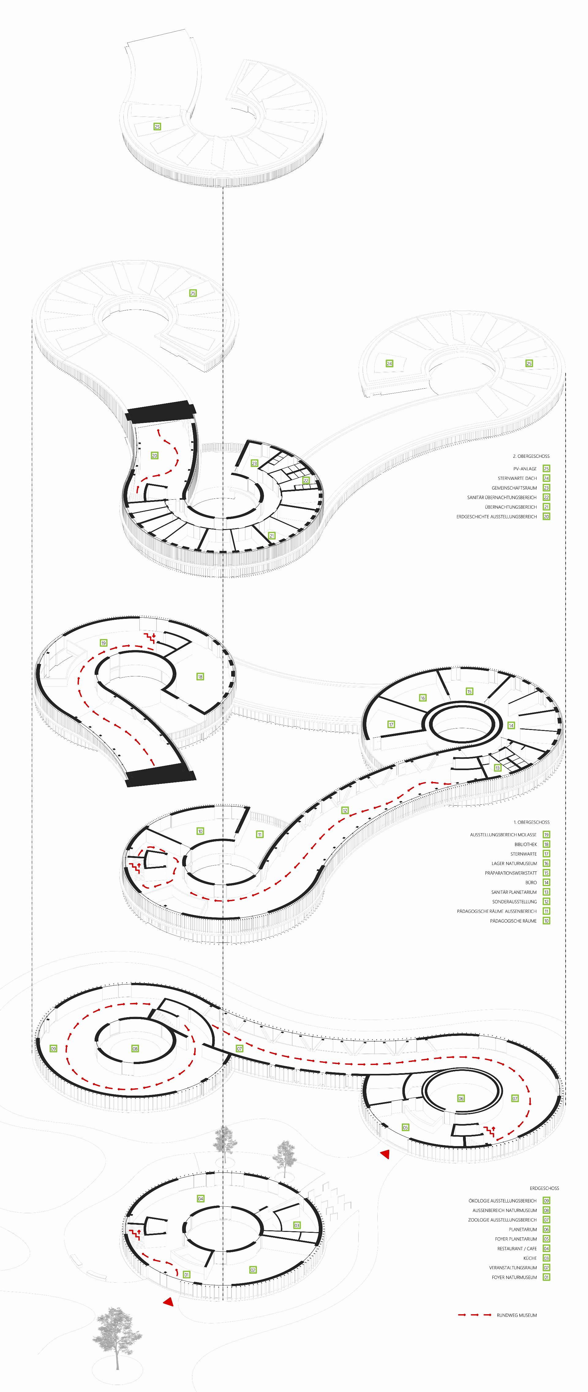 Die Entwurfsidee des neuen Gebäudes ist daraus entstanden, die drei Hauptnutzungen - den allgemeinen Bereich mit Foyer, das Naturmuseum und das Planetarium - in eigenständige Zylindern als Eckpunkte eines gleichschenkligen Dreiecks anzuordnen. Die einzelnen Körper wiederum werden auf unterschiedlichen Höhenebenen miteinander verbunden.