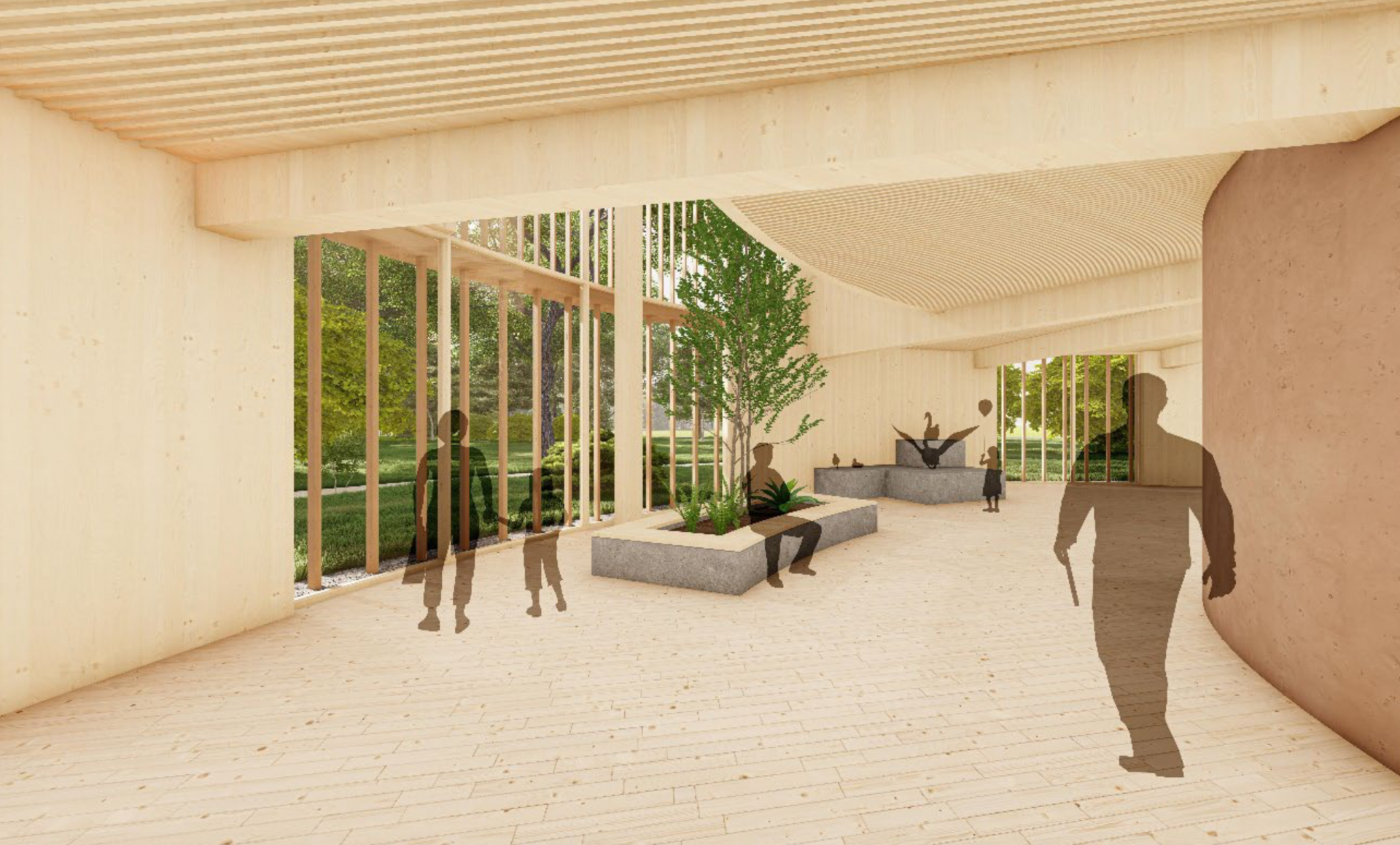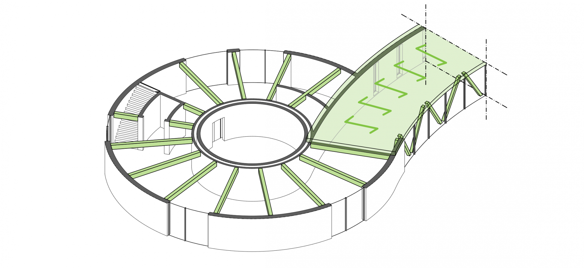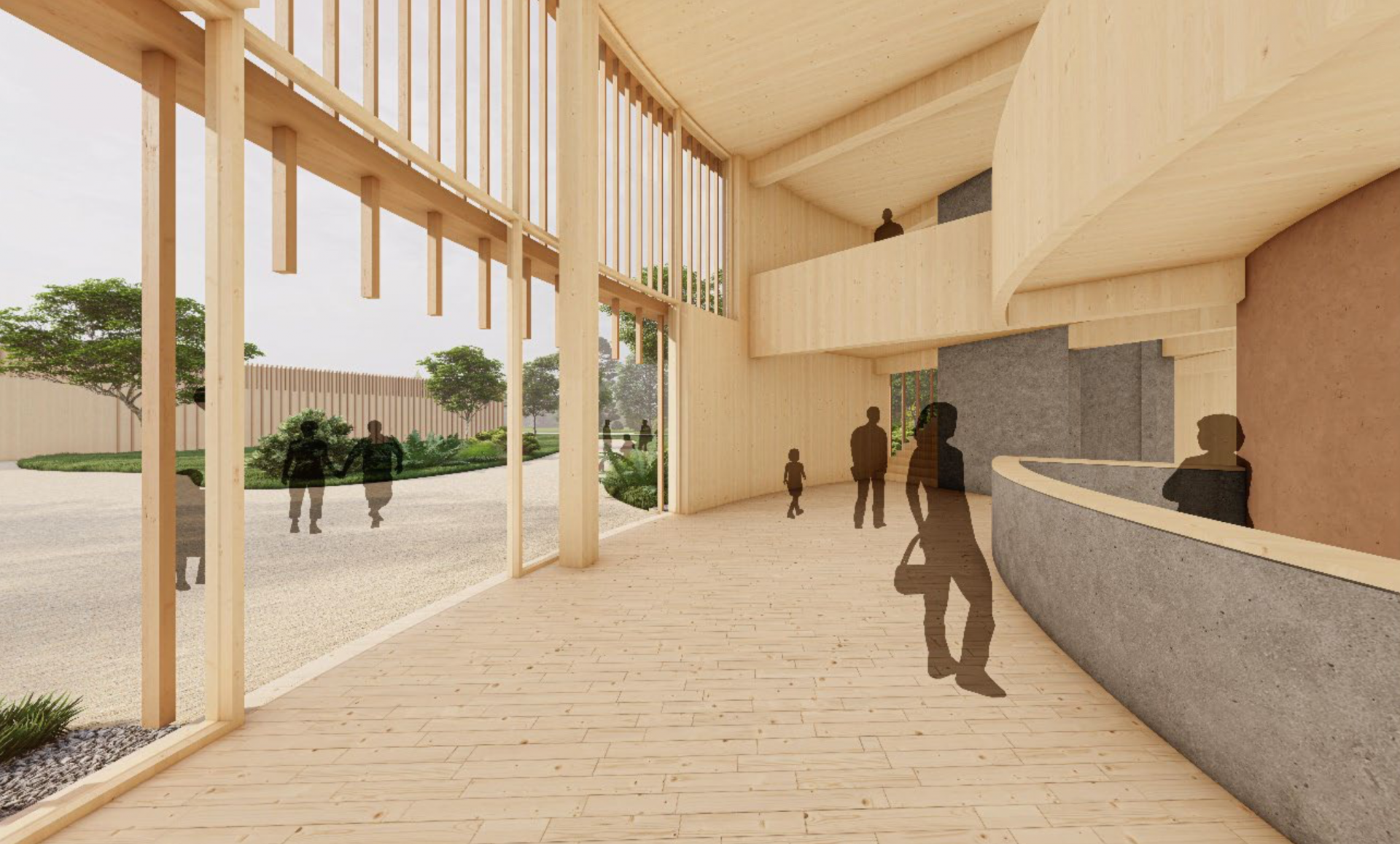 Es entsteht ein Freiraum in der Mitte, der genau so groß ist, dass ein weiterer Zylinder derselben Größe hineinpassen würde. Dieser Bereich dient als Außenfläche der Gastronomie und ist eingebunden als Teil der Umwelt-Bildungs-Meile. Dort können temporäre Außenausstellungen und Veranstaltungen zu den Themen Ökologie und Umwelt stattfinden. Die Wegeführung um das Gebäude betont dessen Bauform.