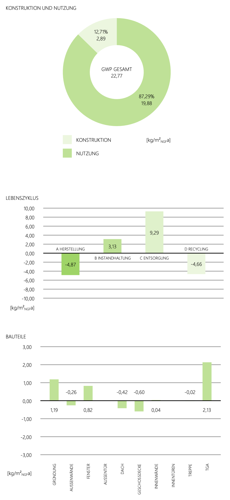 - GWP Global Warming Potential (in kg CO2äquivalent pro m2NGF) Gesamt sowie differenziert nach Konstruktion und Nutzung