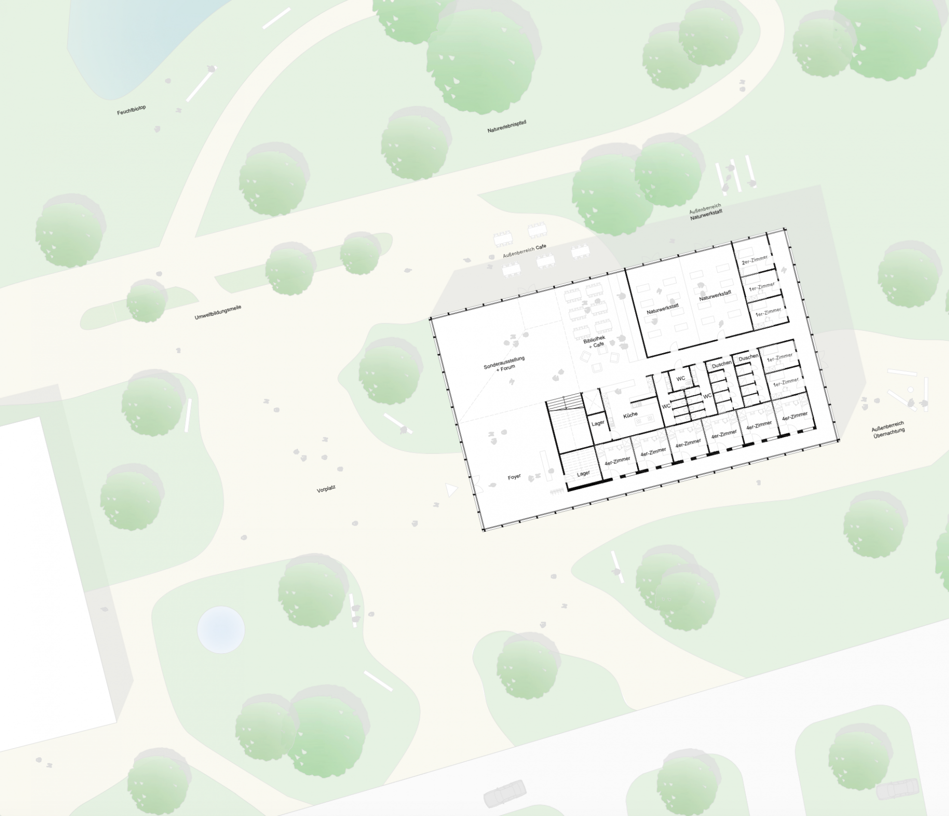 Das Gebäude ist auf dem Grundstück so verortet, dass sich ein großer öffentlicher Platz zwischen dem Umweltbildungszentrum und dem Neubau des Umweltmuseums ausbildet. Durch die Gebäudeform, Verortung des Gebäudes und Außenraumgestaltung entsteht ein stimmiges Gesamtensemble. Die Freiflächen sind gespickt mit „grünen Inseln“, die zum Verweilen einladen und mit den orthogonalen Baukörpern des Umweltbildungszentrums und Umweltmuseums brechen. Dadurch entsteht eine freie Wegeführung, die auf den zentralen Vorplatz der Umweltbildungsmeile mündet.