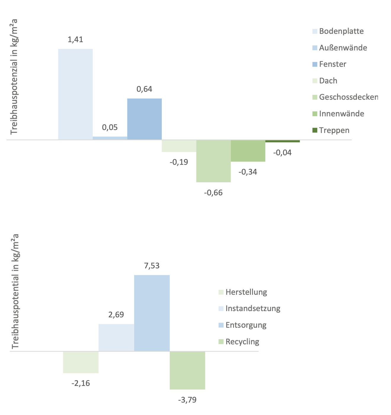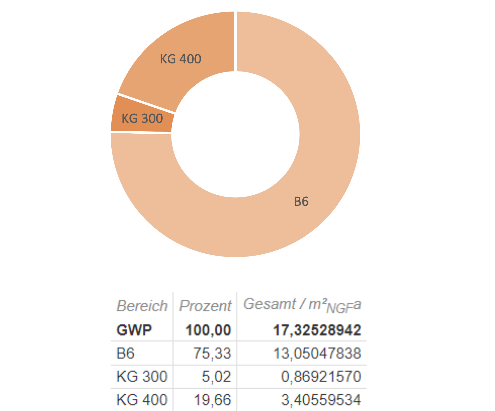 - GWP Global Warming Potential (in kg CO2äquivalent pro m2NGF) Gesamt sowie differenziert nach Konstruktion und Nutzung