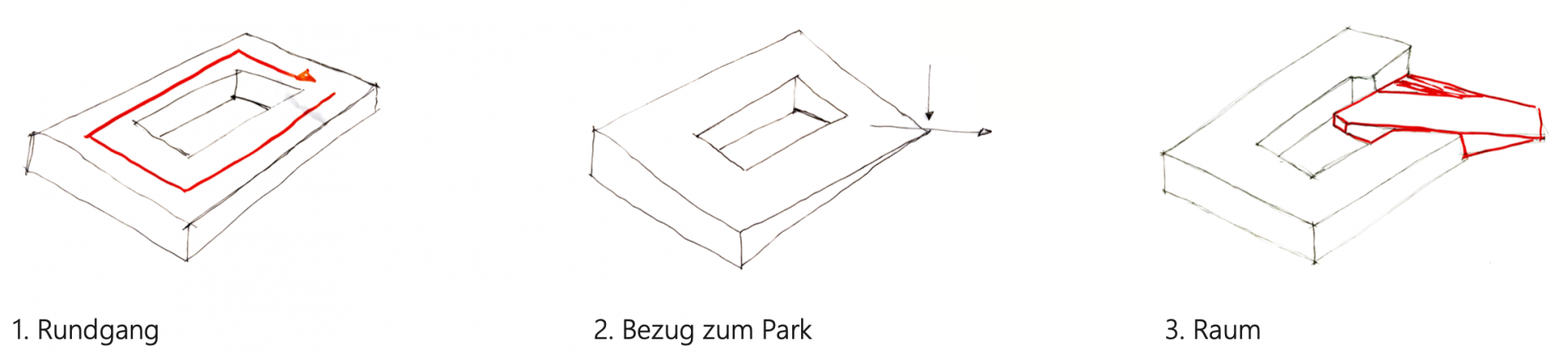 Zentral bei der Entwurfsfindung des neuen Naturmuseums in Augsburg ist der Erlebnisrundweg. Dieser startet und endet im Foyer am Haupteingang auf der Westseite gegenüber des Umweltbildungszentrums. Um den idealen Rundweg herzustellen bietet sich eine Innenhoftypologie an.
