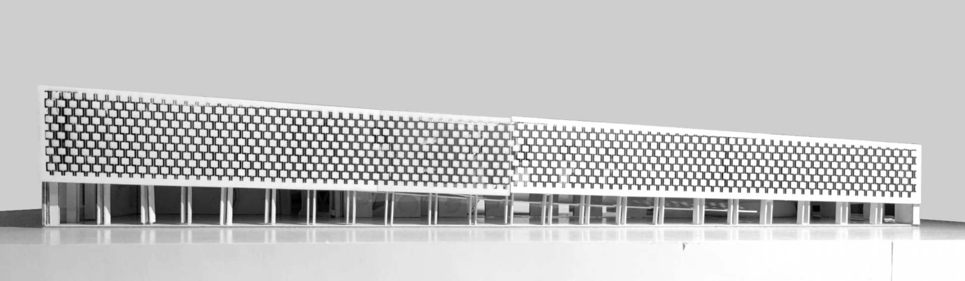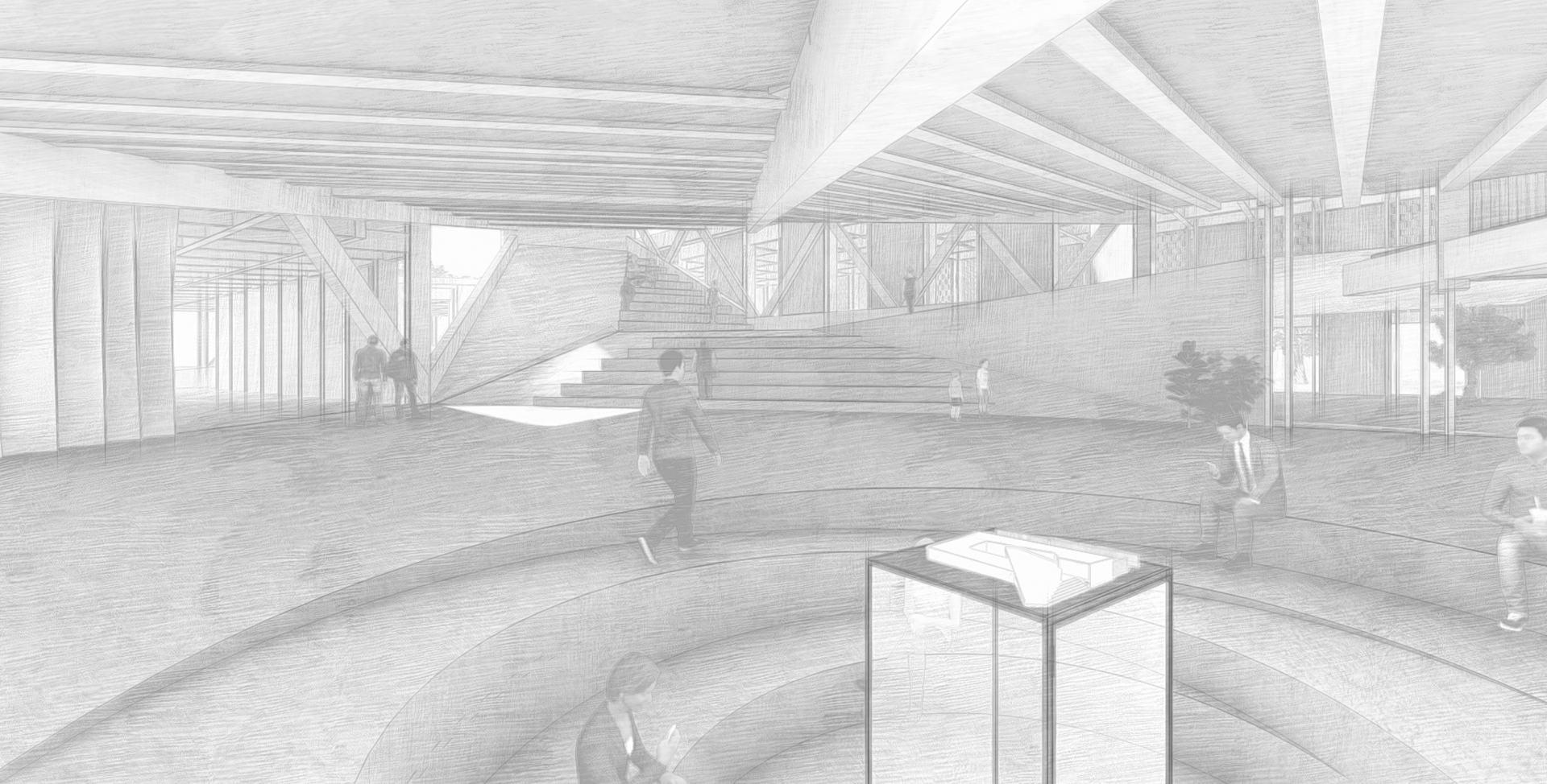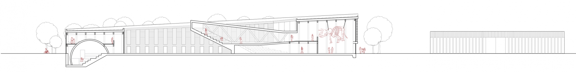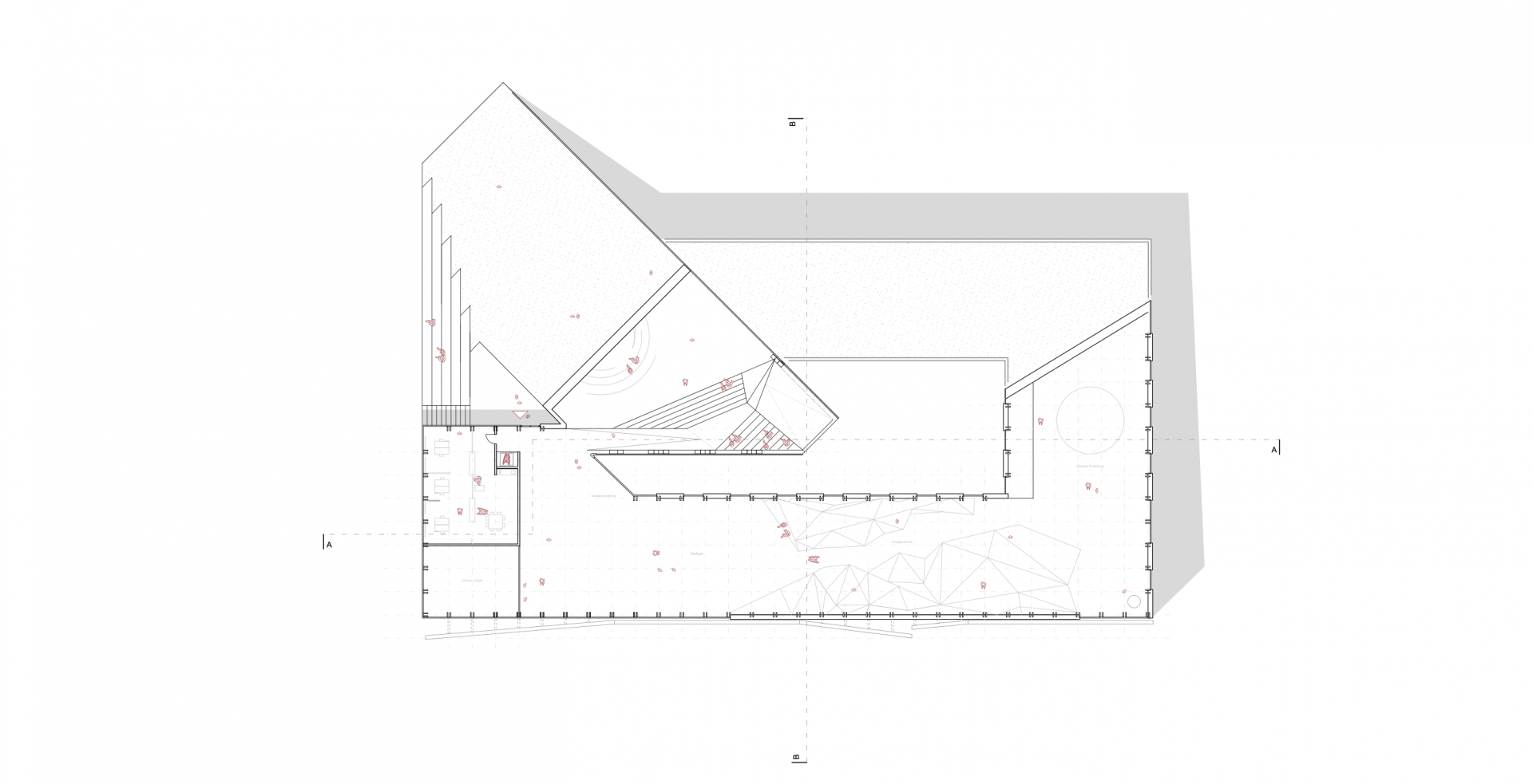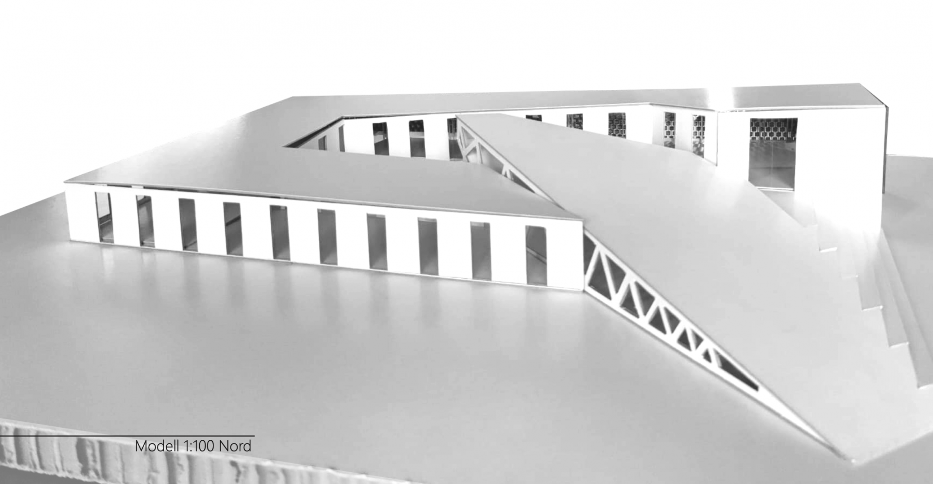 Durch die öffentliche Rampe entsteht als Kontrast zu dem langen Museumstrakt ein großer Raum mit verschiedenen Nutzungsmöglichkeiten. Hier ist eine große Sitztreppe platziert, die für Vorträge genutzt werden kann und das Ende des Museumsrundgangs darstellt.