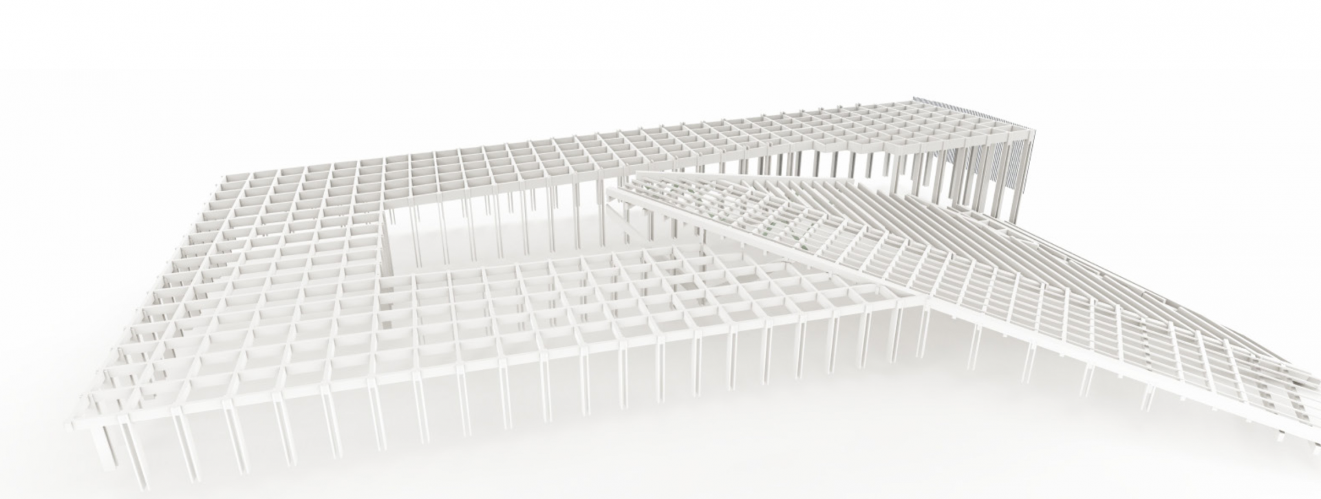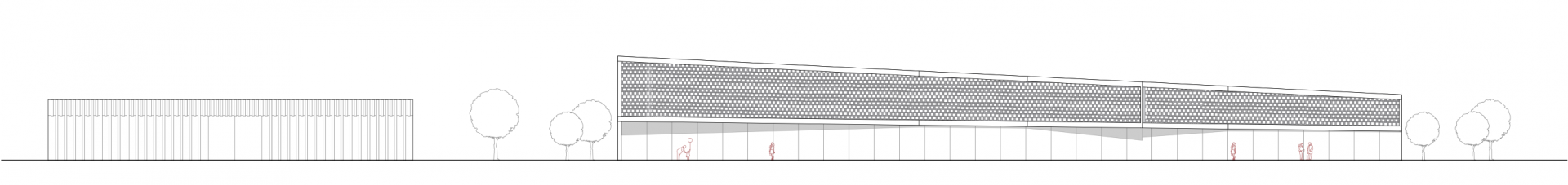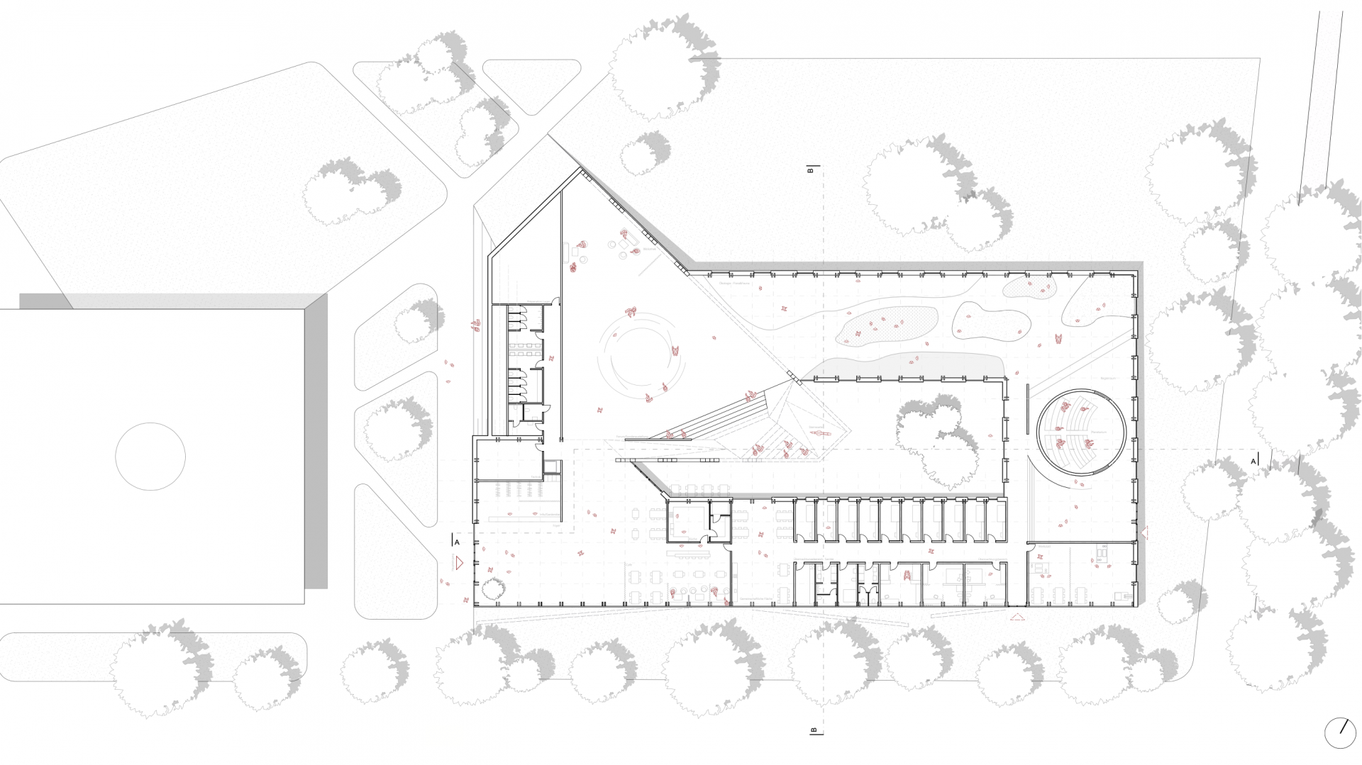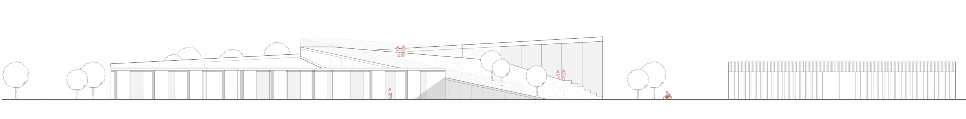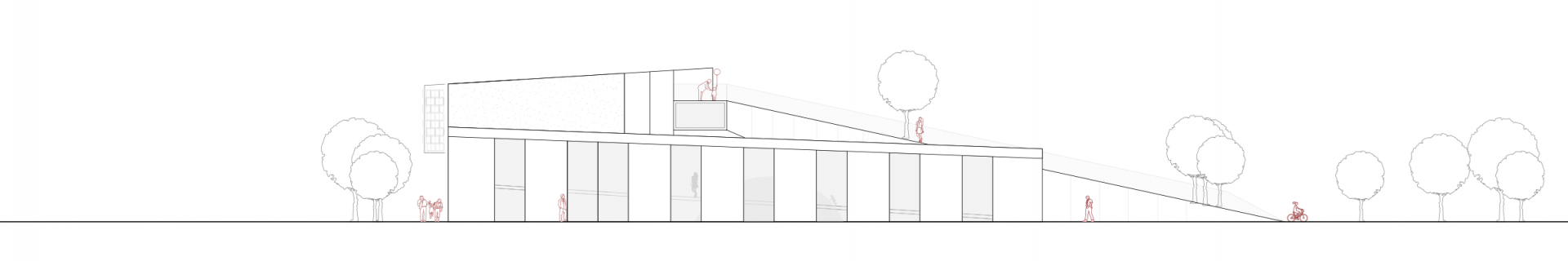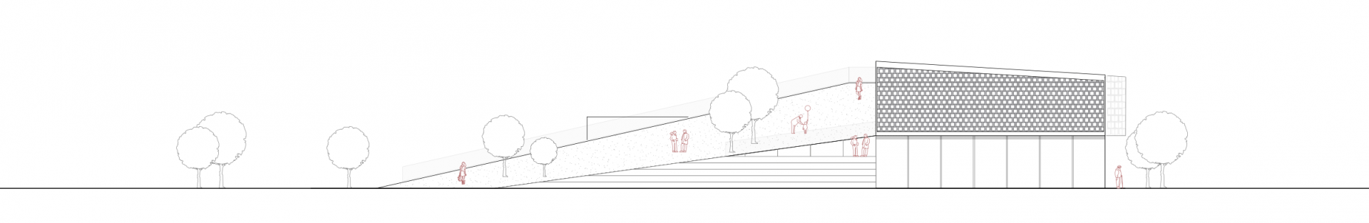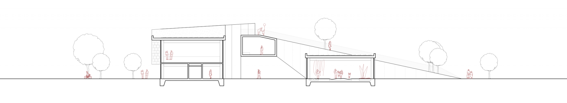 Um den Bezug zum Park herzustellen ist die nordwestliche Gebäudeecke an das Gelände angepasst. Dadurch entsteht eine öffentliche Rampe, die den Platz zwischen Museum und Umweltbildungszentrum erweitert und das Gebäude Teil der Landschaft werden lässt. Die Rampe kann auch außerhalb der Öffnungszeiten des Museums als Treffpunkt mit toller Aussicht genutzt werden und schirmt den Innenhof und die Erweiterungsflächen des botanischen Gartens vom Parkplatz und der Zufahrtsstraße ab.