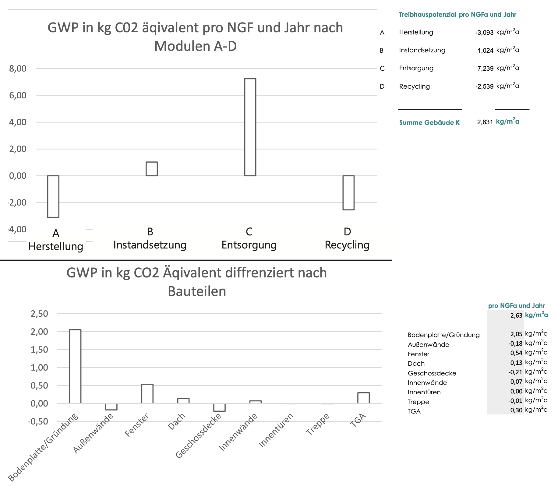- GWP Global Warming Potential (in kg CO2äquivalent pro m2NGF) Gesamt sowie differenziert nach Konstruktion und Nutzung