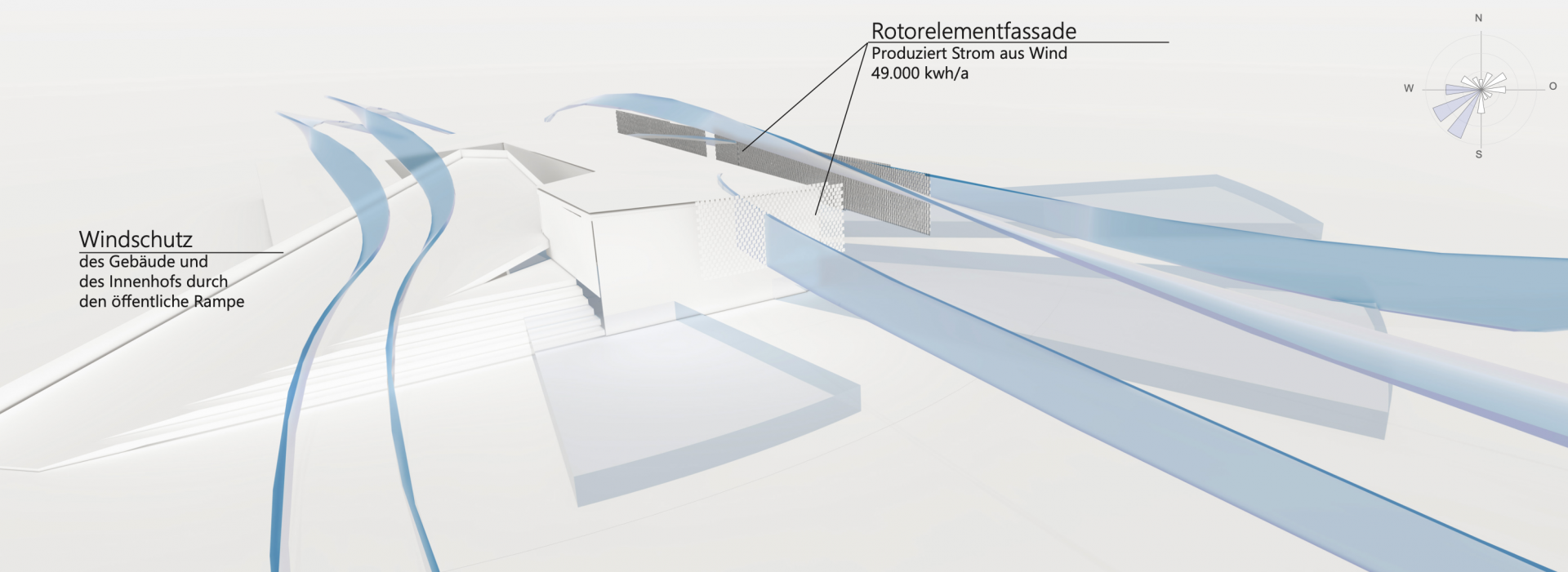 Die Süd- und Westfassade ist durch eine Rotorelementfassade bekleidet (s.u.). Die leichten Savonius-Rotoren aus Aluminium produzieren Strom und können durch einen Regler fixiert werden, um den Lichteinfall in den Innenraum zu steuern. Diese Windfassade steht als Vorbild für ein nachhaltiges modernes Gebäude.