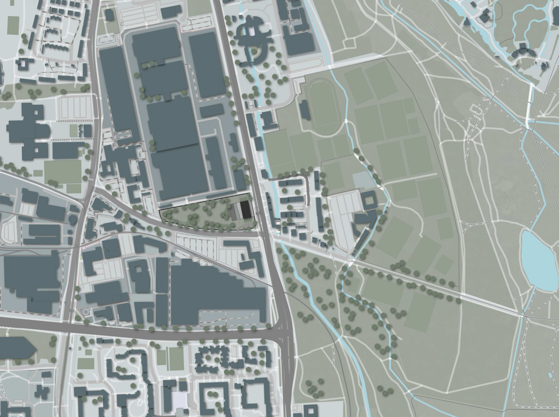 Die städtebauliche Freiraumgestaltung greift einige bekannte Leitbilder auf. Zum einen soll das bestehende Grün vernetzt werden. In diesem Projekt wird eine Grünzunge gebildet, die den Siebentischwald in die Baugebiete einlaufen lässt und so das Grün der Stadt erweitert. Zum anderen sollen versiegelte Flächen renaturiert werden. Durch die auf ein Minimum reduzierte Grundfläche des Gebäudes und insektenfreundliche Bepflanzung wird auf diesen Aspekt eingegangen.