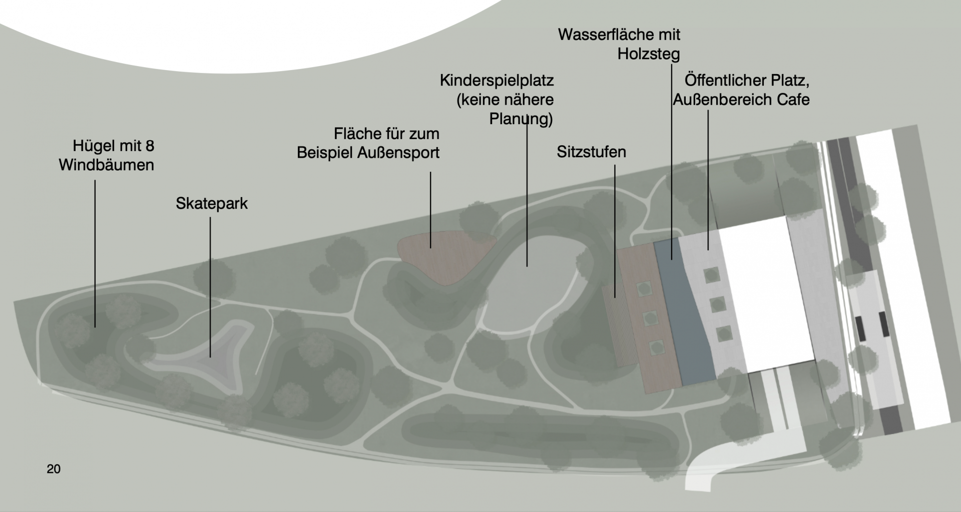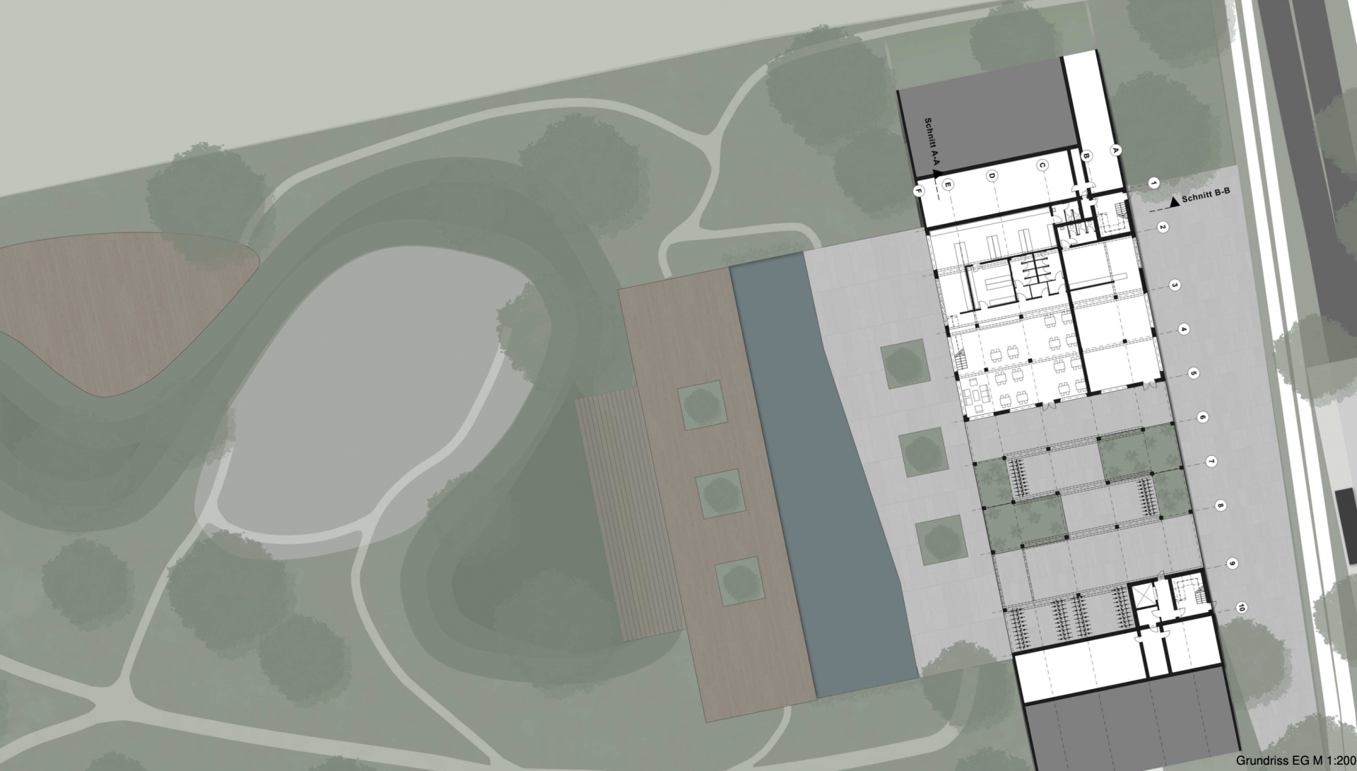 Begegnungsräume entstehen auf dem großen Vorplatz, der den Eingang zum Park darstellt und Raum bietet für einen Außenbereich des Cafes, einen durch Bäume verschatteten Holzsteg und eine Freitreppe mit Sitzstufen, die auf einen der drei Hügel führt. Der öffentliche Durchgang unter dem Gebäude hindurch soll passagenähnlich dazu einladen, wie durch ein über die gestalterisch betonten Rampen aufgespanntes Tor von der lauten Straße in einen über Hügel abgeschotteten, ruhigeren Bereich einzutreten.