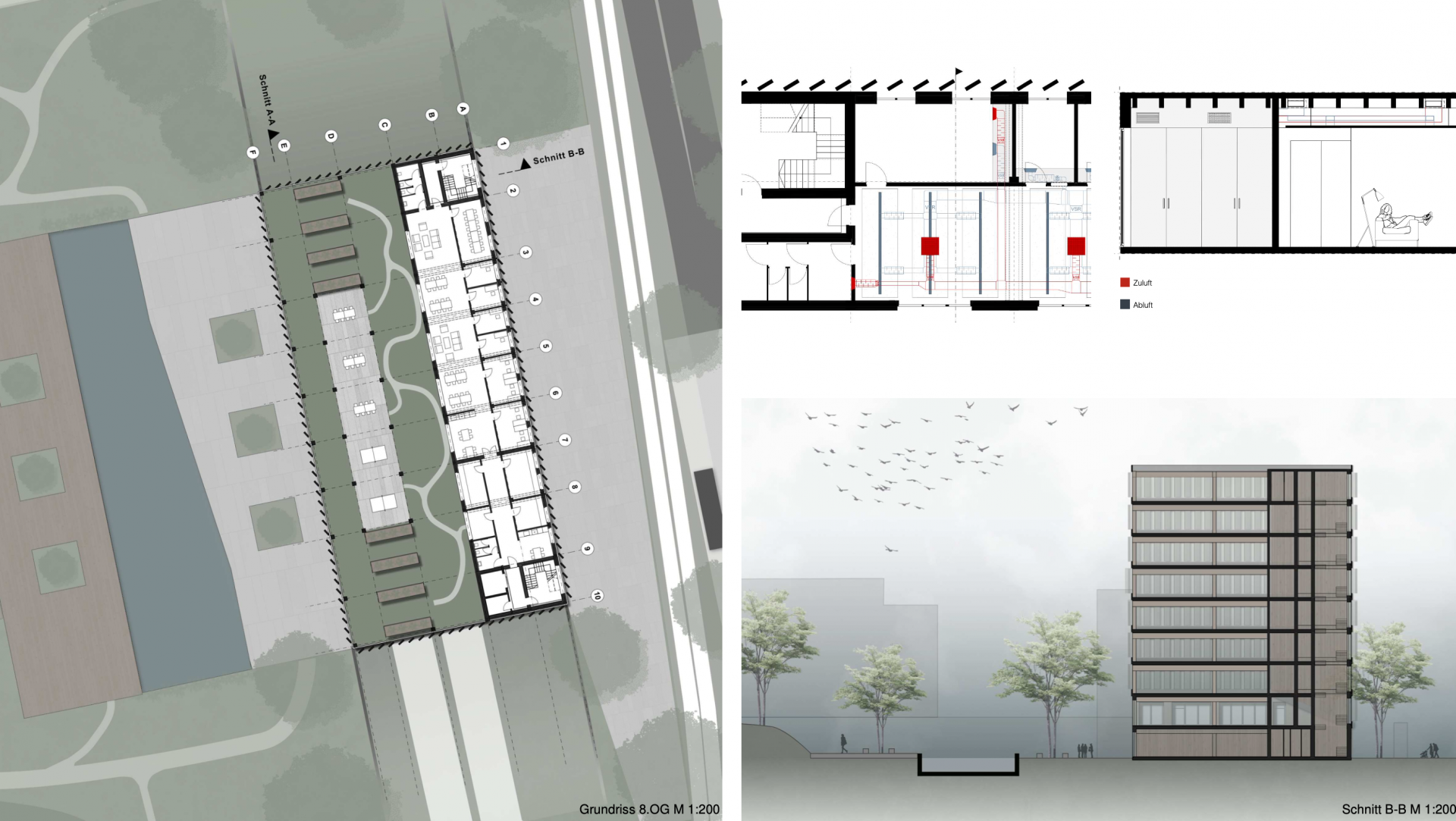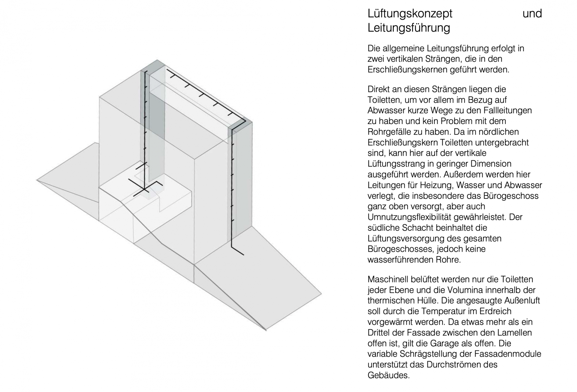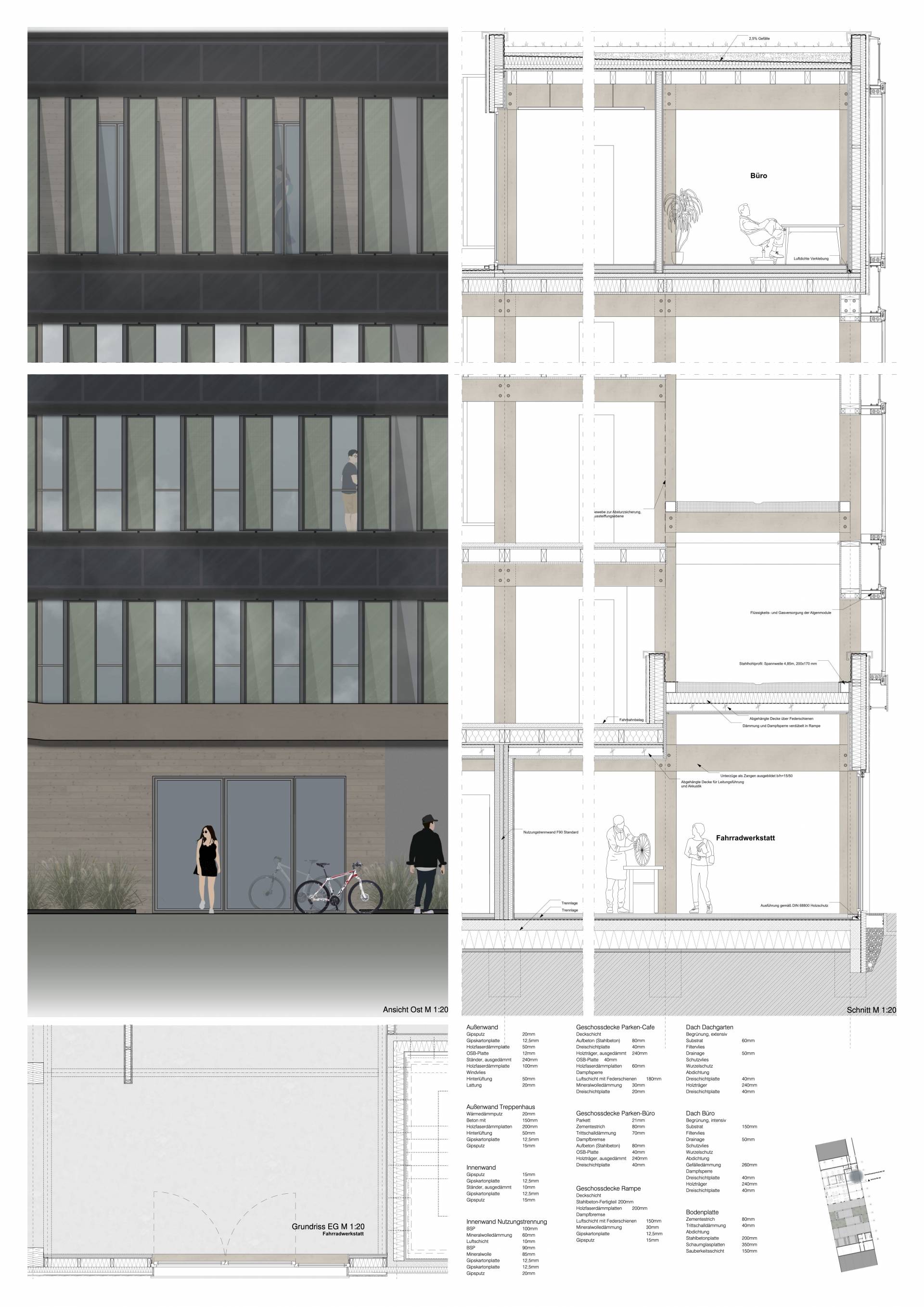 - Gebäudehülle und Anschlüsse: Entwicklung eines plausiblen Gebäudehüllen- und Konstruktionskonzeptes inklusive einer Materialwahl, bei der Innovationen und ein Kreislaufwirtschaften (circular economy) ausdrücklich erwünscht sind. Fassadenschnitt mit Grundrissausschnitt und Fassadenausschnitt in M 1:20 mit umfänglicher Beschriftung sämtlicher integraler Aspekte.