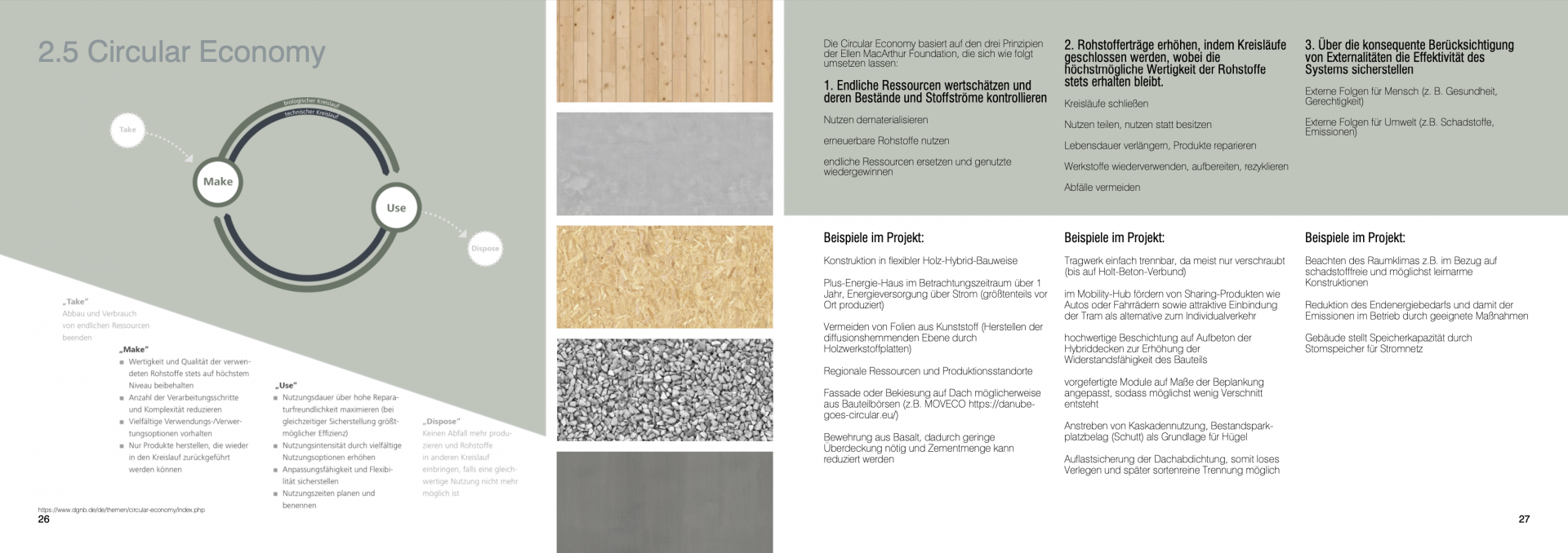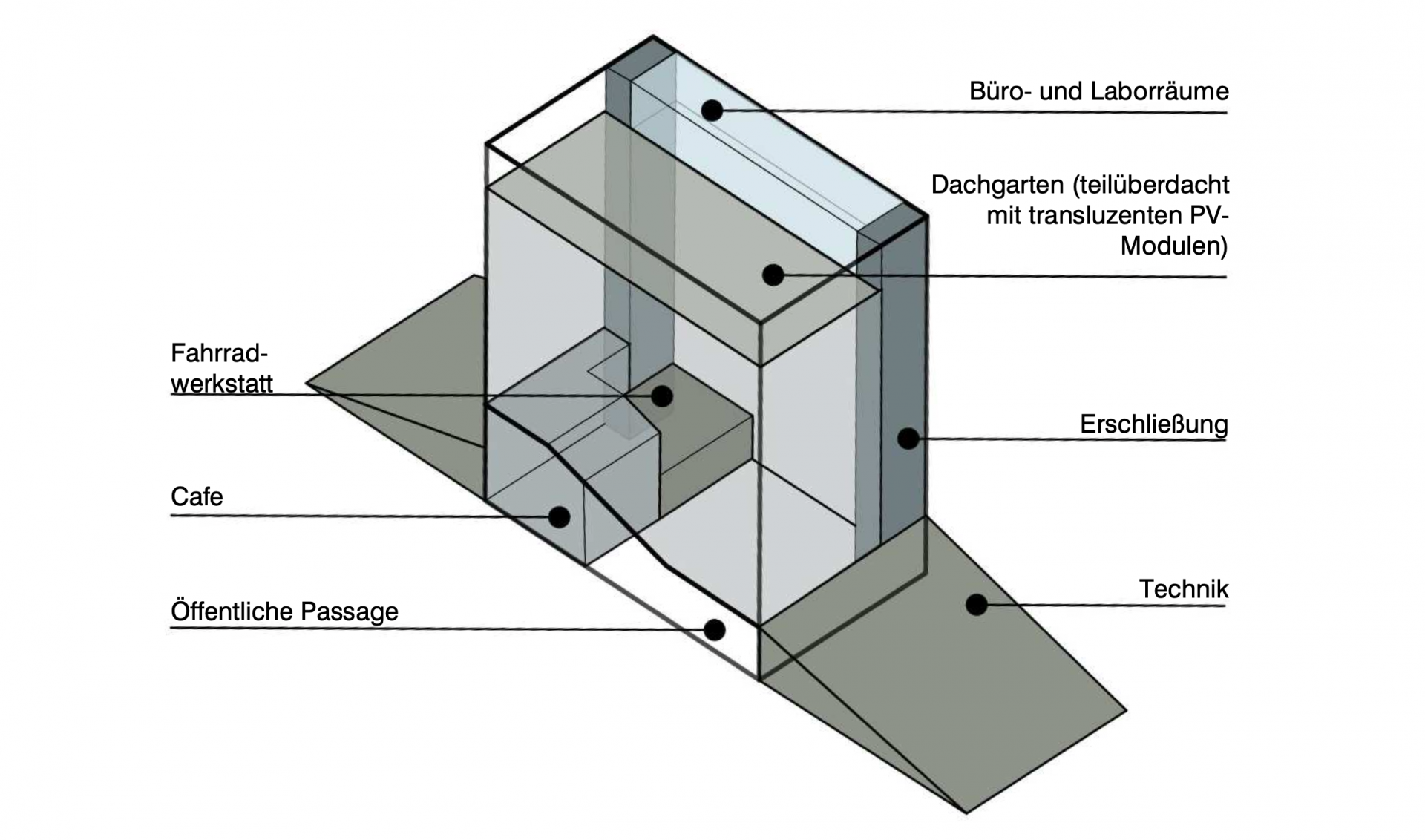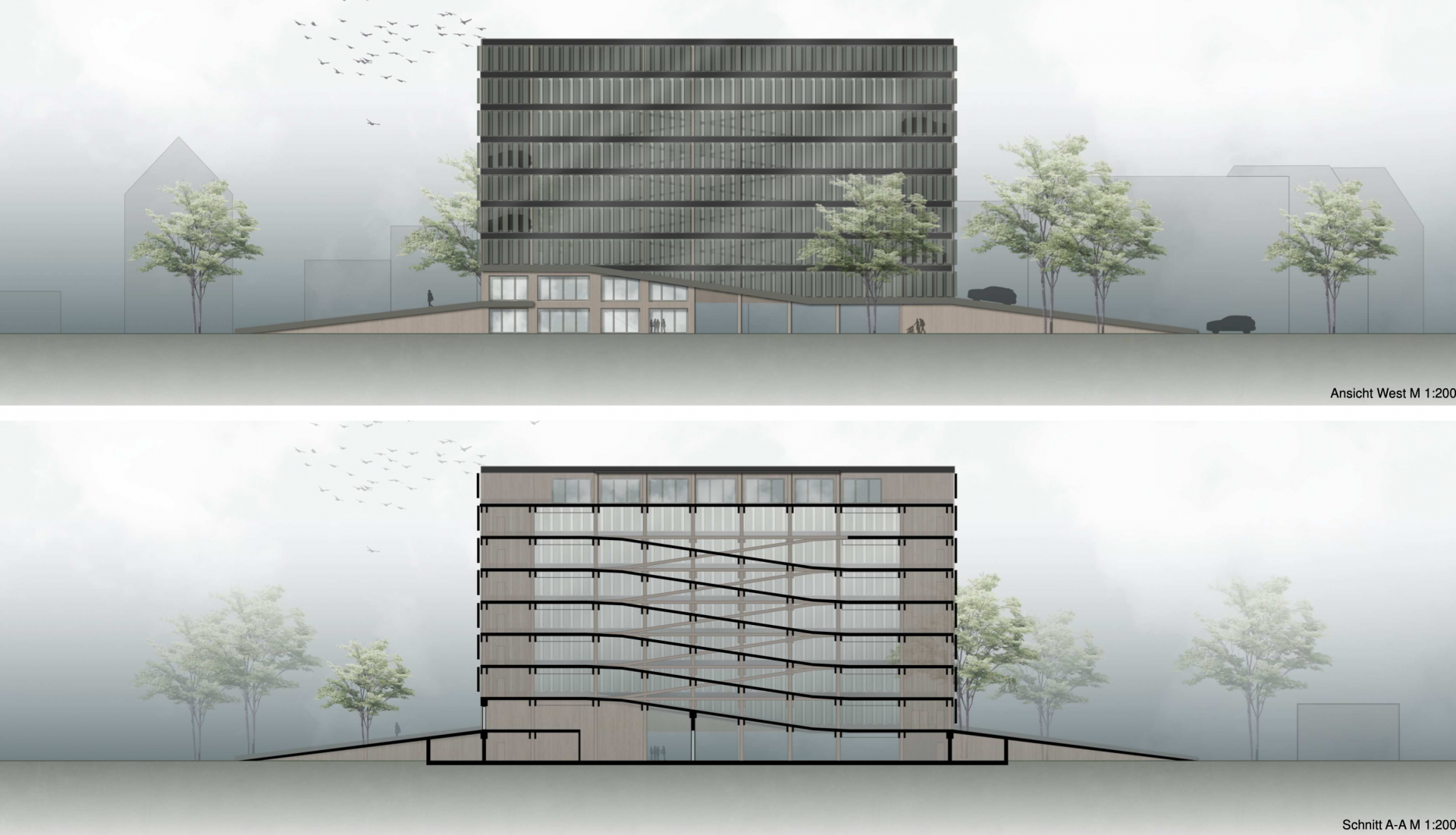 - Gebäudehülle und Anschlüsse: Entwicklung eines plausiblen Gebäudehüllen- und Konstruktionskonzeptes inklusive einer Materialwahl, bei der Innovationen und ein Kreislaufwirtschaften (circular economy) ausdrücklich erwünscht sind. Fassadenschnitt mit Grundrissausschnitt und Fassadenausschnitt in M 1:20 mit umfänglicher Beschriftung sämtlicher integraler Aspekte.