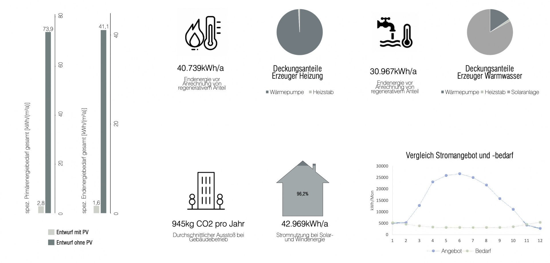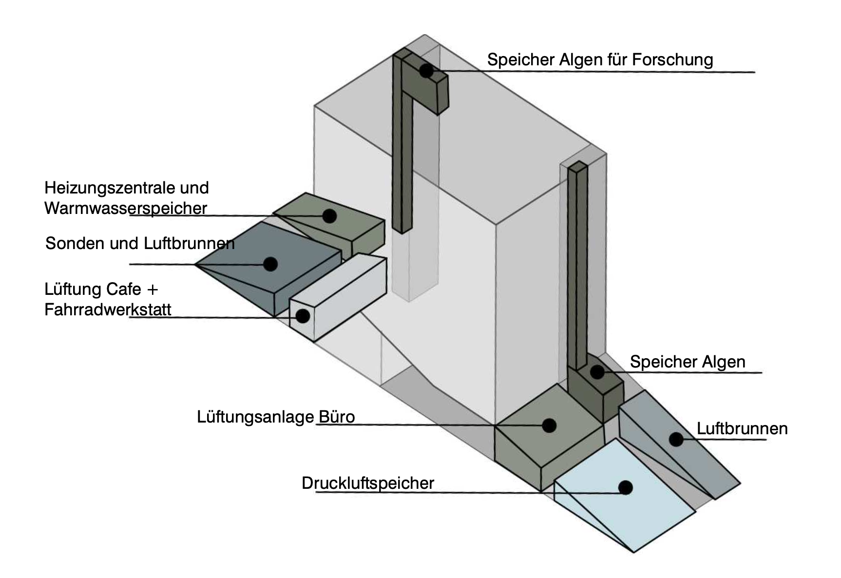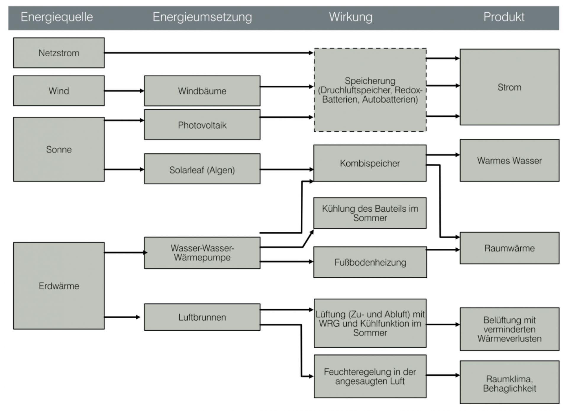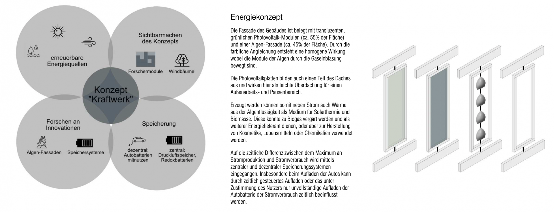 Neben diesen Nutzungsaspekten liegt der zweite Fokus in der Erzeugung von Energie aus erneuerbaren Quellen wie Photovoltaik, Wind, etc. Wichtige Aspekte des Entwurfs sind: