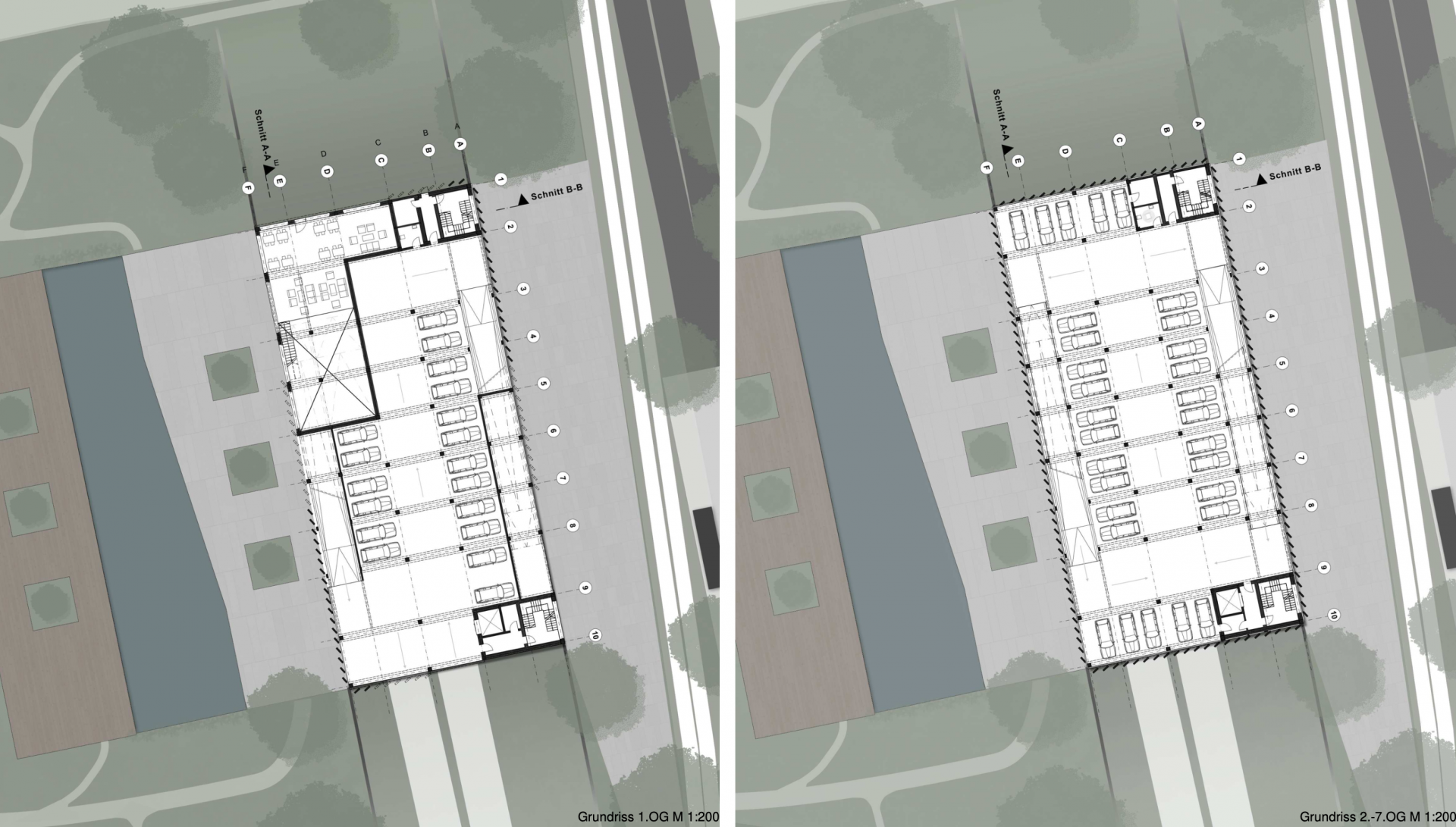 Die Rampen des Parkhauses sollen in nördlichen Bereich als Aufenthaltsraum und als zweiten Zugang zum Cafe dienen, die südliche erschließt das Parkhaus von der Werner-von-Siemens-Straße aus und leitet die Autos direkt ins erste Obergeschoss - also weg von dem Erdgeschoss, das dem reinen Fußgänger- und Fahrradverkehr gewidmet sein soll.