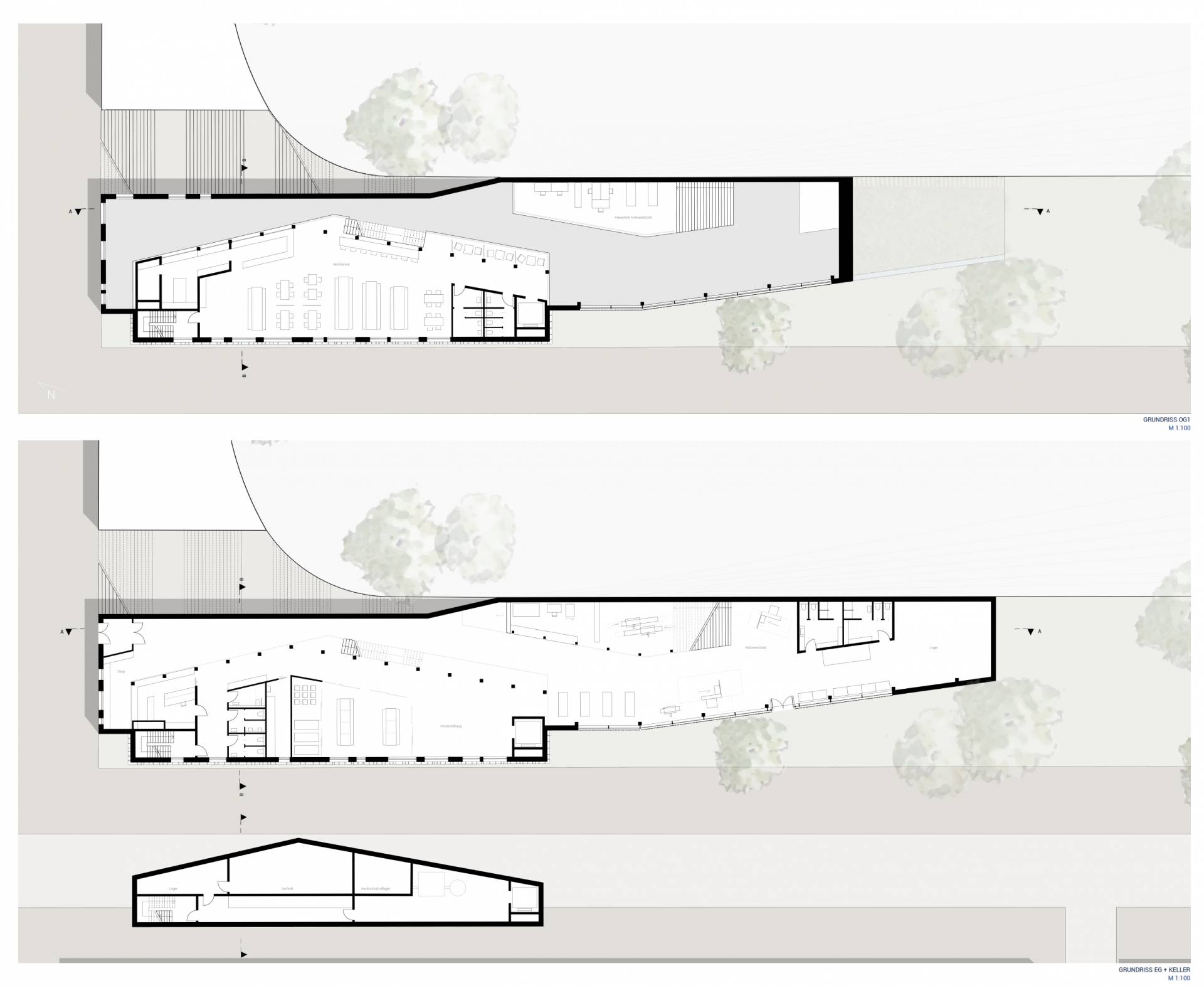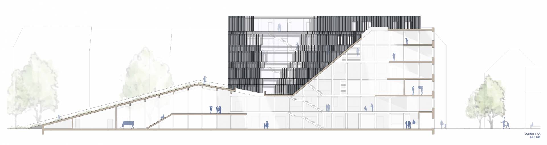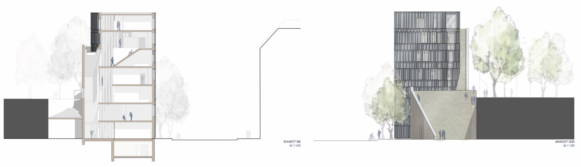 Zur Ostseite öffnet sich das Gebäude. Auf der Bohrpfahlwand entsteht durch die geschützte Lageein neuer Bereich mit hoher Aufenthaltsqualität. Wer sich über das begrünte Dach der Holzwerkstatt oder Steintreppe vom Platz aus auf die Höhe der Bohrpfahlwand begibt, tritt in Kontakt mit dem Geschehen im Inneren des Gebäudes.