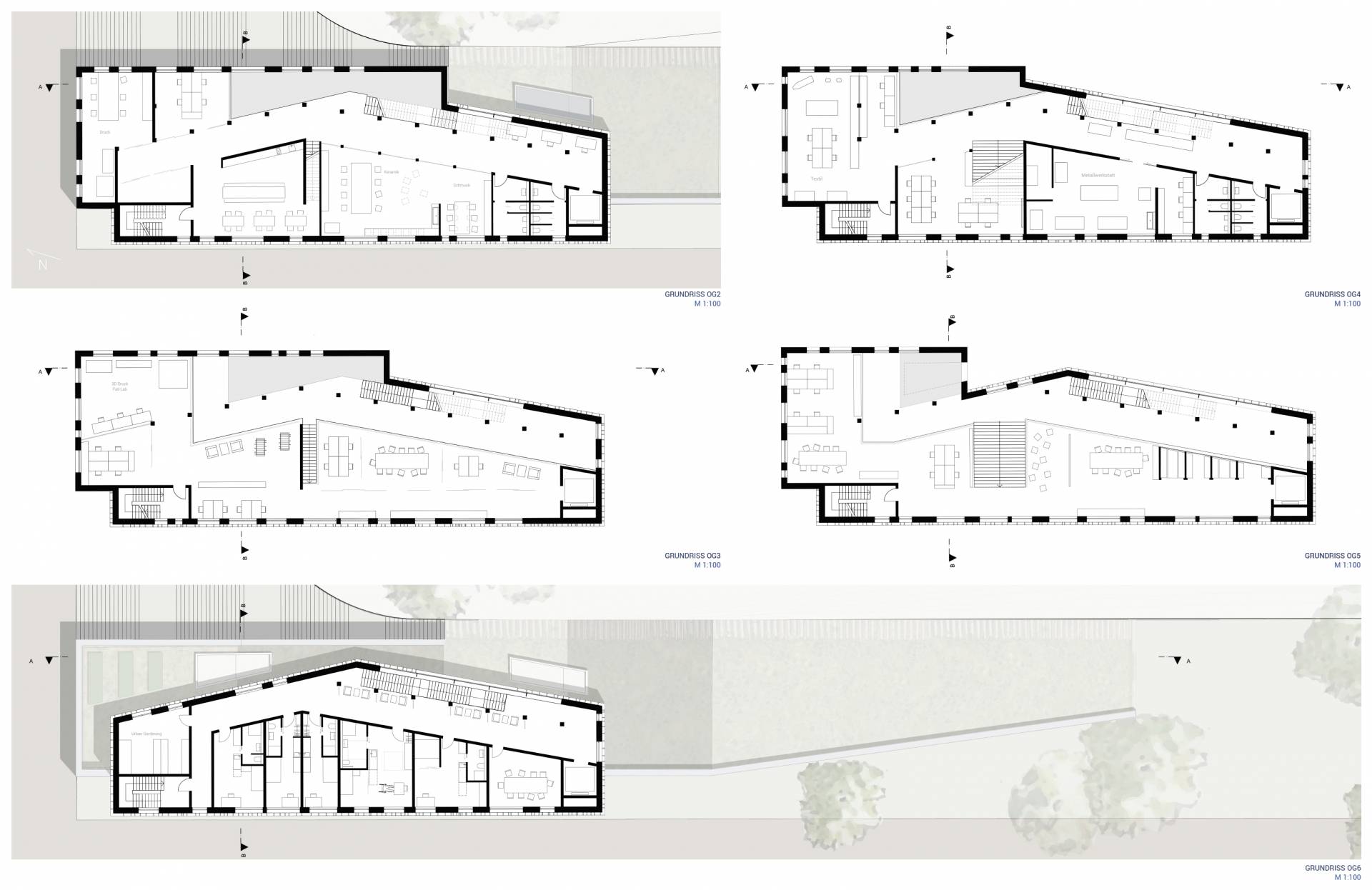 Co-Working Bereiche und Werkstatt-Bereiche sind nicht streng voneinander getrennt. Werkstätten und Besprechungsräume die besondere Schallschutzmaßnahmen erfordern sind in dem eingestellten Geschoss untergebracht. Die Bereiche, in denen die direkte offene Kommunikation zwischen den verschiedenen Zonen eine wichtige Rolle spielt, sind auf den eingestellten Geschossen untergebracht.