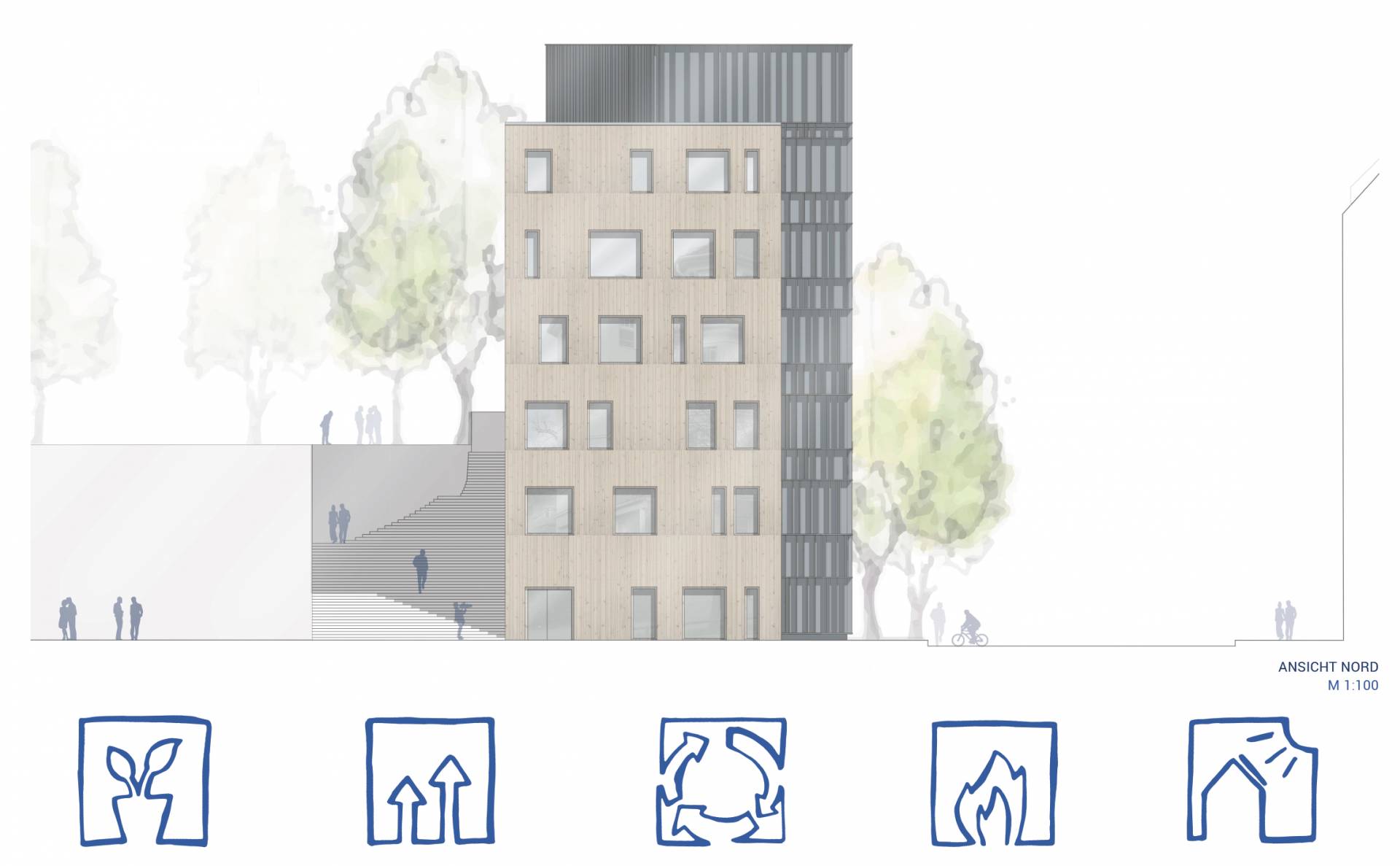 Der Grundkörper des Gebäudes bildet ein Pendant zu den historischen Gebäuden der Rosenaustraße und nimmt deren Gebäudehöhe auf. Das begrünte Dach der großen Holzwerkstatt bildet eine Verbindung des Grünstreifens zur Bohrpfahlwand. Zum Bahnhofsvorplatz West fügt sich das Gebäude in seiner Ansicht zu den anderen zum Platz gewandten Gebäude ein.