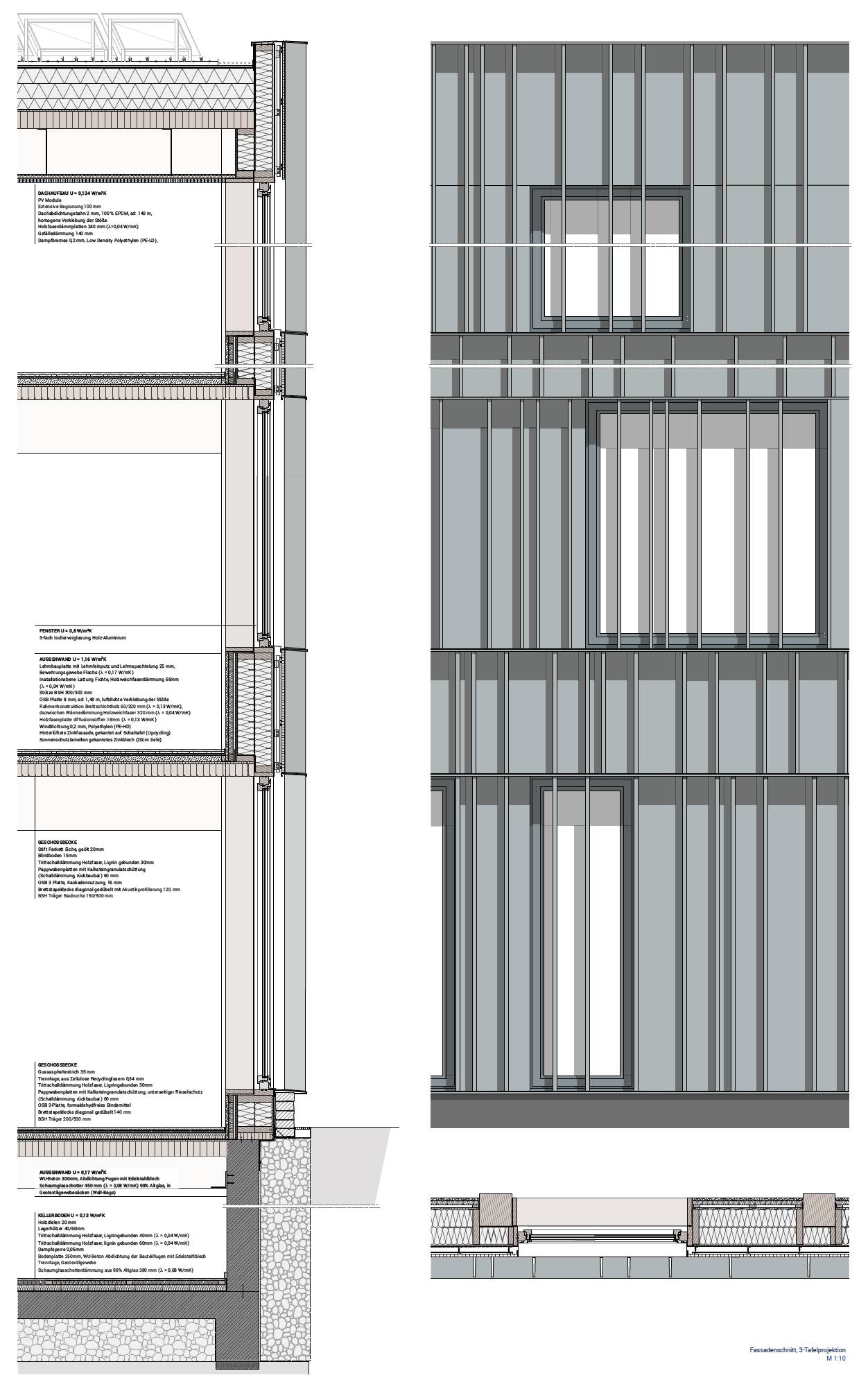 Das Gebäude wird in Holz-Skelettbauweise ausgeführt. Die BSH-Träger bilden das linienförmige Auflager für die Brettstapelholzdecke. Vorgefertigte Brüstungselemente in Rahmenbauwiese sowie Fenster- und Wandelemente mit hohem Vorfertigungsgrad ermöglichen eine wetterunabhängige Montage. Die Fassadenelemente aus Zink sollen ebenso modulweise montiert werden.