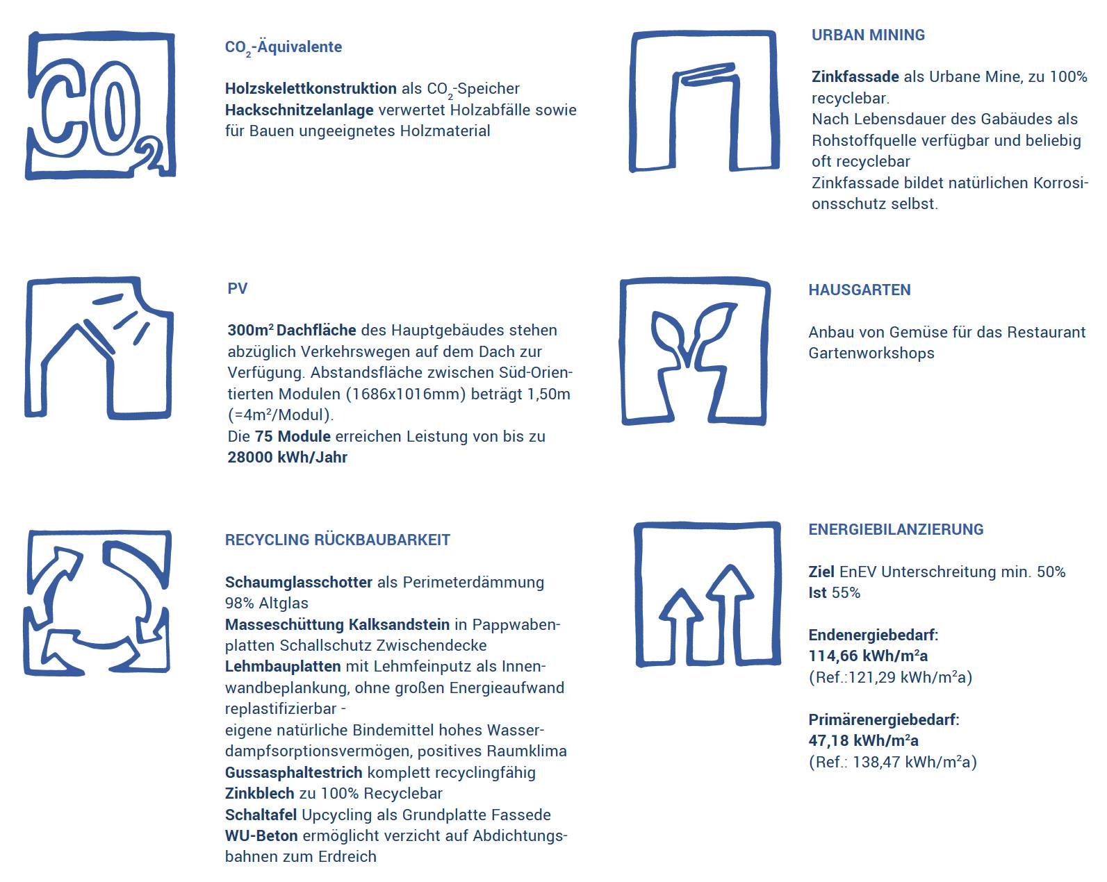 Die Zinkfassade dient als Urbane Mine. Zu einem späteren Zeitpunkt, nach Ablauf der Lebensdauer des Gebäudes, kann das Zink zu 100% recycelt werden und einen anderen Einsatzort finden. Eine zusätzliche Beschichtung der Zinkfassade als Korrosionsschutz ist nicht notwendig, Zink bildet selbst einen natürlichen Korrosionsschutz. Als Trägerplatten für die Brüstungselemente der Zinkfassade dienen wiederverwertete Schaltafeln.