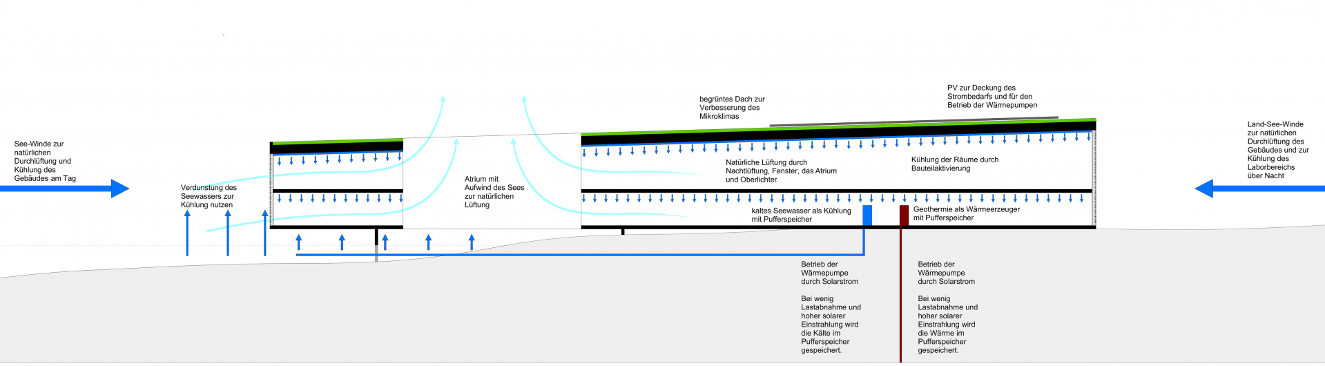 Die Kühlung der Büro- und Laborbereiche funktioniert natürlich. Land-See-Winde, welche tags vom See aufs Land wehen und nachts vom Land in Richtung See, dienen zur Kühlung der Zonen mit hohen internen Wärmequellen. Der Bürobereich liegt über dem Wasser, so dass hier die Verdunstungskühle des Sees die Räume indirekt kühlt. Zusätzlich fungieren Betondecken und massive Innenwände mittels Bauteilaktivierung als Kühlung. Hierfür wird das kalte Seewasser mittels einer Wärmepumpe, welche durch Solarstrom der Photovoltaikanlage auf dem Dach betrieben wird, zur Kühlung genutzt.