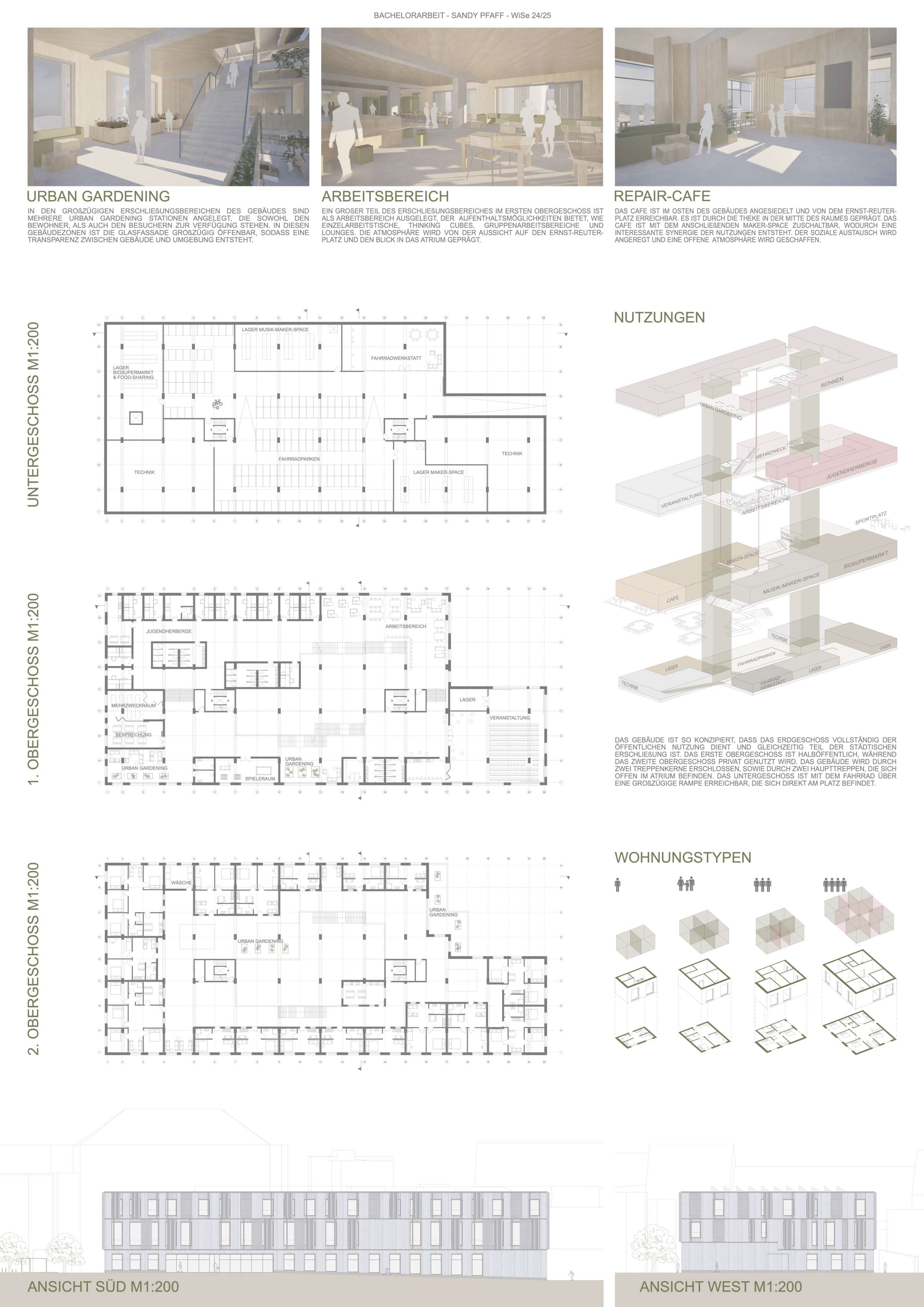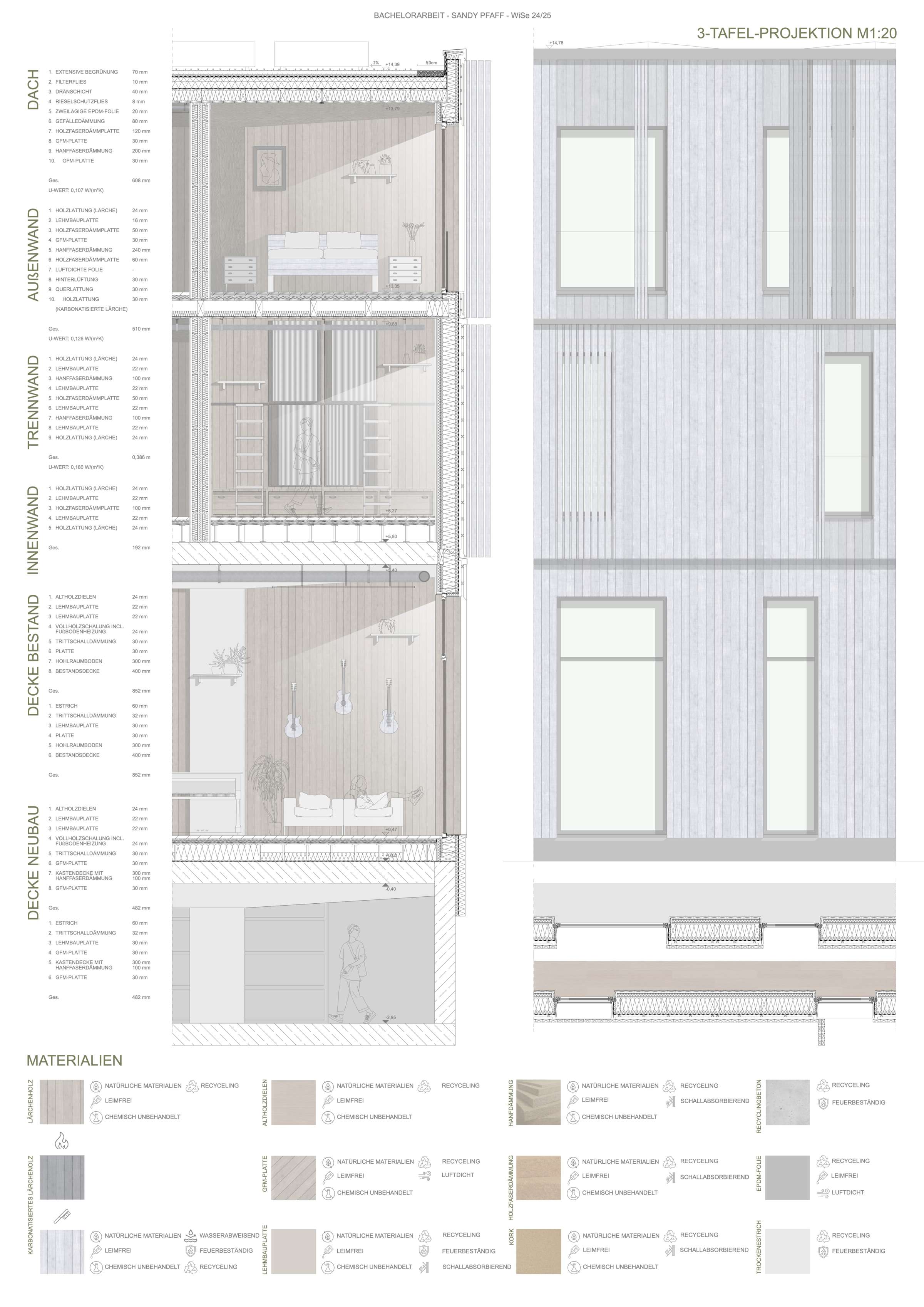 In einem umfangreichen Berichtsheft als Anlage wurden die Themen Bauteilkatalog, Anlagentechnik, Tragwerkskonzept, Energiebilanzierung, Ökobilanzierung etc. nachgewiesen. Diese Inhalte des integralen Entwerfens bilden einen zentralen Teil der Arbeit und wurden iterativ im Entwurf berücksichtigt.