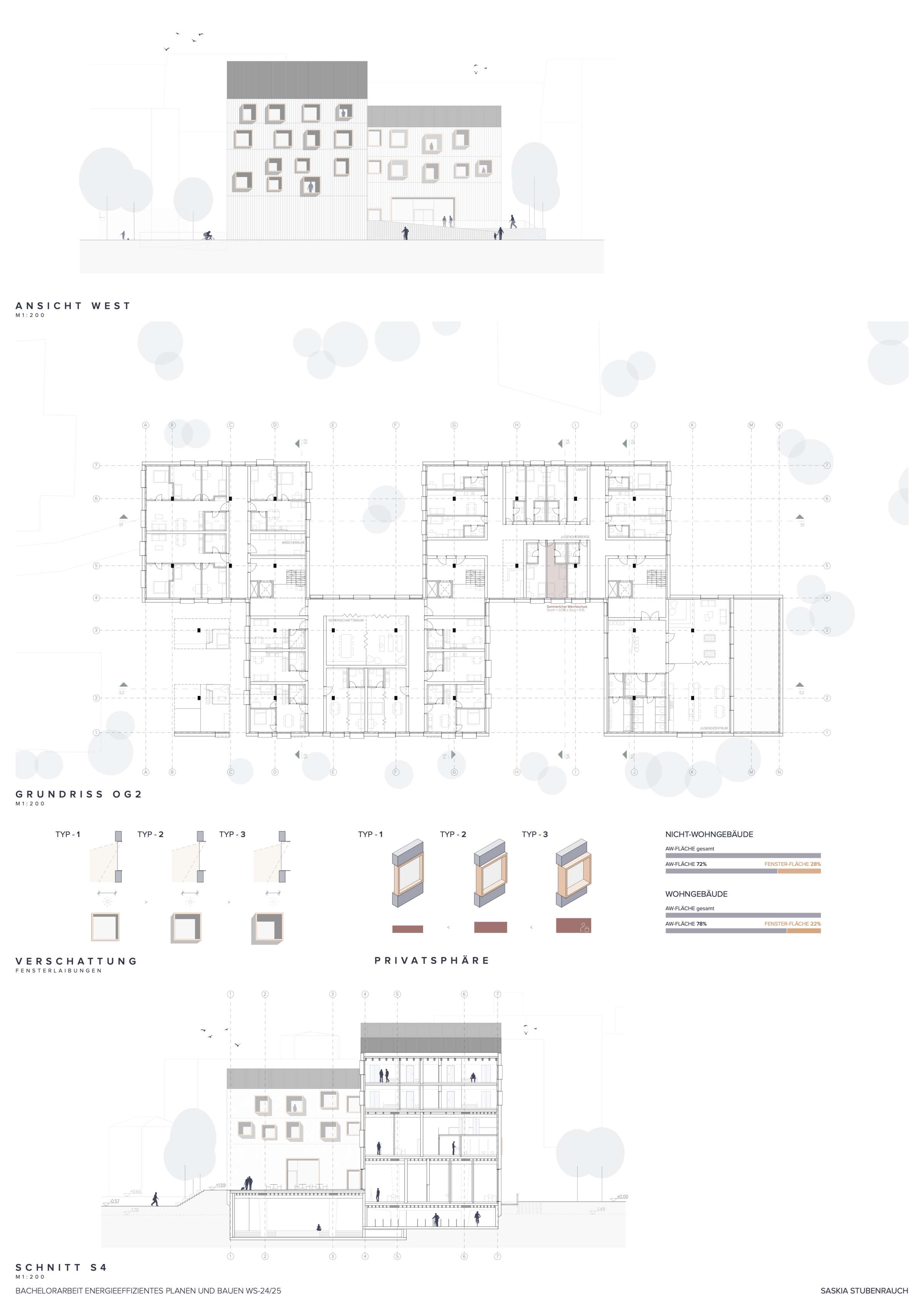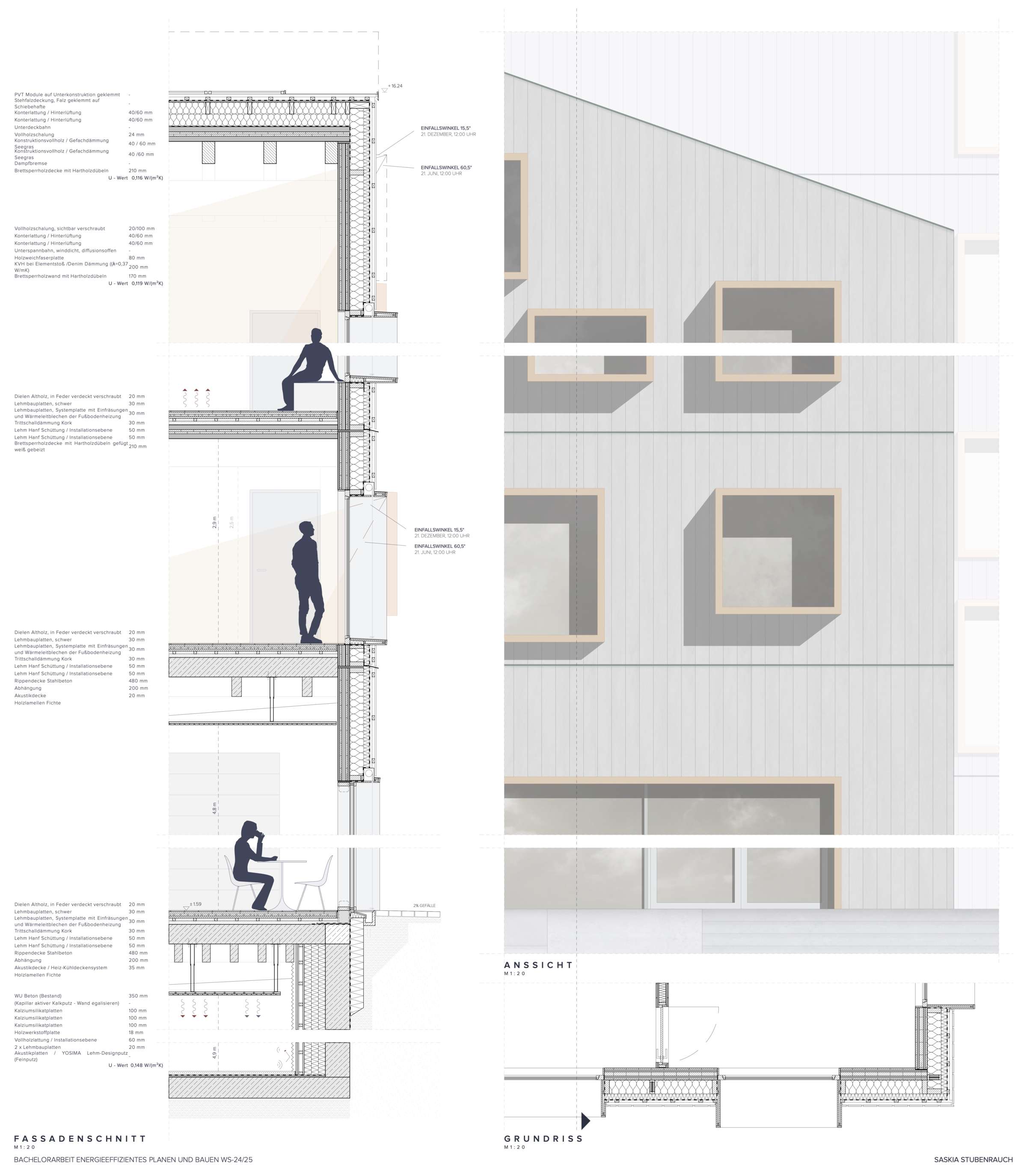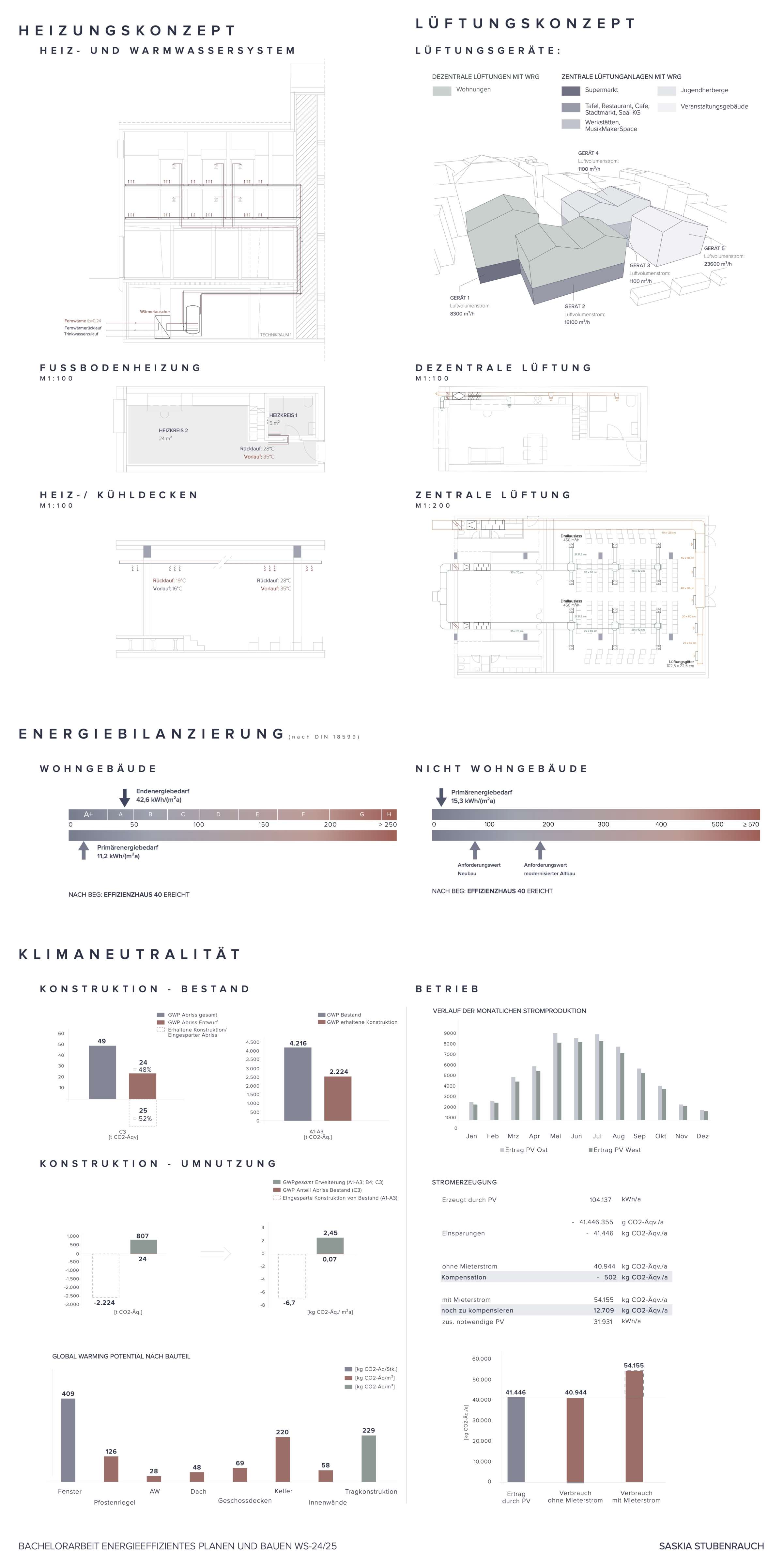 In einem umfangreichen Berichtsheft als Anlage wurden die Themen Bauteilkatalog, Anlagentechnik, Tragwerkskonzept, Energiebilanzierung, Ökobilanzierung etc. nachgewiesen. Diese Inhalte des integralen Entwerfens bilden einen zentralen Teil der Arbeit und wurden iterativ im Entwurf berücksichtigt.