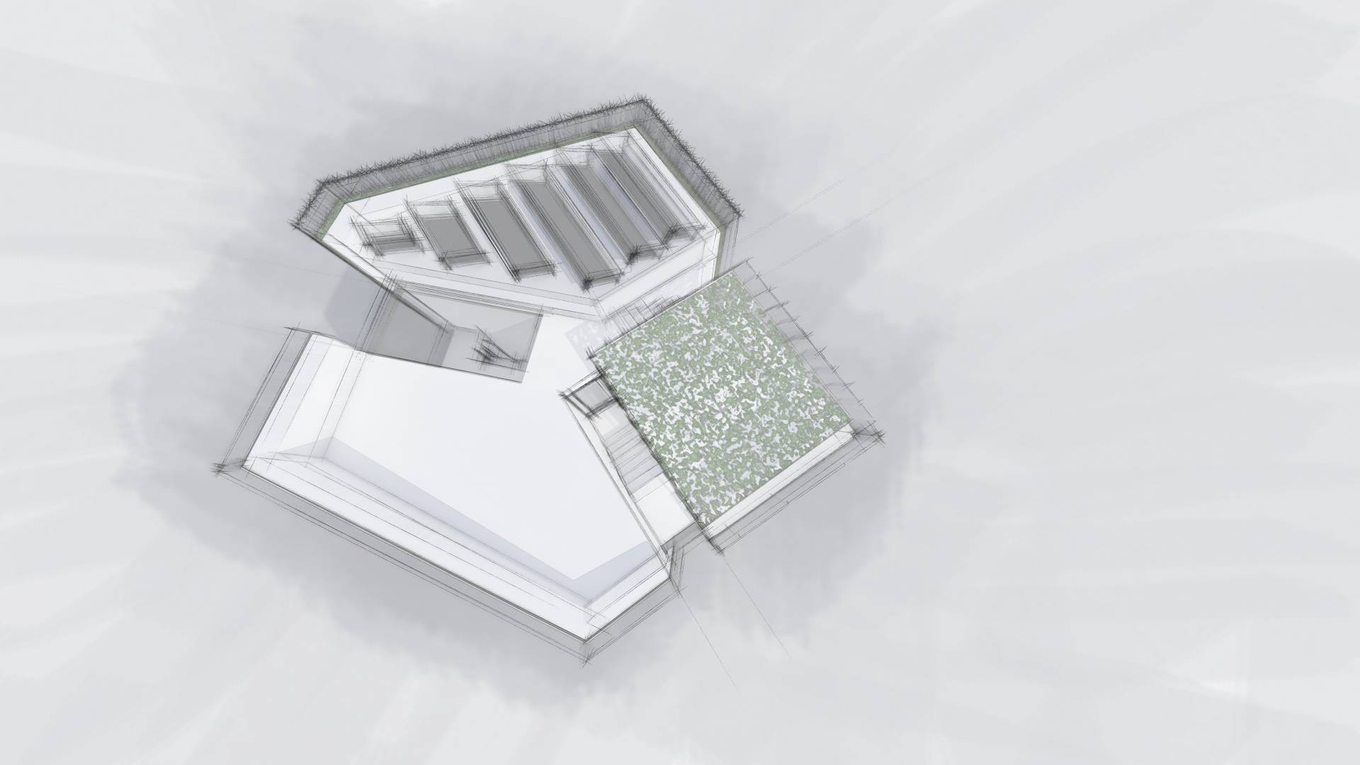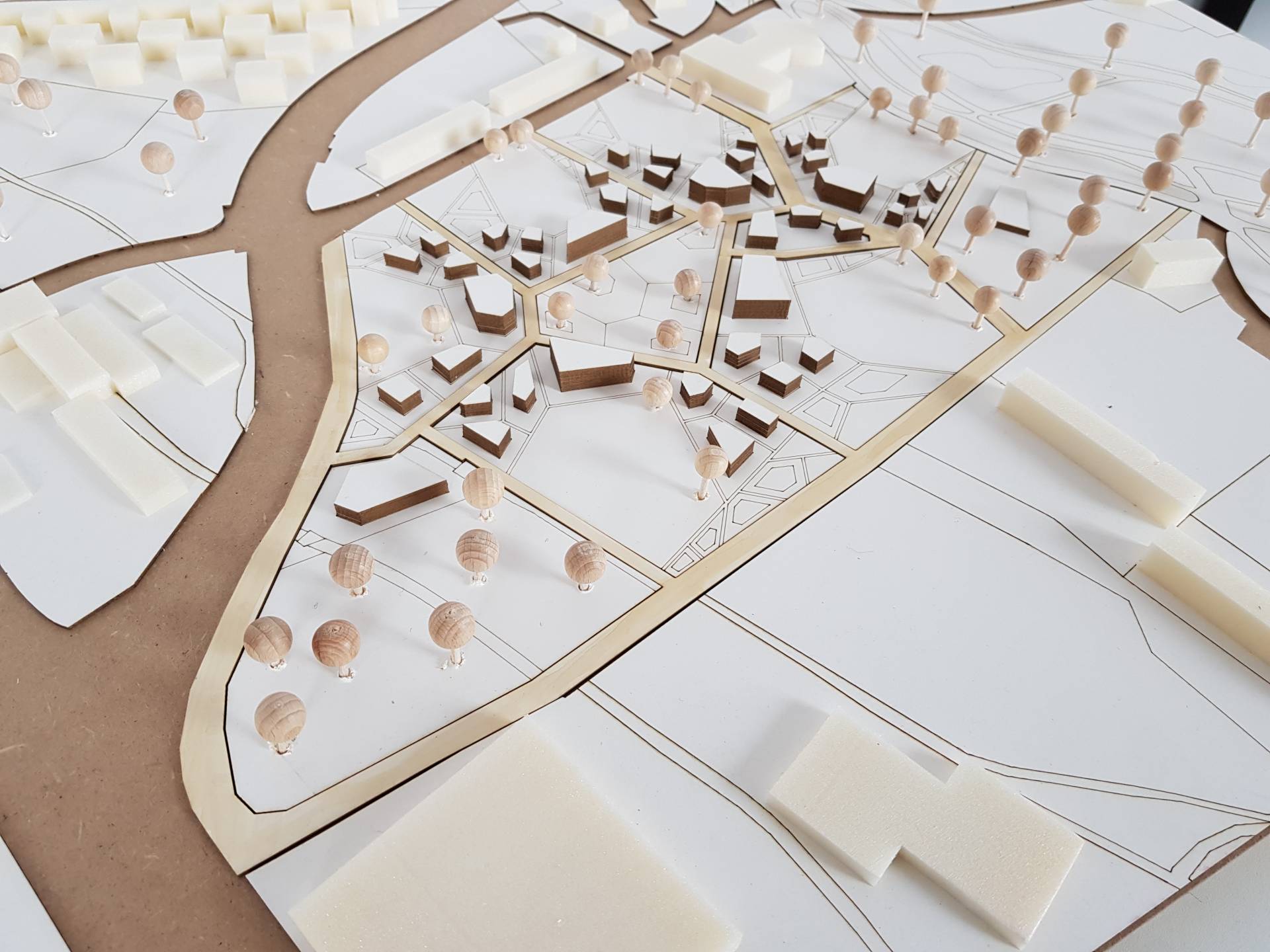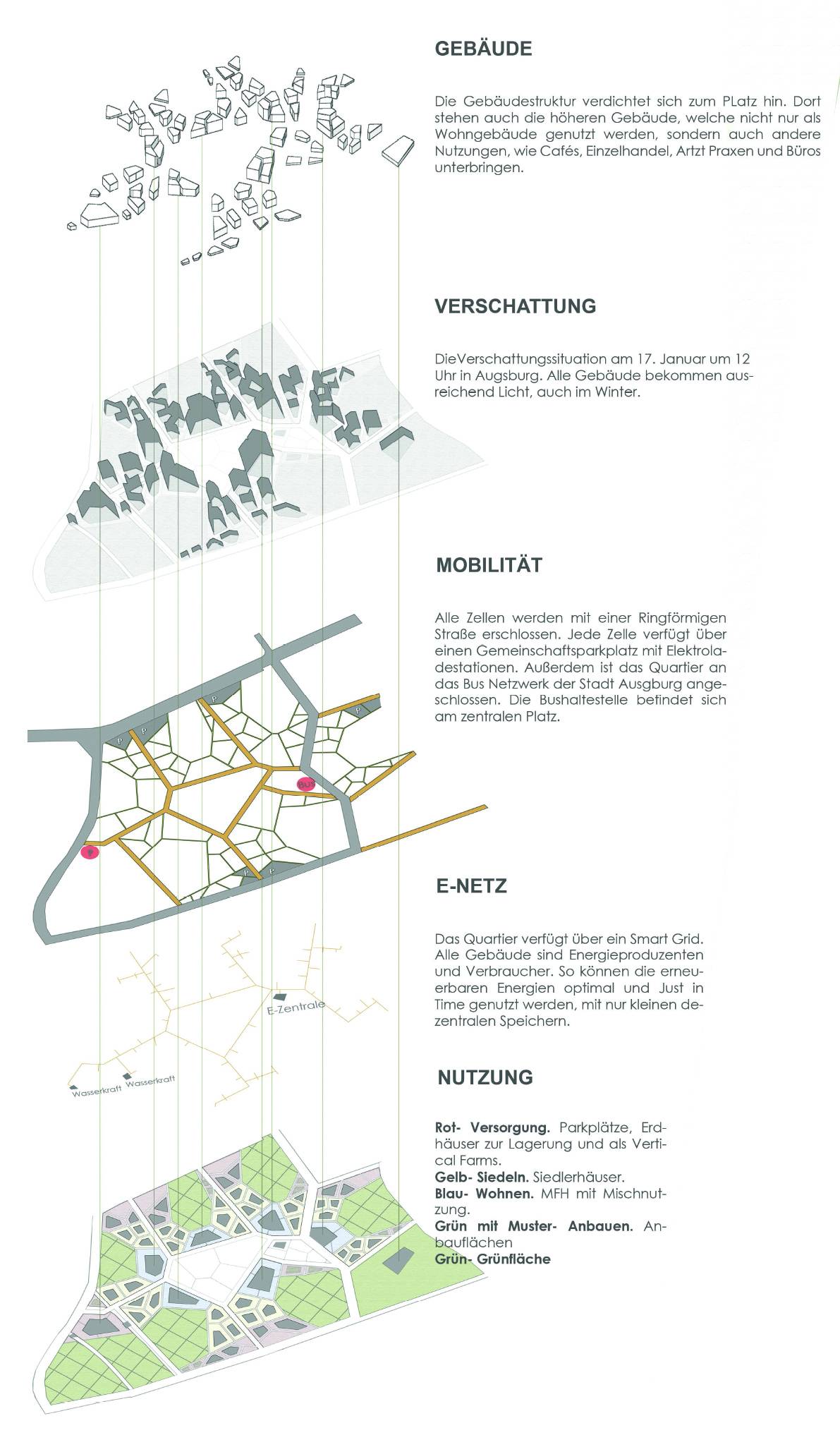 Das Quartier in Augsburg zwischen dem Siebentischwald und der B300, welches bisher als Schrebergarten Siedlung genutzt wurde, sollte neu überplant werden. Ziel des städtebaulichen Entwurfes war dabei eine Siedlung, welche sich zu einem möglichst großen Teil selbst mit Obst und Gemüse versorgen kann und eine hohe Lebensqualität für die Bewohner bietet. Dabei war es vor allem wichtig, durch die Überlagerung verschiedener Netzstrukturen zu einem städtebaulichen Entwurf zu kommen, welcher sich an den vorgegebenen Ort einfügt. Als effiziente und an die Natur angelehnte Lösung ist eine Zellstruktur entstanden, die in mehrere Hierarchiestufen gegliedert wurde, ähnlich der zellulären Struktur eines Blattes. Das Herzstück des Quartiers bildet ein Platz, an dem sich Cafés, Arztpraxen, Büros und Einzelhandel in Symbiose mit der Wohnnutzung ansiedeln.
