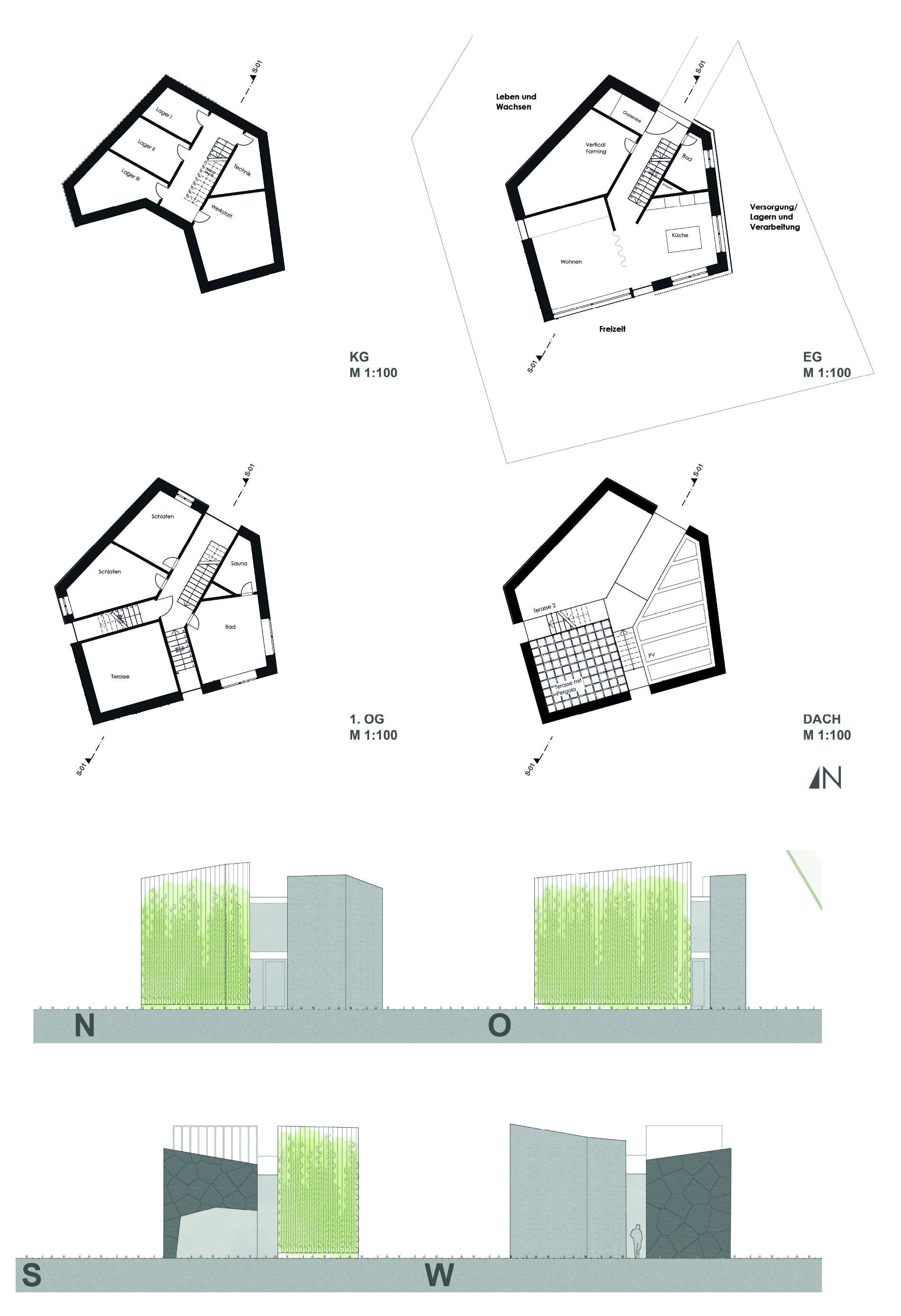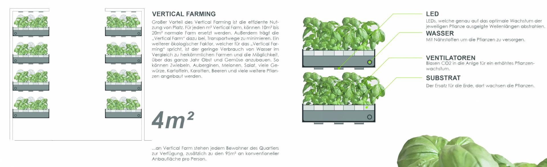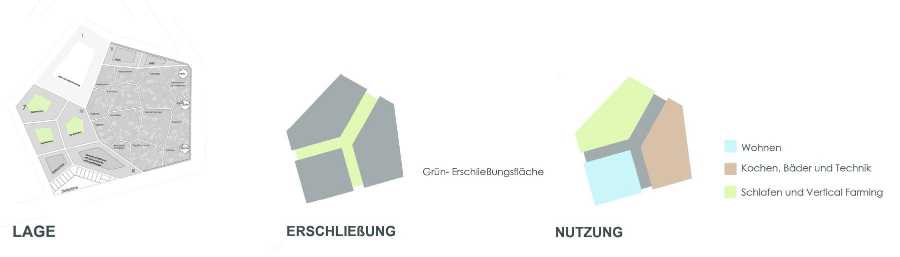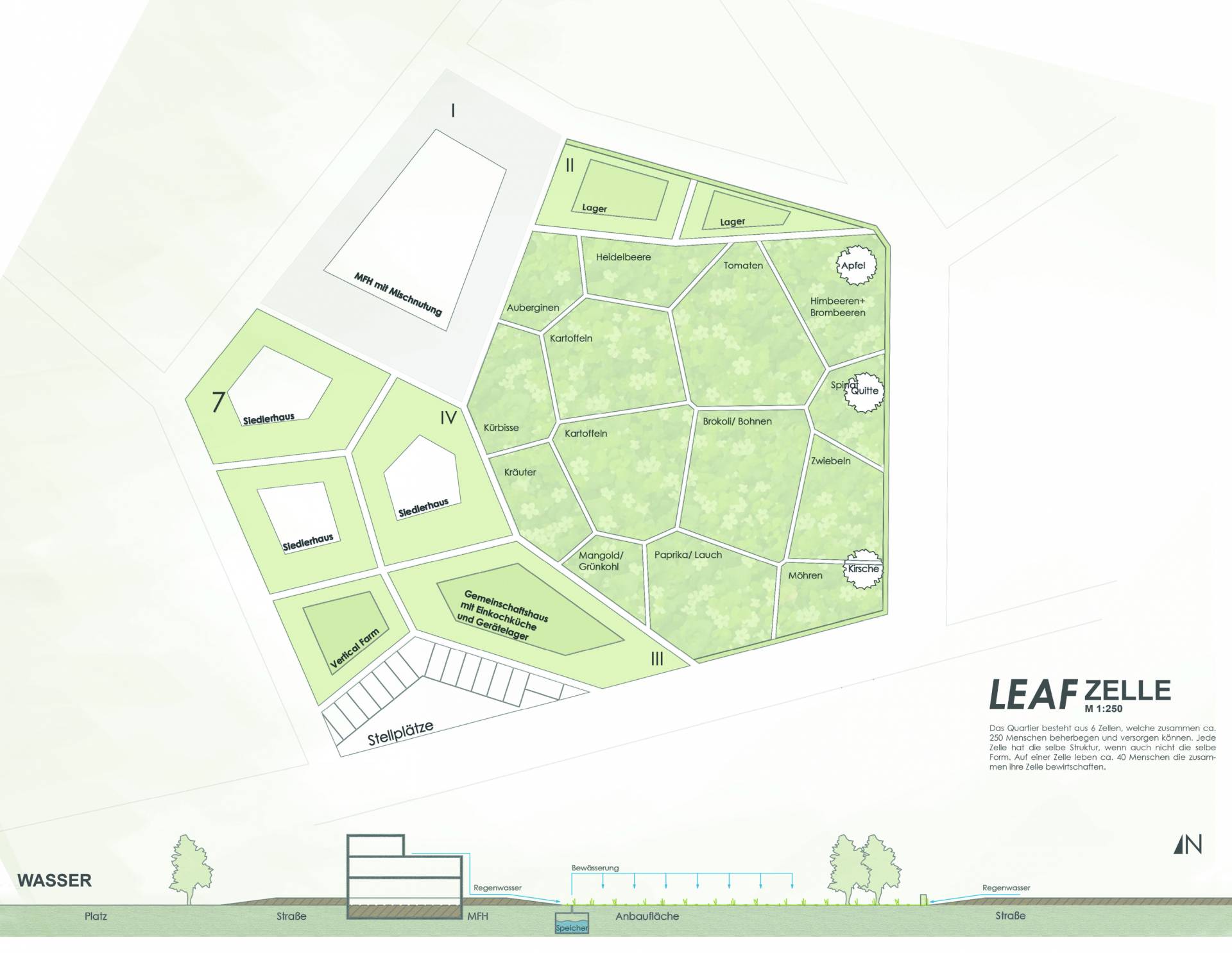 Das Quartier ist in 8 Zellen gegliedert, von denen 6 bewohnt sind. Die bewohnten Bereiche dieser 6 Zellen sind ringförmig um die Anbaufläche angeordnet und verdichten sich in Richtung Platz. Dort stehen die größeren Mehrfamilienhäuser. Nach außen hin kommen die Siedlerhäuser und zuletzt die Erdhäuser. Die Erdhäuser dienen als Lager, Gemeinschaftsräume, Einkochküchen und zum Indoor-farming. Jedem Bewohner stehen so 4m² Vertical Farm und 95m² konventionelle Anbaufläche zur Verfügung. Das reicht um sich mit Obst, Gemüse und Kartoffeln zu 79% selbst zu versorgen, bei einer von Ärzten empfohlenen Ernährung.