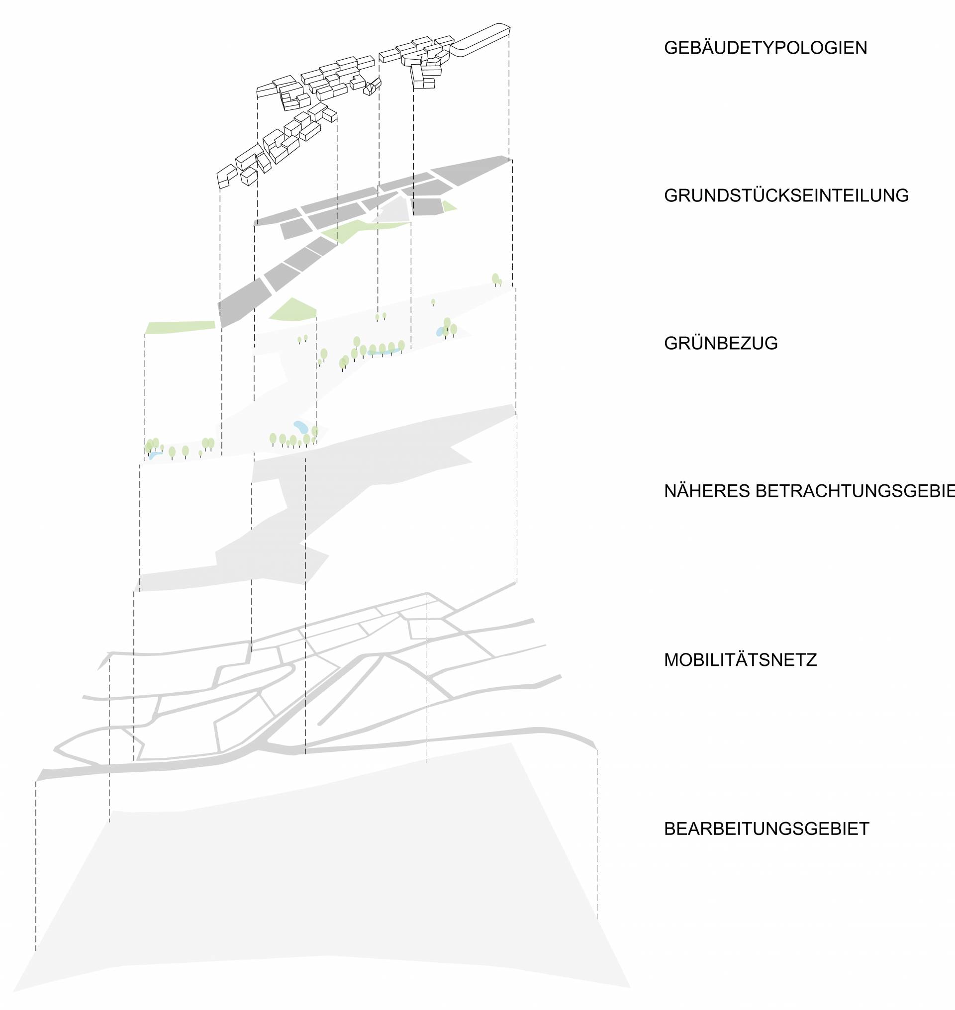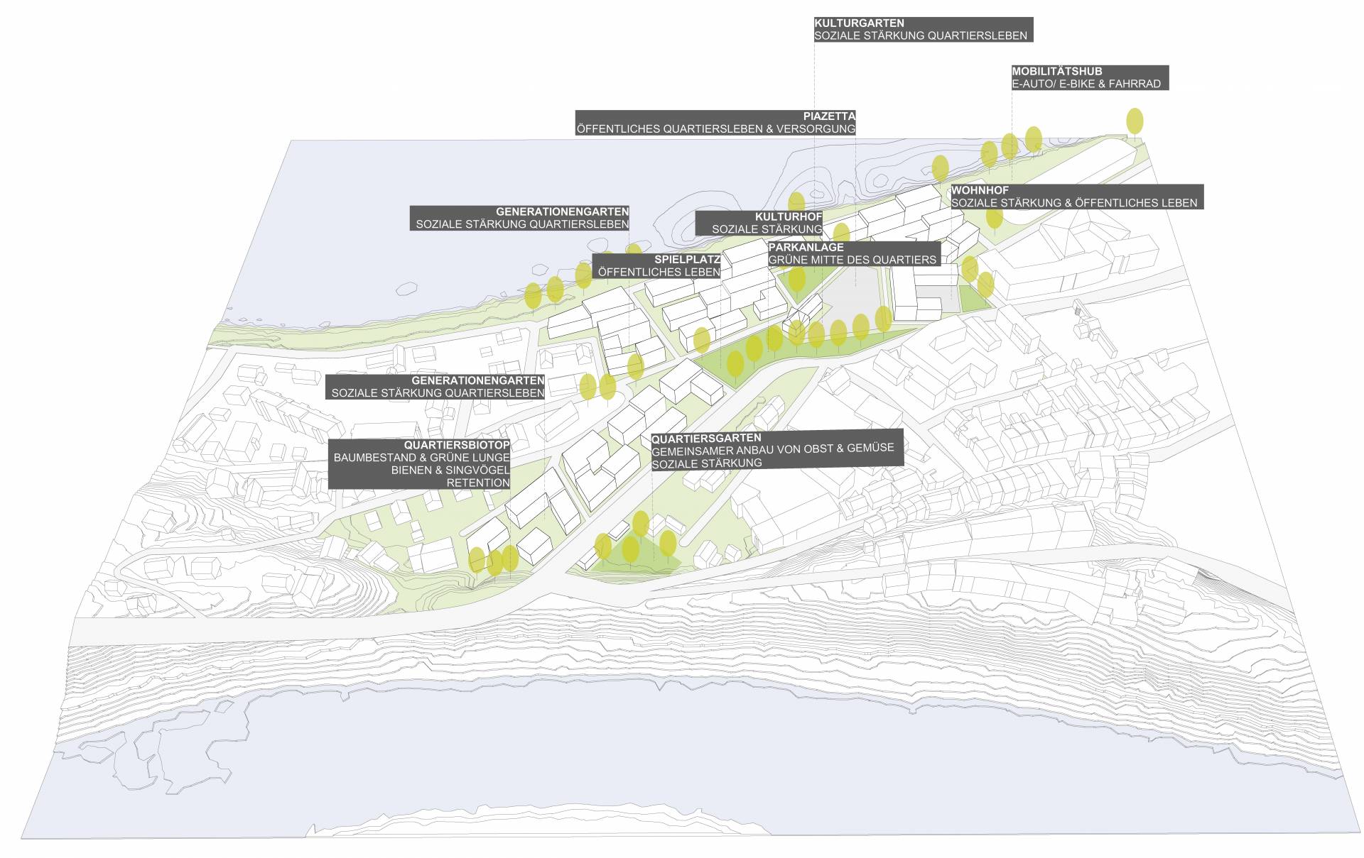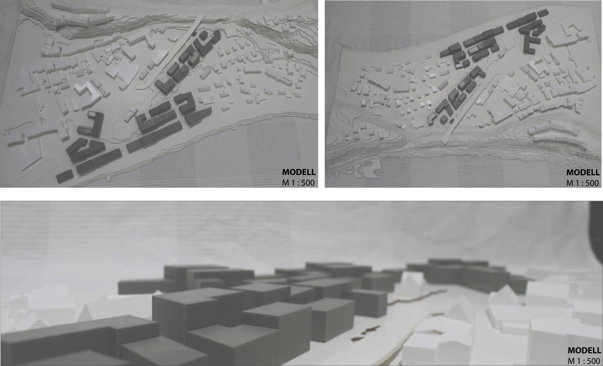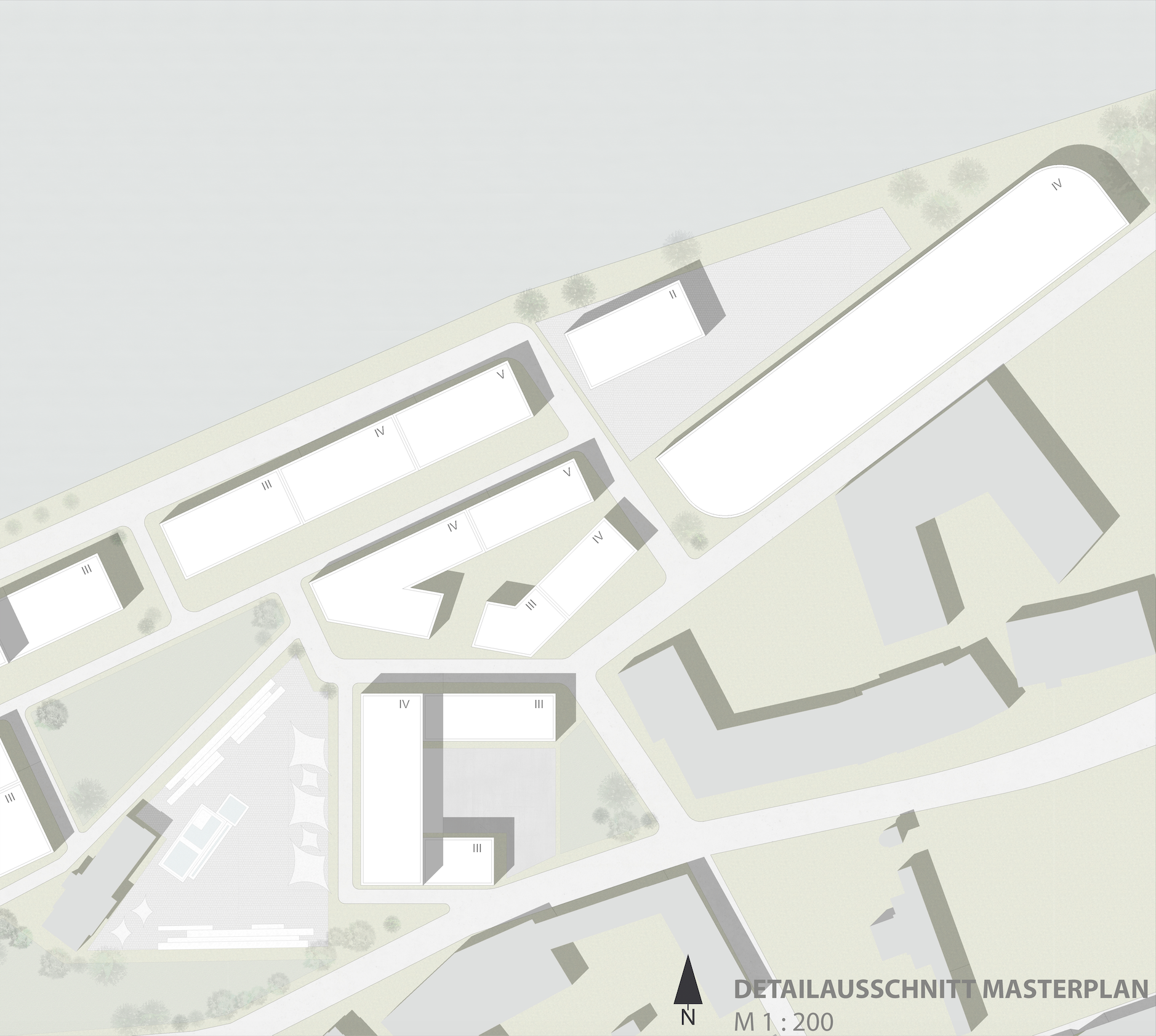 - Masterplan (M1:500), incl. Eintragung der Erschließung, der Flächen, des ruhenden Verkehrs, der Nutzungen, der Gebäudehöhen, der Dachform (Entwicklung von Quartieren mit Verkehrskonzept nach ökologischen und nachhaltigen Aspekten unter Berücksichtigung von angemessenen Quartiersplätzen sowie Feuchtraumgebieten)