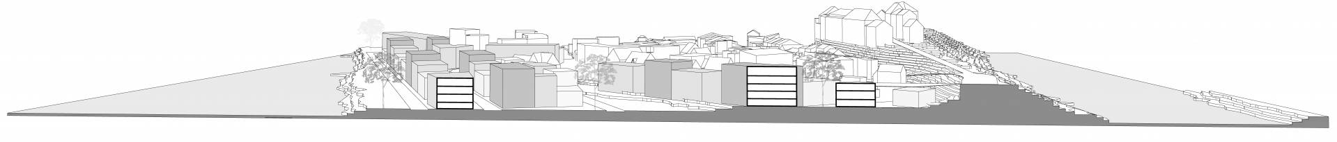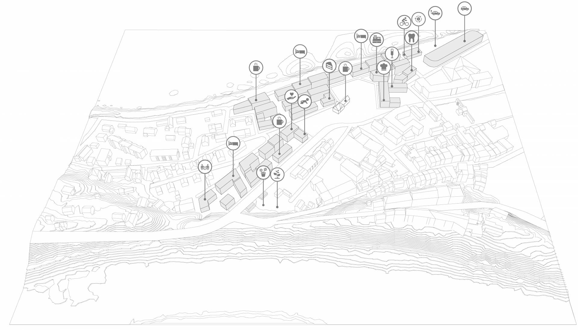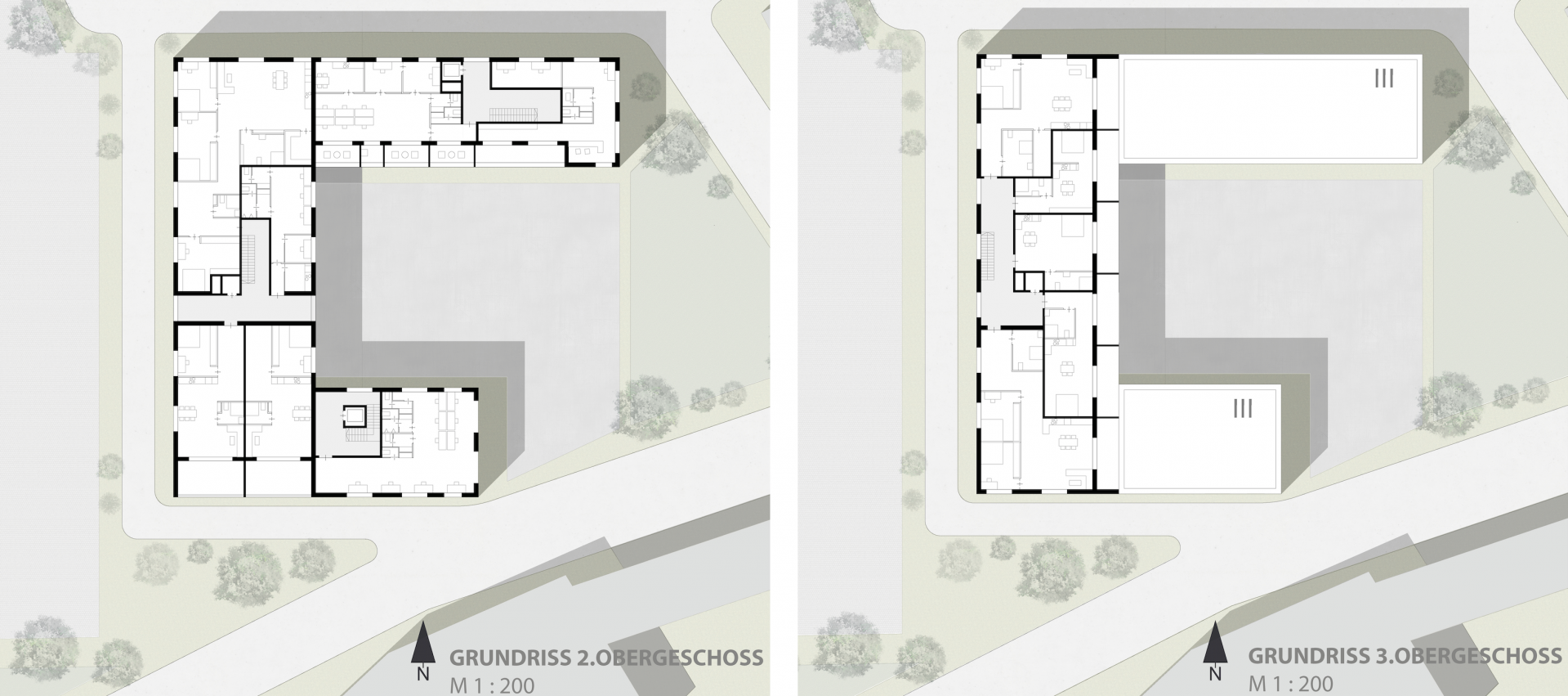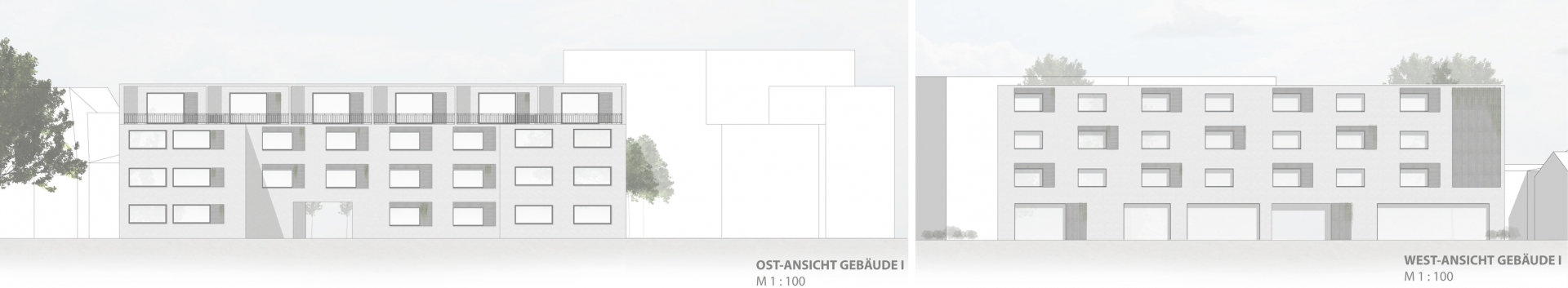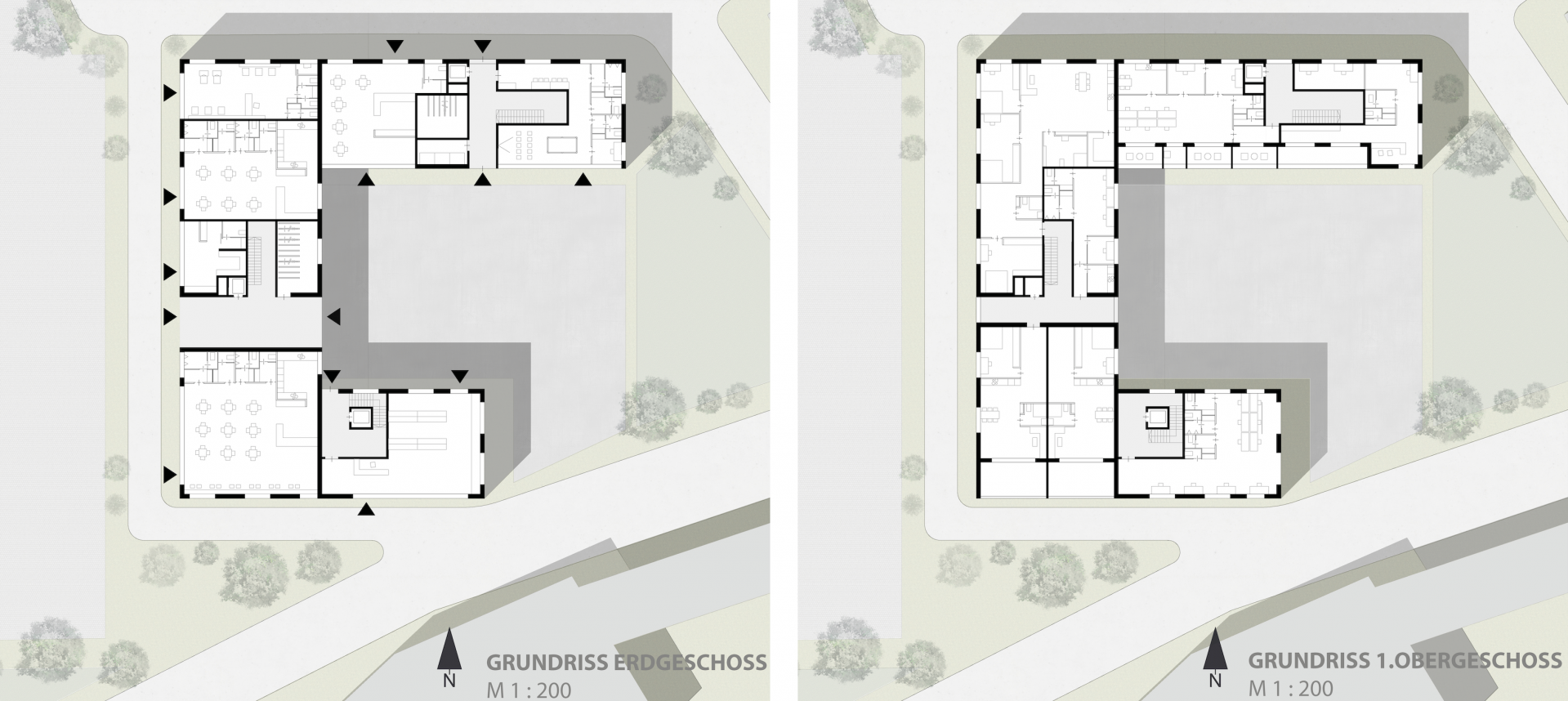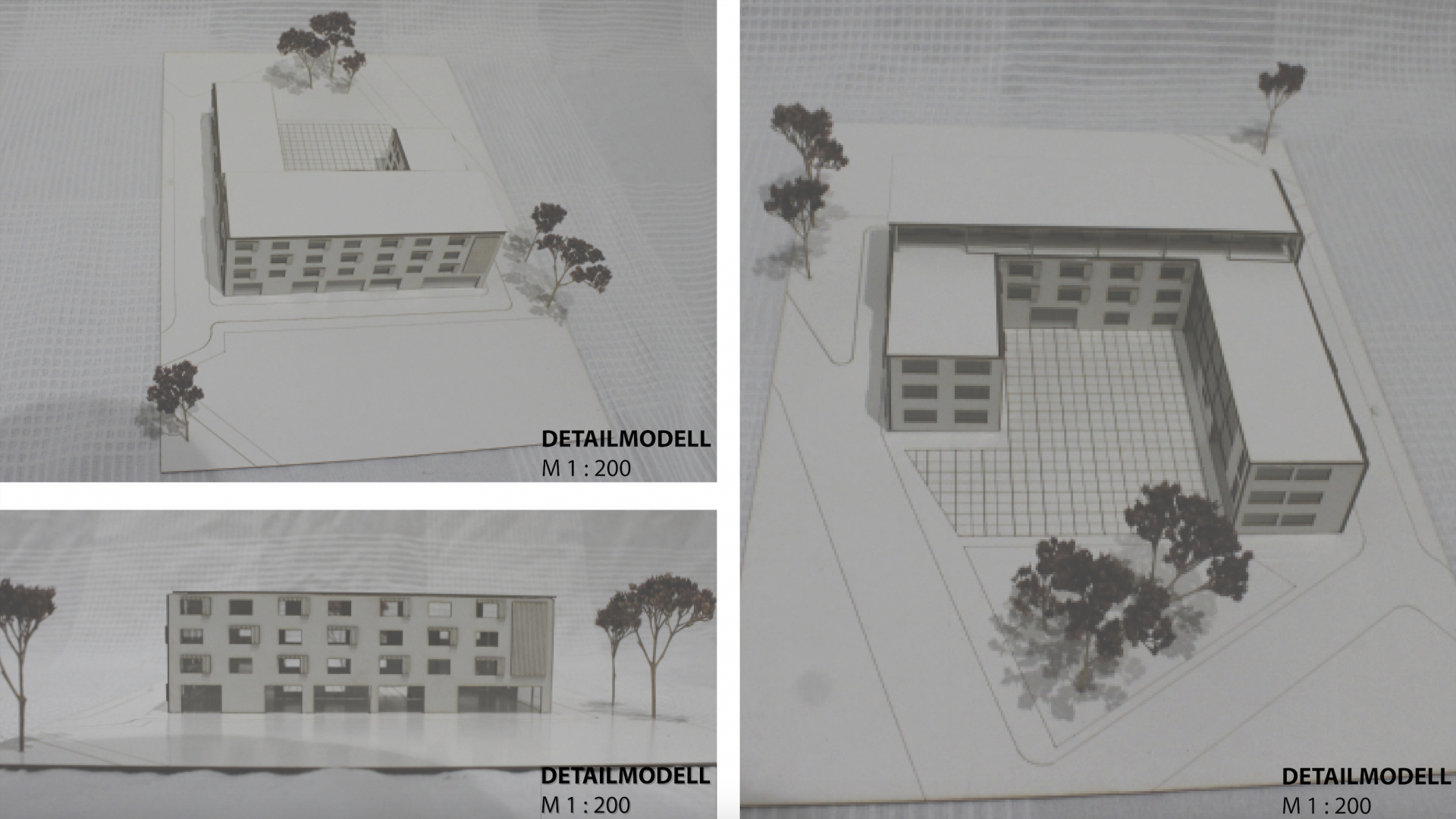 Bei dem Gebäude, welches sich zentral in dem überarbeiteten Gebiet und direkt an dem großen öffentlichen Platz befindet, handelt es sich ebenfalls um eine Nutzungsmischung. Im Erdgeschoss wurde, direkt auf der Platzseite, eine Gastronomienutzung vorgesehen. Der kleinere der beiden Schenkel bietet im Erdgeschoss die Möglichkeit der öffentlichen Versorgung und sollte demnach mit einem kleinen regionalen Lebensmittelladen versehen werden. Bedingt durch die zentrale Lage und die Anbindung an die große Freianlage wurde in diesem Gebäude ebenfalls eine gemeinschaftliche Nutzung zur Stärkung des Quartierslebens vorgesehen. Dieser Bereich soll den Bewohnern die Möglichkeit für gemeinsame Veranstaltungen sowie Spiele und Freizeitbeschäftigungen bieten. In jedem Gebäude wurde ebenfalls auf Stellplätze für Fahrräder für die Bewohner und Arbeiter der Büros vorgesehen. Durch die Möglichkeit sein Fahrrad oder E-Bike an einem sicheren überdachten Ort abstellen zu können, sollen die Bewohner dazu angeregt werden mehr Wert auf das Fahrrad, statt auf den PKW zu legen.