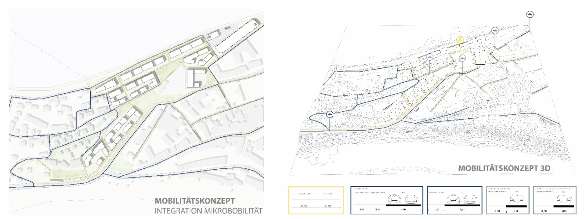 Mobilität ist in Wasserburg am Inn ein wichtiger Aspekt, welcher einer Umplanung und Umstrukturierung bedürfen. Aufgrund des hohen Verkehrsaufkommens wurde in dem Entwurf ein großer Aspekt auf die Reduzierung des momentan herrschenden PKW-Aufkommens gelegt. Bedingt durch den Leitgedanken wird möglichst viel der momentanen Bestandsituation zu erhalten, wurde bei dem Mobilitätsnetz darauf geachtet möglichst viele Bestandstraßen in das überplante Mobilitätsnetz einzubinden. Demnach wurde die Rampe des Areals erhalten, jedoch wurde der Kreisverkehr in zentraler Lage entfernt. Die Stadt Wasserburg erhält durch die Altstadterweiterung ein sehr gut ausgebautes Mikromobilitätsnetz, welches die Bewohner dazu verleiten soll Ihre Erledigungen, die Arbeit oder Freizeitaktivitäten mittels des Fahrrades aufzusuchen. Ebenfalls wurde bereits von der Stadt Wasserburg am Inn über die Errichtung einer Seilbahnstation nachgedacht. Dieser Gedanke findet sich in diesem Entwurf des Mobilitätsnetzes ebenfalls wieder. Die Besucher sowie Bewohner sollen demnach das Angebot der Seilbahn wahrnehmen und sich anschließend mittels eines Fahrradverleihs in der Altstadt fortbewegen können. Bei dem Mobilitätskonzept wurden ebenfalls Straßen vorgesehen, welche als Einbahnstraßen ausgeführt werden, um den Weg mit dem PKW deutlich länger zu gestalten, dies soll bewirken das die Bewohner und Besucher mehr Interesse an dem schnelleren und besser ausgebauten Mikromobilitätsnetzes bekommen und dieses intensiver nutzen. Ebenfalls wurde auf dem Mobilitätshub ein Fahrradparkaus errichtet. Der Mobilitätshub soll auch Elektro-Ladestationen sowohl für Elektro-Autos als auch für Elektro-Bikes aufweisen. Die Nutzung der Fahrradgarage soll für die Bewohner und Besucher kostenlos zur Verfügung stehen und über einen Fahrradverleih verfügen.