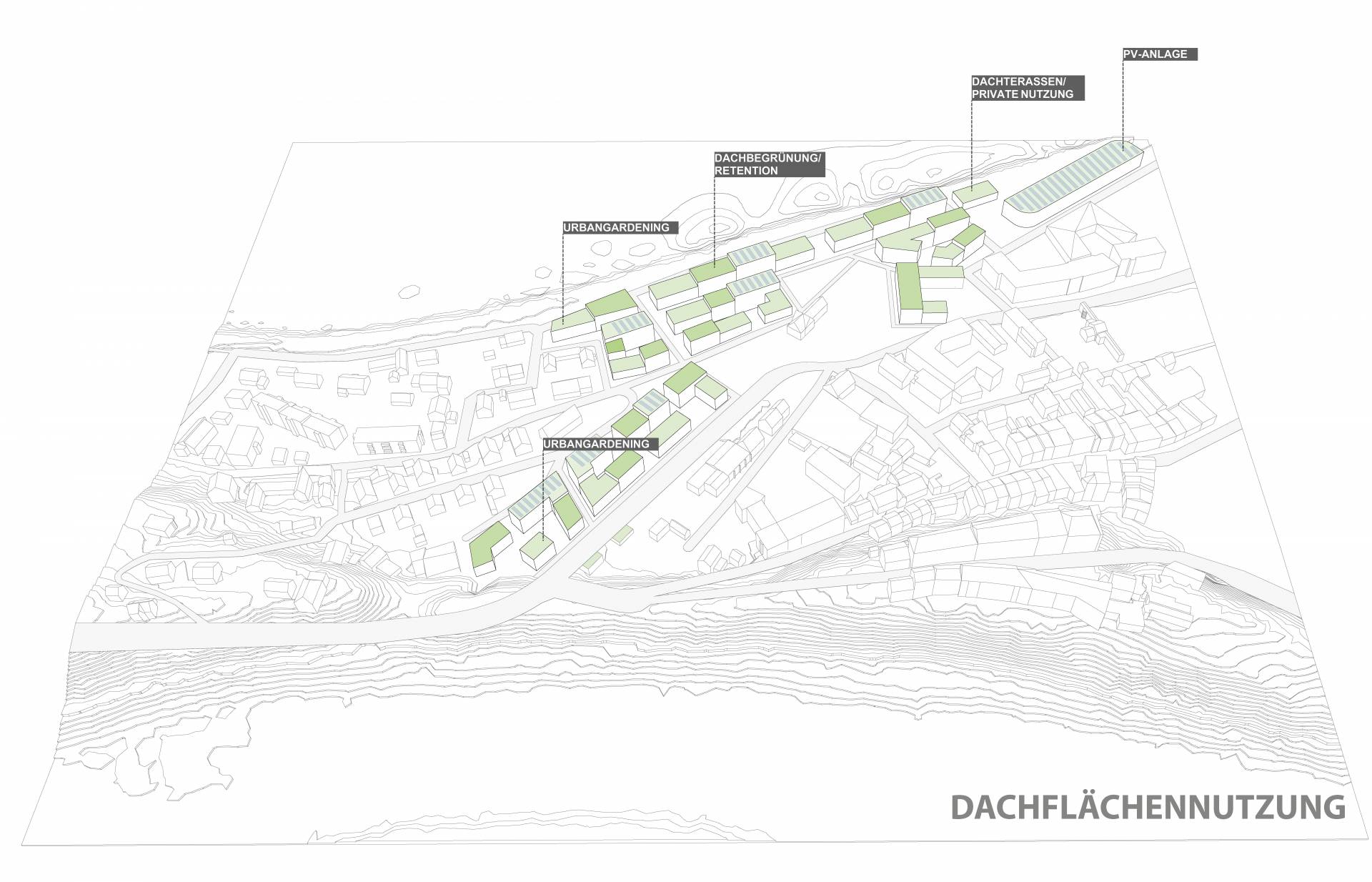 Für die Dachflächen der neuen Gebäudekomplexe ist sowohl eine Dachbegrünung als auch die Platzierung von PV-Anlagen vorgesehen. Ebenfalls sollen einige der Dachflächen von den Bewohnern als Dachterrassen und für Urbangardening herangezogen werden. Um die Gemeinschaft zu Stärken und das Quartiersleben zu vereinen, sollen einige Dachflächen wie bereits erwähnt Urbangardening als Nutzung aufweisen. Hochbeeten sollen auf den Dächern der Gebäude Kräuter und Gemüsebeete entstehen, welche anschließend zur kleinen Selbstversorgung dienen sollen. Der Kontakt der Bewohner von der Stadt Wasserburg am Inn zu Ihrer Natur soll demnach weiter ausgebaut und geprägt werden. Diese Planung soll an das bereits in der Stadt vorhandene Programm „Essbare Stadt“ anknüpfen und den Anbau von Gemüse und Obst in Gemeinschaft weiter fördern. Ebenfalls wird mittels Versickerungsmulden an den Straßen Regenwasser gewonnen, welches durch vorgesehene Speicher (unterirdisch über das gesamte Gebiet verteilt) gesammelt werden kann. Das gewonnene Regenwasser wird anschließend mittels der Speicher zur Nutzung der Gebäude herangezogen (Toilettenspülung). Ebenfalls soll das Regenwasser zur Bewässerung der öffentlichen als auch privaten Grünflächen des Areals herangezogen werden können.