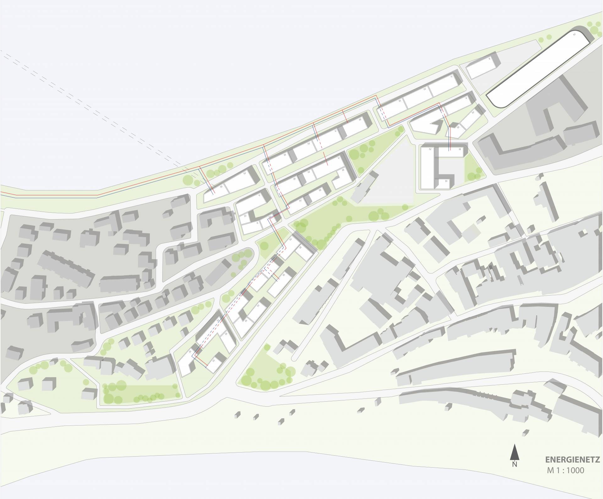 Bei der Planung der neuen Quartiere wurde die Energieverteilung mittels eines Wärmenetzes herangezogen. Durch eine gemeinschaftliche Wärmeversorgung können demnach Ressourcen und Energie gespart werden. Durch die Vermeidung einzelner privater Heizanlagen soll das Wärmenetz im Allgemeinen energieeffizienter arbeiten können. Zur Energieerzeugung wurde ein Blockheizkraftwerk mit Hackschnitzeln und einem ORC-Prozess gewählt. Der Organic-Rankine-Cycle-Prozess (ORC-Prozess) basiert auf dem Dampfkraftprozess zur Stromerzeugung unterscheidet sich jedoch bei dem verwendeten Arbeitsfluid, welches ein organisches Fluid statt Wasser ist.