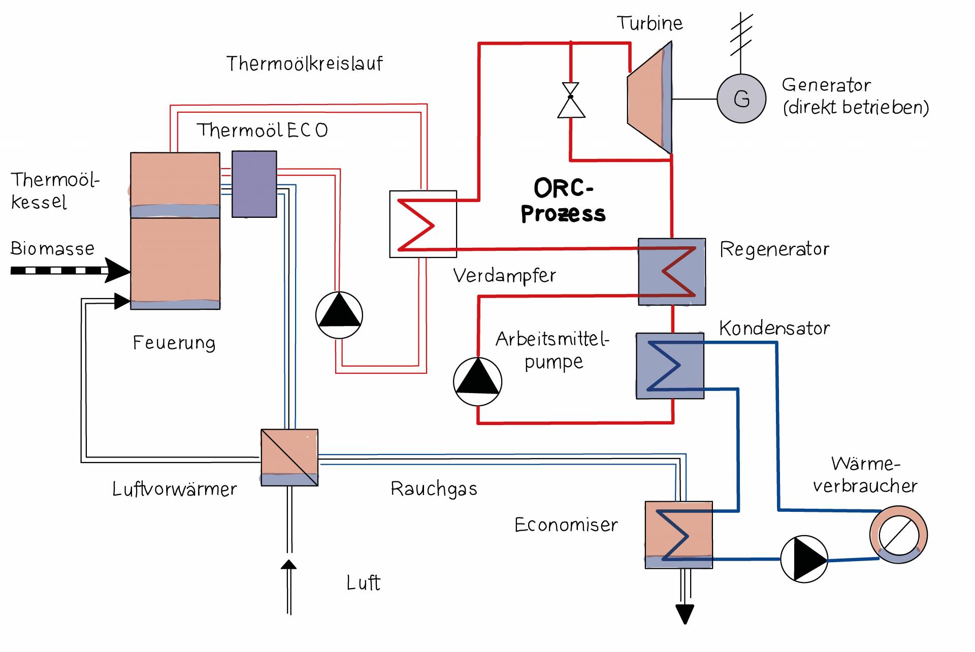 In dem Wärmeübertrager wird das Arbeitsfluid (Thermoöl) des Zwischenkreislaufes erhitzt und verdampft. Im Anschluss erfolgt die Expansion des Dampfes in der vorgesehenen Turbine. Im Regenerator wird durch Abkühlung des Dampfes und dessen abgegebene Wärme eine Vorwärmung des Arbeitsfluids erzeugt. Der Kondensator führt zu einem weiteren Abkühlen des Dampfes und anschließend zur Kondensation. Mittels einer Pumpe wird der Druck im Arbeitsmittel wieder erhöht. Über den Regenerator wird das Arbeitsfluid vorgewärmt und anschließend im Verdampfer wieder verdampft und überhitz. Mittels des nötigen Kühlwassers steht zudem weitere Fernwärme zur Verfügung. Hierbei wird mit 70 °C Wasser gekühlt und auf 90 °C erwärmt, wodurch die abgeführte Kondensationswärme nicht an die Umgebung abgegeben wird, sondern ebenfalls einen weiteren Nutzen erfüllt. Dies erhöht den Gesamtwirkungsgrad der ORC-Anlage.